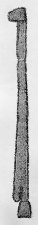 Tillverkningsort: sannolikt Paris Mått: långa delens längd 1000 mm den korta (dekorerade) delen 270 mm bredaste partiet (över kronan med frans) 105 mm de två "hylsorna" för värjan 120 mm höga Material: läder foder; sammet, klarröd Gehänget är helt täckt med guldbroderi och kantas av en drejad kavelfrans i guld och silver. Fransens bredd 18 mm Det yttäckande broderiet är utfört på en botten av gråvit taft (som är ytterst svår att urskilja). I motiven kan man urskilja en öppen krona (c 55 mm bred och 25 mm hög) med kronring vars "stenar" är utförda av silverlan. Krona är broderad strax ovanför platsen där gehänget delar sig, dels på de båda "hylsorna" samt på den smala, korta delen där bandets hela bredd endast är 37 mm. Ur kronorna "sprutar" ett plymliknande krön. Denna komposition omramas av en slags lövkartusch, där löven böjer sig inåt. Motiven i övrigt består av stiliserade blommor inom kartuscher. Broderiet är ett reliefbroderi i guld mot en botten av silver (kantiljer). Guldbroderiet är utfört av trind guldten, platta lan, tvinnade och krusiga guldtrådar.