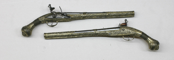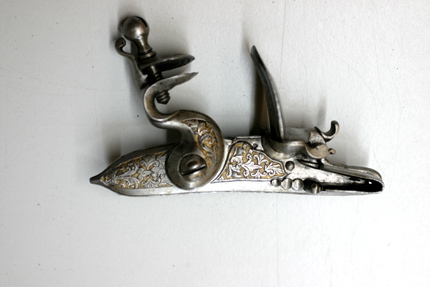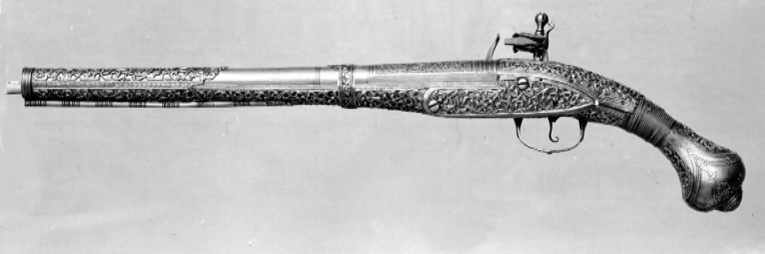 Rund slätborrad pipa av stål. Över kammaren graverade slingor i relief mot punsad, förgylld bakgrund. Något graverad dekor på svansskruvbladet. Flintlås med välvt låsbleck av fransk typ. Dekor i form av graverade slingor i relief mot punsad, förgylld bakgrund på låsbleck, hankropp och överkäke. Välvd hane. Rund fängpanna. Eldstål med åsad rygg och räfflad framsida. Avtryckare med inrullad ytterände. Stock av trä helt överklädd med genombruten förgylld silverplåt med bandornament. Päronformad kolvkula med rund, upphöjd centrumplatta. Framför kolvkulan är stocken lindad med tvinnad silver- och slät mässingstråd. Avgränsade lister på stocken i form av graverade ränder. På framstocken finns ett smalt, förgyllt genombrutet bälte av silver och ett bredare som täcker pipans mynningsdel. Framstockens främre del är avtagbar, på undersidan en rörka. Liten varbygel av förgyllt silver med graverad dekor. Tillbehör: Laddstock av silver med räfflad dekor i avgränsade partier.