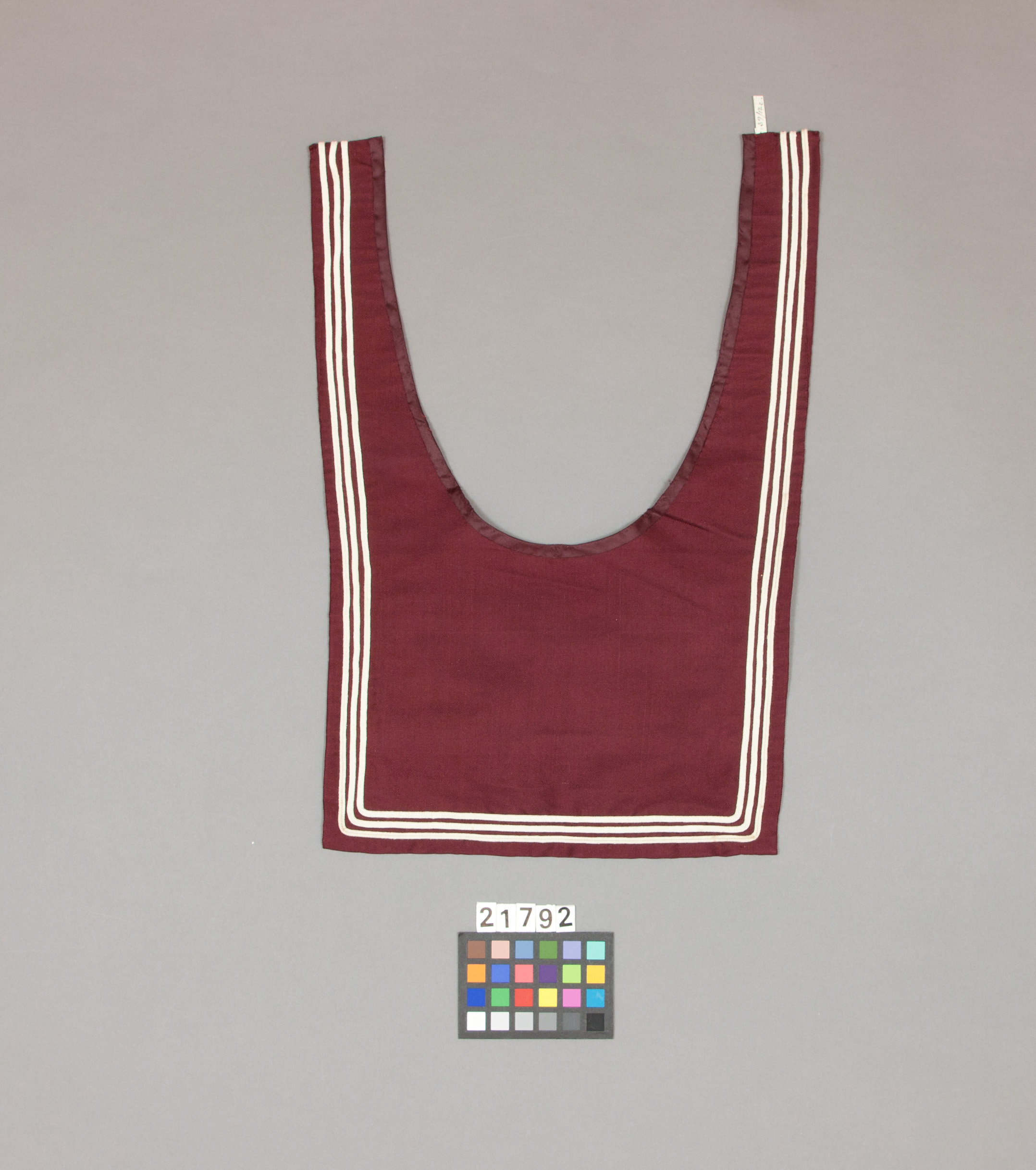 Sjömanskrage i mörkt vinrött kypertvävt siden. Längs med hela kragens kant sitter tre stycken vita bomullsband. Fodrade med vit sidentaft.