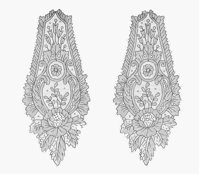 SNIBBAR, två stycken, point d´Angleterre Gulvita. Knypplade och sydda. Långsträckt päronformiga. Mönstret bestående av ett ovalt lyrformigt mittornament, i mitten tre kvistar med blad inom band-, blad- och kedjeomfattning, nedtill en stor ros med fem nedåt från denna vända genombrutna mångflikiga blad; upptill en fembladig blomma inom oval smal bandomfattning med tre uppåt från denna vända flikiga blad samt klockformiga blommor, vid sidorna en kantbård med tungliknande uddar. Kanten med gles pikotavslutning. Mått: Längd: omkring 17 cm.; bredd: omkring 7,5 cm. Inköpt av Johanna Kempe hos en spetshandlande i Wiesbaden eller München, mitten av Augusti - mitten av Oktober sannolikt under 1860-talets senare hälft.