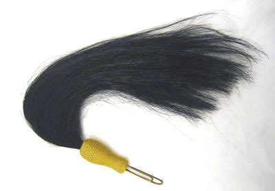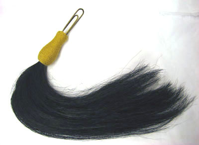 Plym av svart hästtagel, med fäste av gult snöre, hårt lindat i en kägelform över dubbel mässingstråd som slutar i två avlånga öglor i olika längd.