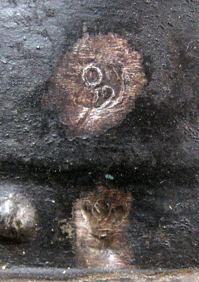 Av driven stålplåt. Utsidan målad svart med nederkant, kamkant och vinge ursprungligen guldgula, tydliga filspår. Insidan med slagmärken. Hjälm bestående av två halvor, sammanfogade i en längsmed klockan löpande kam, omvikt och förstärkt. Klockan rundad. Upptill på kammen är en senare (under 1700-talet) nitad dekoration i form av en trekantig något framåtsvängd vinge av bleckplåt, av två halvor fäst i kammen med två nitar. Nertill övergår klockan i ett brätte, något neddraget med invikt rundsmidd kant och försänkt bård med falska uppdrivna nitar. På klockan baktill en plymhållare, H 56 mm, nedåt avsmalnande med spetsigt tillklippt överkant, fäst med två nitar. I klockan nertill på var sida nitar i rad. I kanten där brättet möter klockan är en rad av små slagna hålpar hela vägen runtom. I klockan mitt på är ett liknande hålpar, ett på var sida kammen. I brättet baktill ett från insidan slaget hål. Framtill på höger sida två punsade stämplar. Hjälmfoder av grov lärft, hopsytt av två halvor. Under detta en stoppning av linblånor. Fodret är fastsnört i brättetts hålpar med linnetråd.