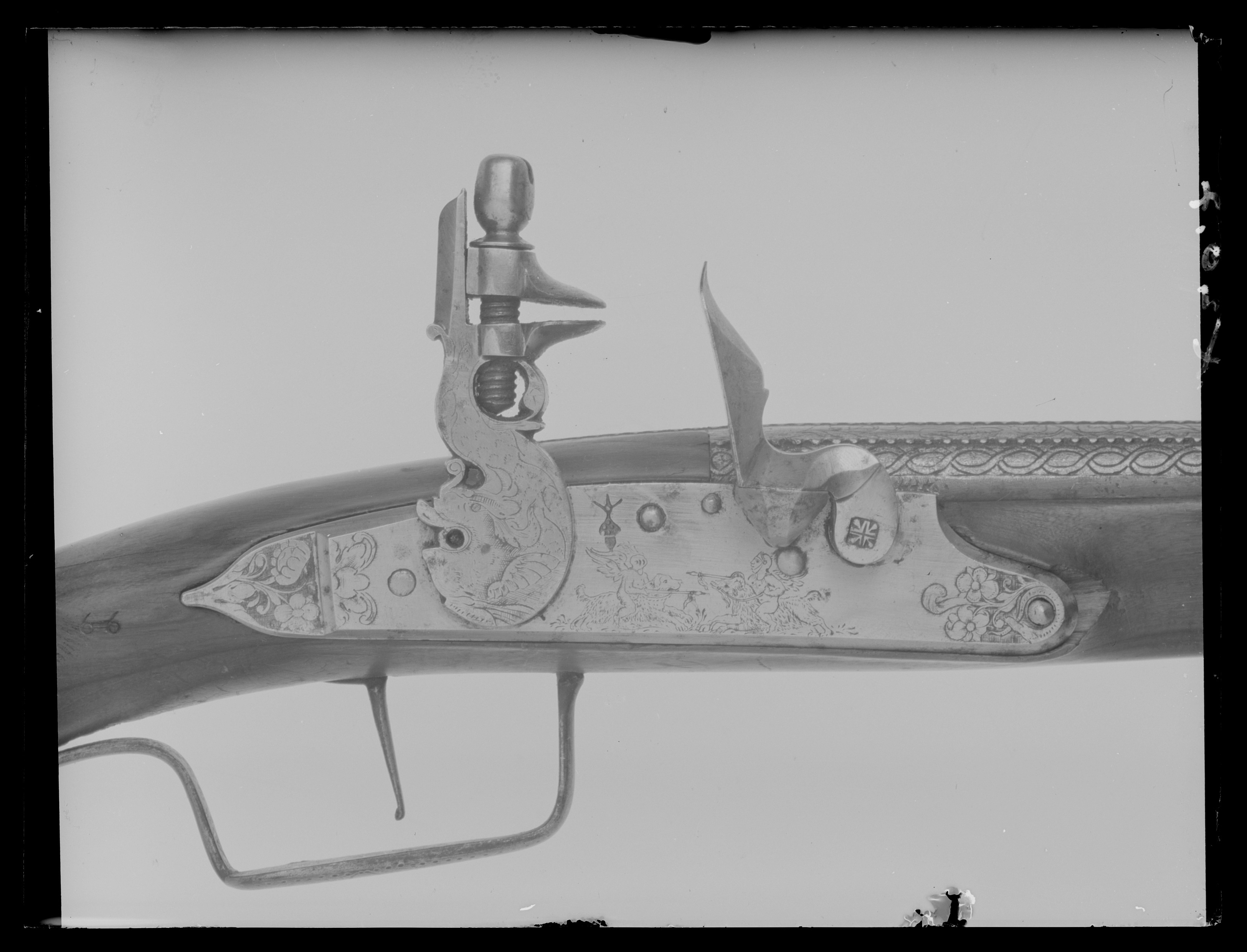 Rund slätborrad pipa av blånerat stål med vågig ås längs pipan, över kammaren ytterligare 2 åsar. Graverade blad över kammaren som är förgylld, pipans mynning förgylld och graverad. På pipans undersida stämplat "C. M. I. L." (se Stöckel 2260 Holland ca 1660 - ca 1685). Flintlås med låsbleck med försänkt bakre låsspets med graverade blommor. Plan graverad hane med lös överkäke. Fängpanna med fasad kant. Eldstålet har åsad rygg. Låsblecket har fasad kant, en graverad stridscen på blecket med en hund och en get med bevingade ryttare. En stämpel på låsblecket, i form av vindruvsklase eller ekollon. Brun helstock av jakaranda med kolvkula av stål i form av ett ciselerat manshuvud av stål med lagerkrans. 2 rörkor av graverat silver. Näsband av graverat silver. Varbygel av stål, rak med punsad dekor på bygeln. Tillbehör: Laddstock av trä med doppsko av silver. Märkt: 66 bakom låsblecket, stanstyp 5376.