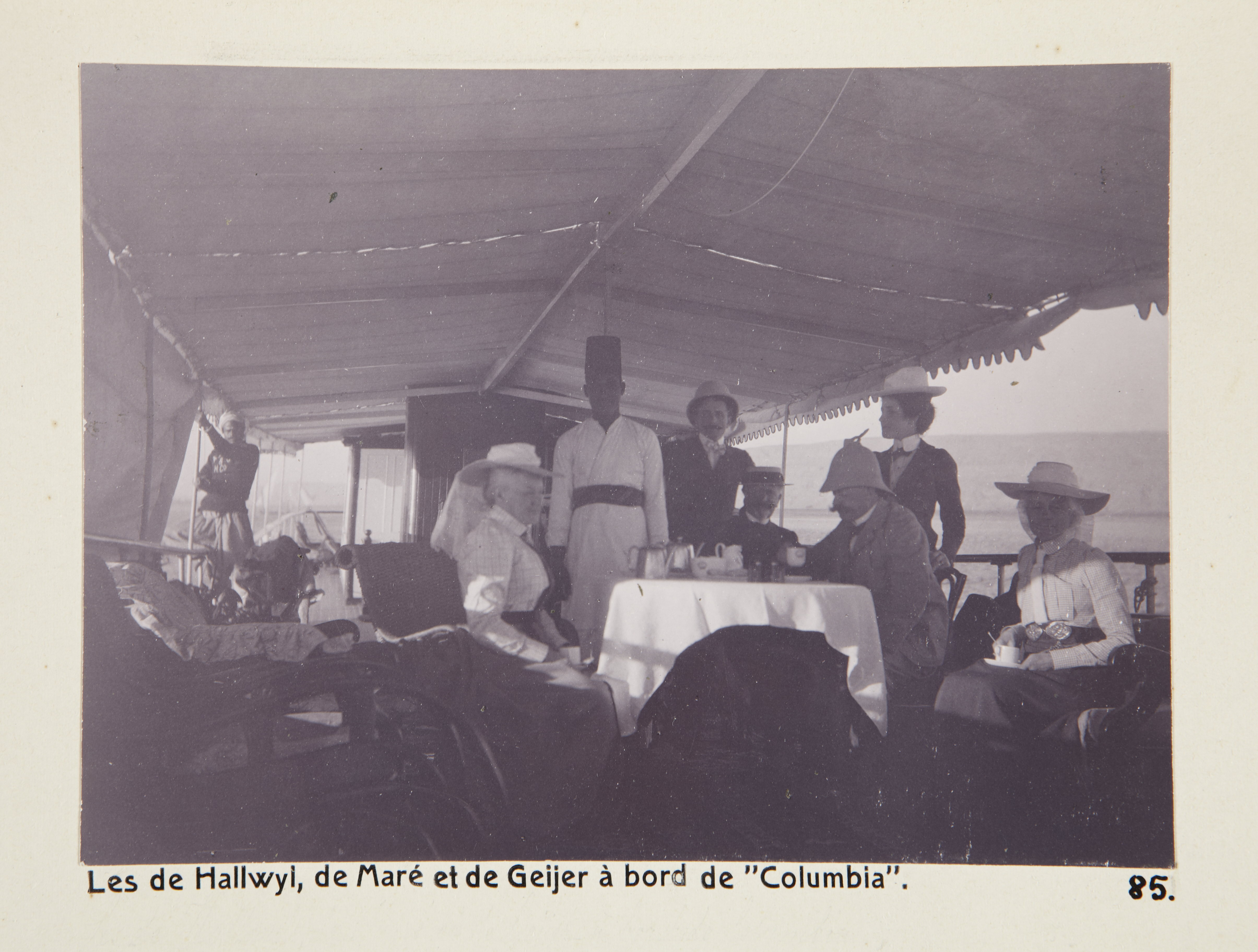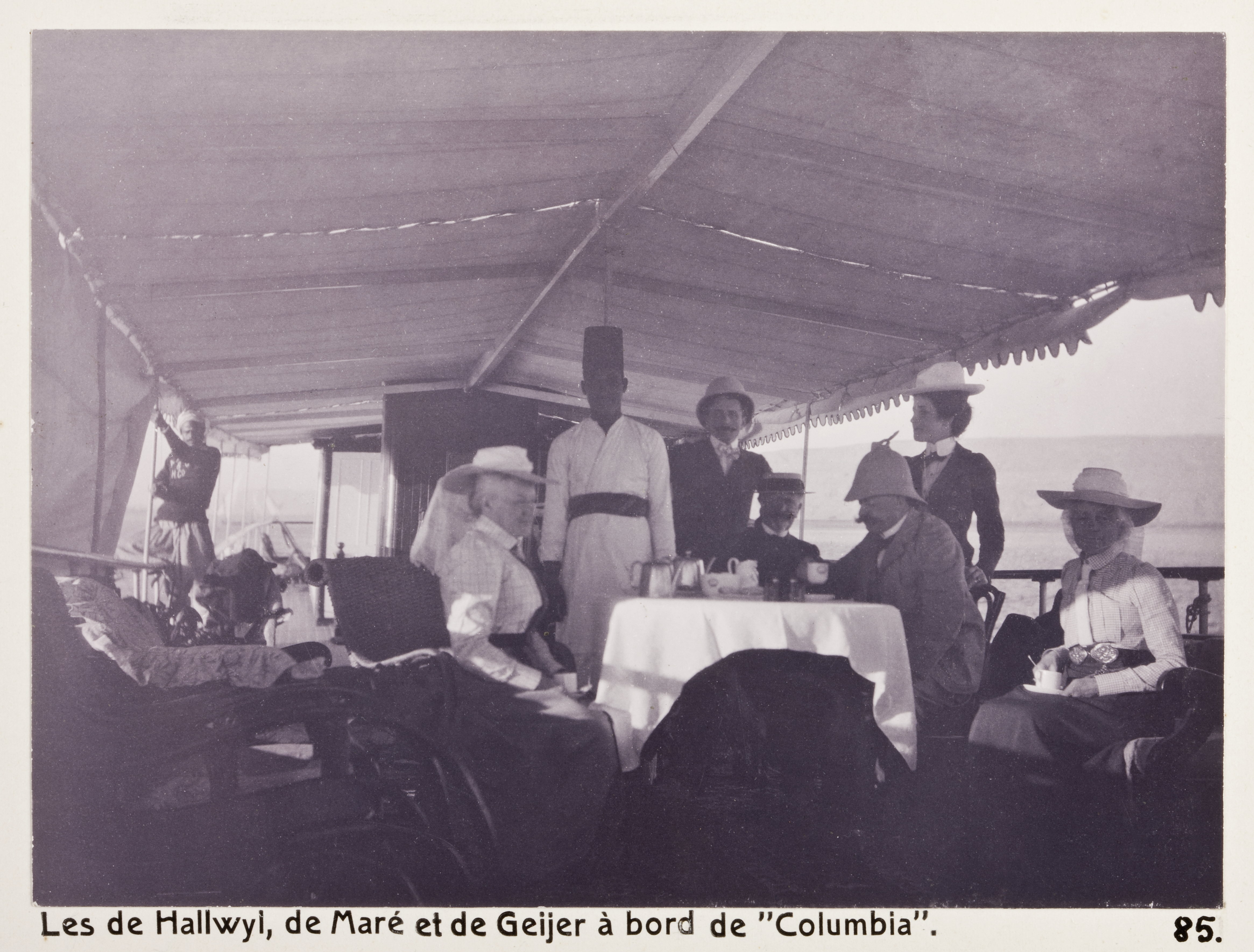 von Hallwyls, de Marés och von Geijers ombord på ångfartyget Columbia. Egypten. Text på fotografiet: Les de Hallwyl, de Maré et de Geijer à bord de "Columbia". Fotografierna LXVI:M.01.- 201. kommer från resan till Egypten och Sudan som Wilhelmina och Walther von Hallwyl gjorde vintern 1900-1901. De lämnade Sverige den 5 november 1900 och fortsatte från Egypten till Palestina den 28 mars 1901. Med på resan var döttrarna Ellen med maken Henric de Maré och Irma med maken Wilhelm von Geijer. Wilhelminas sällskapsdam, fröken Ida Uhse reste också med. Under en del av resan anslöt sig ledamoten av Internationella domstolen i Kairo, assessorn Otto Conrad Waldemar Cedercrantz med makan Anna Elisabeth. Vid resan uppför Nilen hade Walther von Hallwyl hyrt ångfartyget Columbia med besättning. Båtresan startade i Kairo 27 december 1900, gick ända till Wadi Halfa varifrån man reste vidare med tåg till Khartum och tillbaka till Wadi Halfa. Båten vände åter i riktning mot Kairo, men det verkar som att sällskapet tog tåg sista biten, från Luxor. Henric och Ellen de Maré samt fru Cedercrantz lämnade båten redan då de passerade Luxor första gången. Resten av sällskapet återvände till Kairo den 1 mars. Fotografierna LXVI:M.01.-120. togs av resenärerna själva, de största av Ellen de Maré, de mellersta av Wilhelmina von Hallwyl och de minsta av Wilhelm von Geijer. Resten köptes av professionella fotografer i Kairo, de flesta från Studio Photogr. Artistique G. Lekegian & Cie. Alla uppgifter kommer från Ida Uhses reseanteckningar.