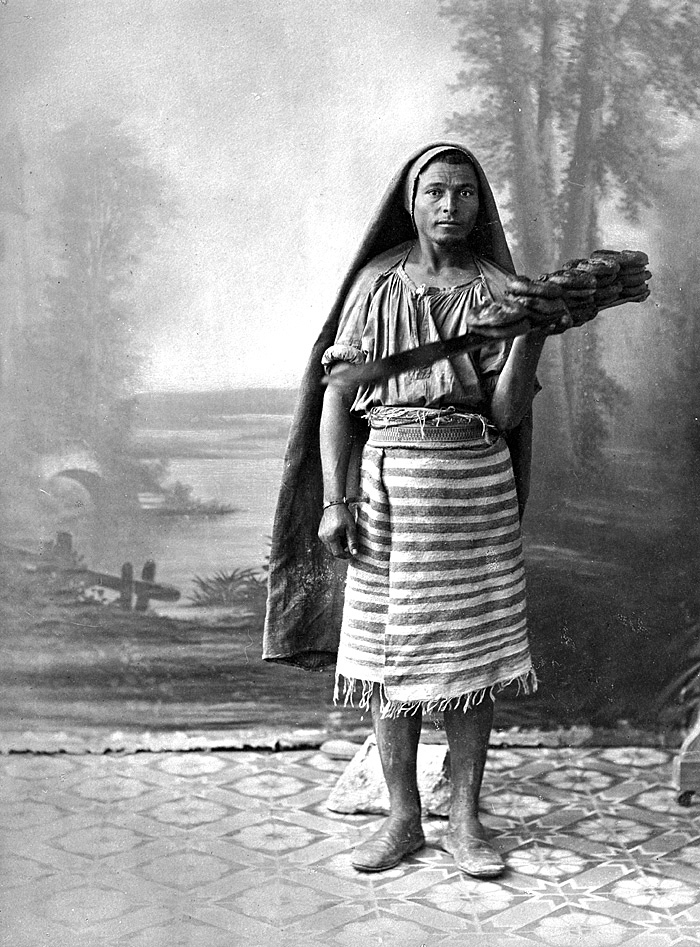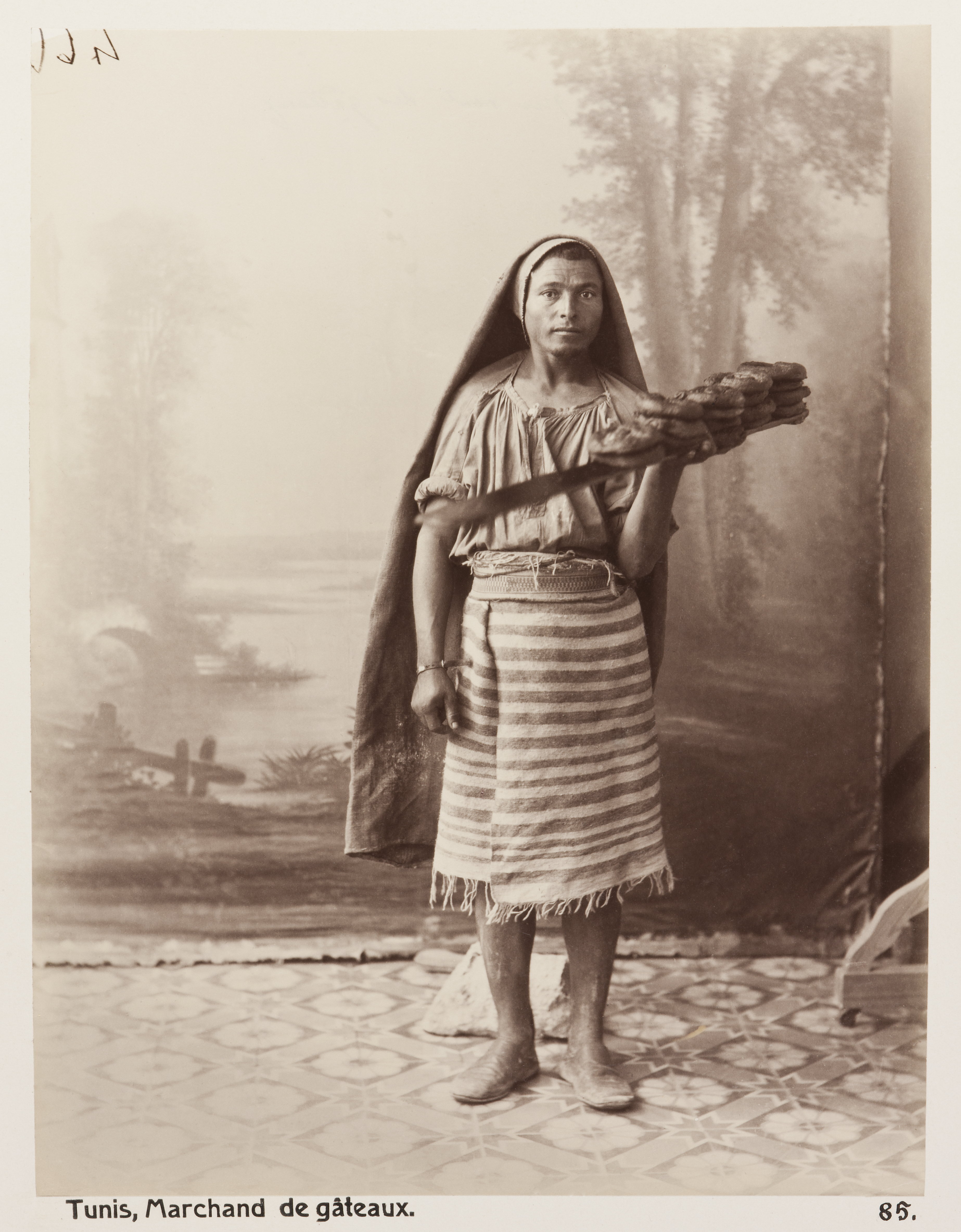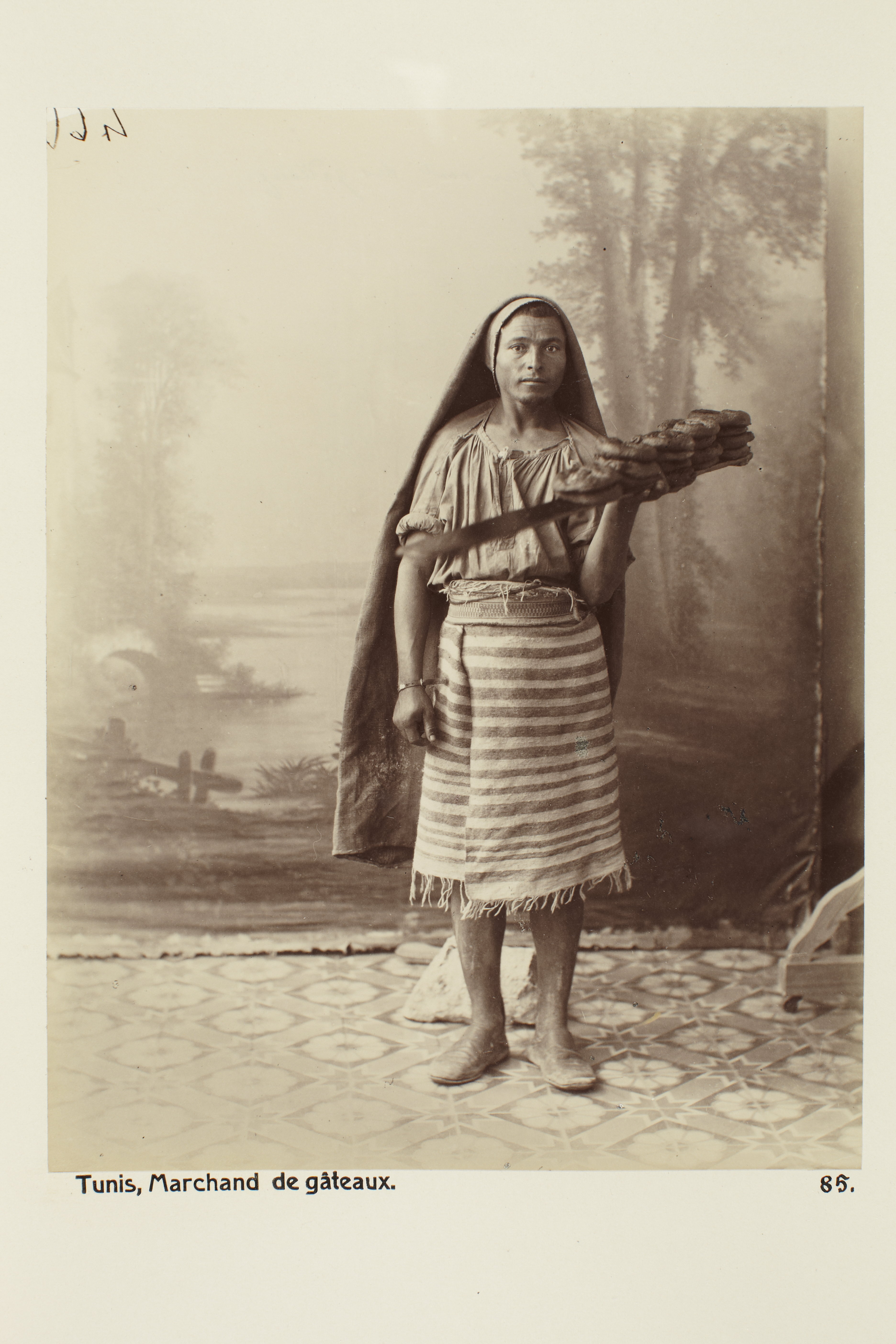 TUNIS, Tunisien. Kakförsäljare. Foto från resa genom Algeriet och Tunisien samt åter över Schweiz, 11 februari - 19 maj 1889. Samtliga foton i gruppen LXVI:F. är inköpta av Wilhelmina von Hallwyl i Alger, Biskra, Tunis, Constantine, Oran och Blidah vid hennes vistelse i nämnda städer tillsammans med sin make, Walther von Hallwyl, sin mor, Johanna Kempe, f. Wallis, dottern Irma samt fröknarna Caroline Pflaum och Ida Uhse. Uppgifterna kommer från fröken Ida Uhses reseanteckningar.