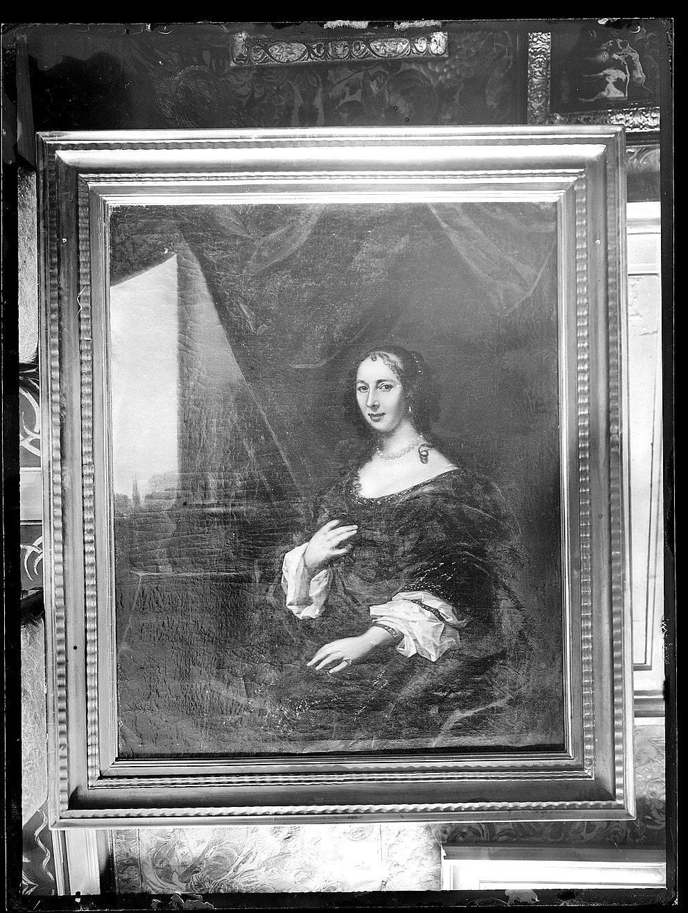 Knäbild, sittande. Fas vänster. Klänning av guldbrokad, svart mantel med bred guldstickad bård. Kilad spännram. Förgylld ram. Ramlistens bredd 155 mm. 1800- talslapp på dukens baksida: "Grefwinnan Anna Margareta von Haugwitz gift 1640 med Riksamiralen Grefve Carl Gustav Wrangel.".