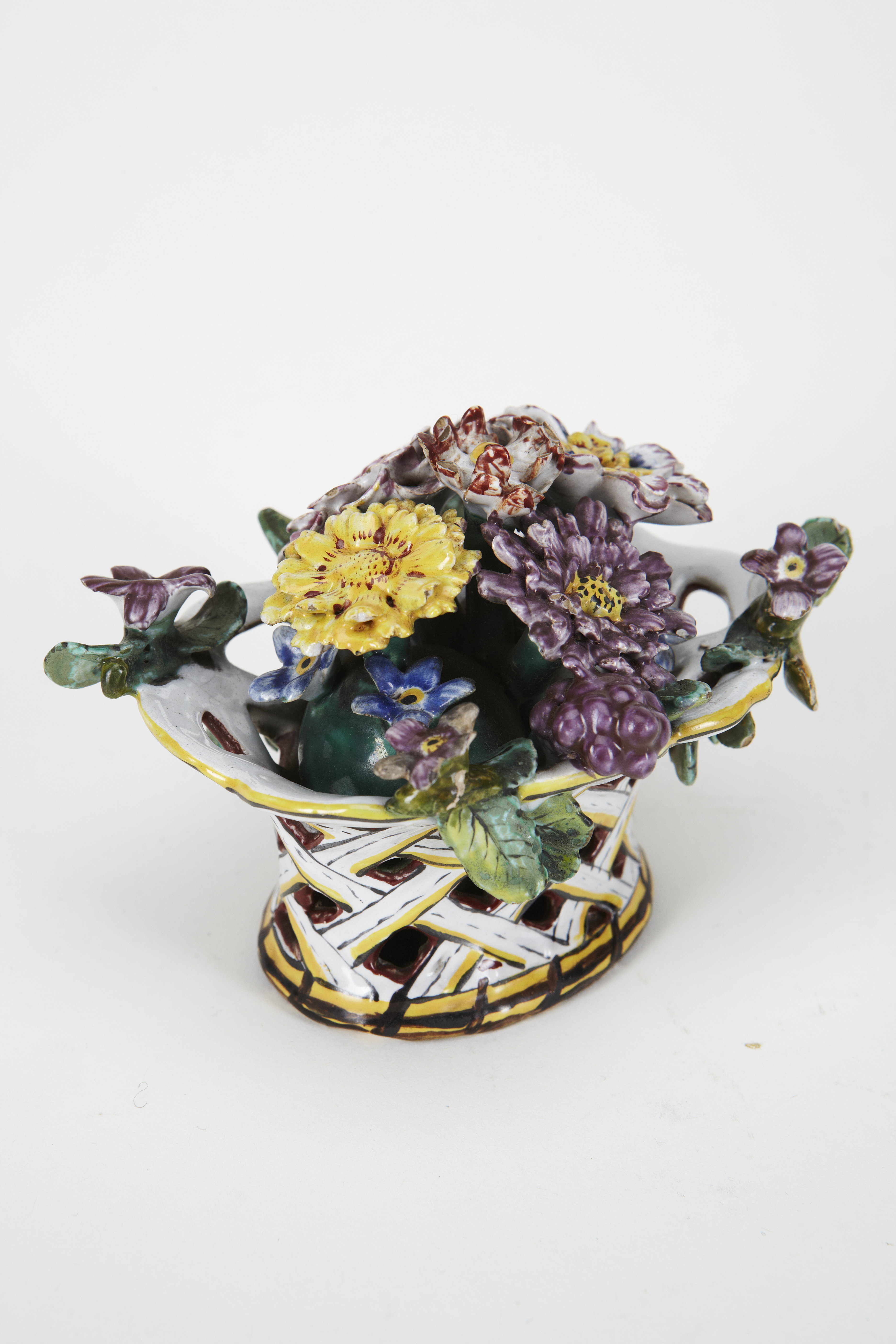 KORG med blommor. Oval med utsvängd överdel och insänkt botten; sidan genombruten i flätmönster, varigenom kanten blir runduddad. Korgen fylld med blommor i fri relief. Dekor: I muffelfärger på tennglasyr. Godset grågult. Skenorna på utsidan med kantränder i svart, utmed nedre kanten dessutom en rand i gult; foten bestående av två gula stavar med mörkbrunt mellanrum, dessa sammanbundna med en smal vidja i mörkbrunt. I mitten fyllda blommor i gult, gredelint och rödgredelint, dessutom en med sju dubbla kronblad i vitt, blått och rödgredelint samt mitt i gult och något brunt; vid korgens ena långsida en över kanten utskjutande druvklase i gredelint; vid vardera ändan av korgen två motsatta enkla blommor med gredelina kronblad och gul mitt, innanför dessa liknande blommor, dessa dock med kronblad i blått. På bottnens utsida en märkning i mörkt brungredelint samt målarens signering i gult. Höjd 7,7 cm, längd 9,3 cm, bredd 8 cm