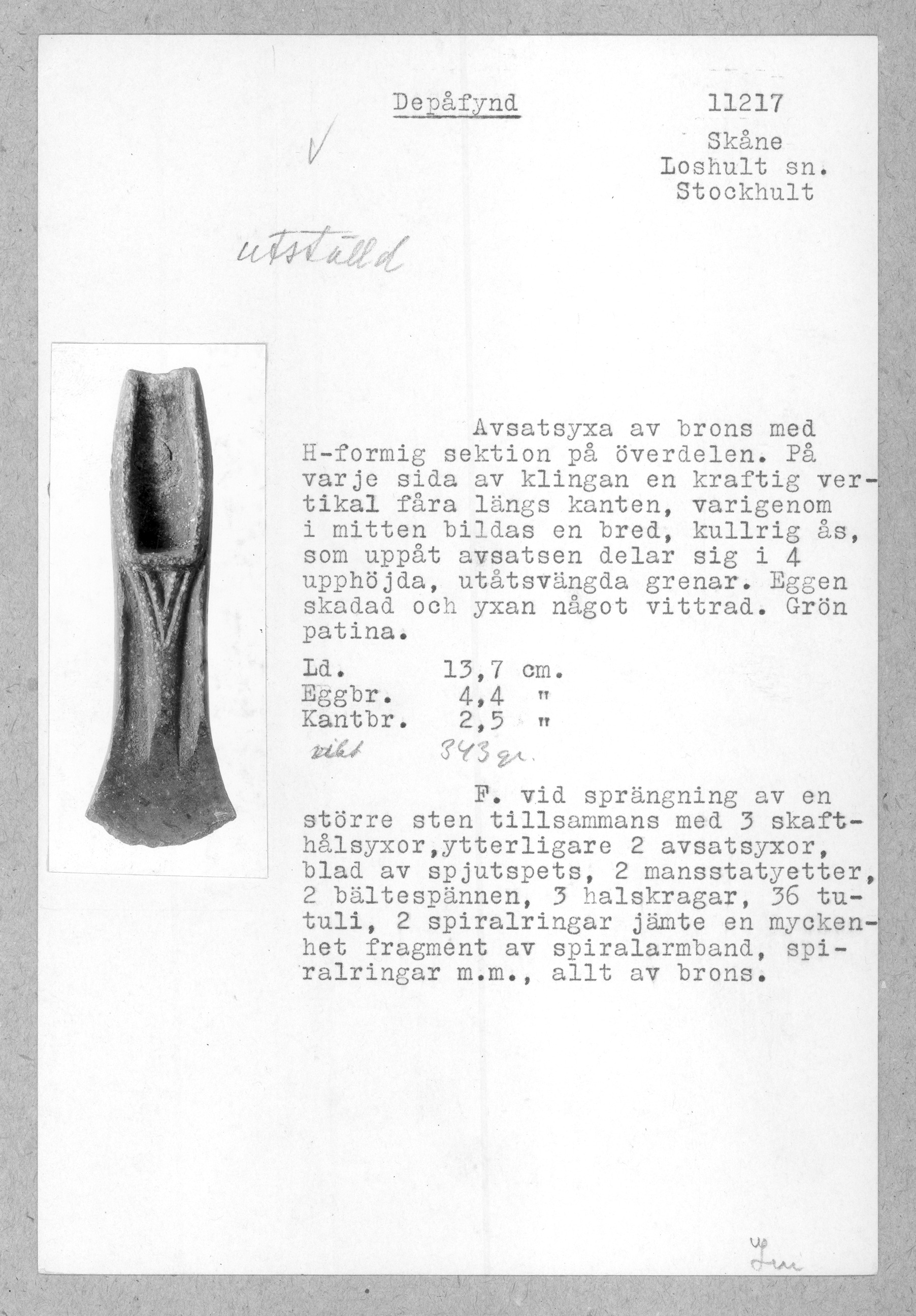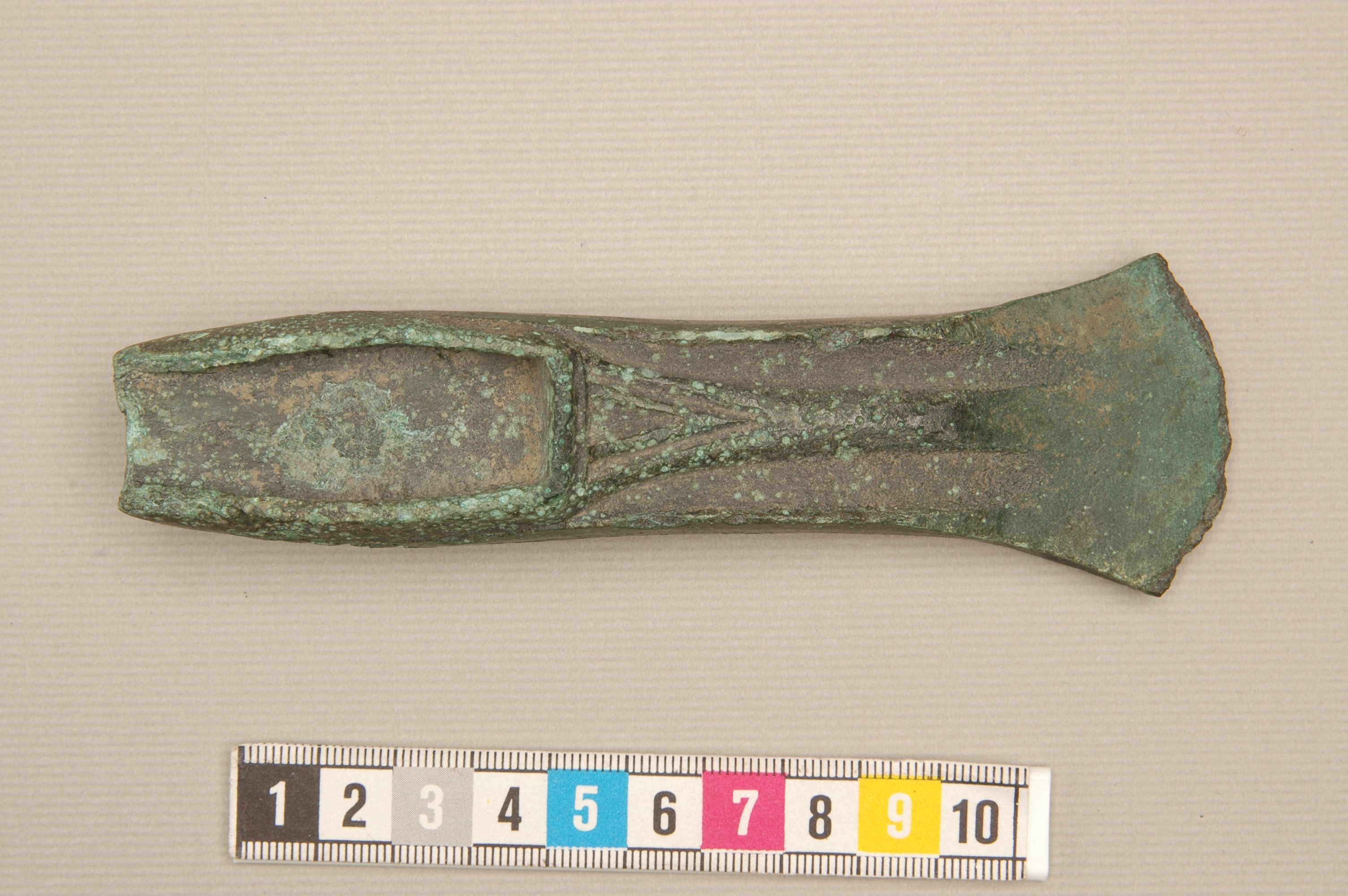 Avsatsyxa av brons med H-formig sektion på överdelen. På varje sida av klingan en kraftig vertikal fåra längs kanten, varigenom i mitten bildas en bred, kullrig ås, som uppåt avsatsen delar sig i fyra upphöjda, utåtsvängda grenar. Eggen är skadad och yxan är något vittrad. Med Y-formad dekor på övre delen av eggen