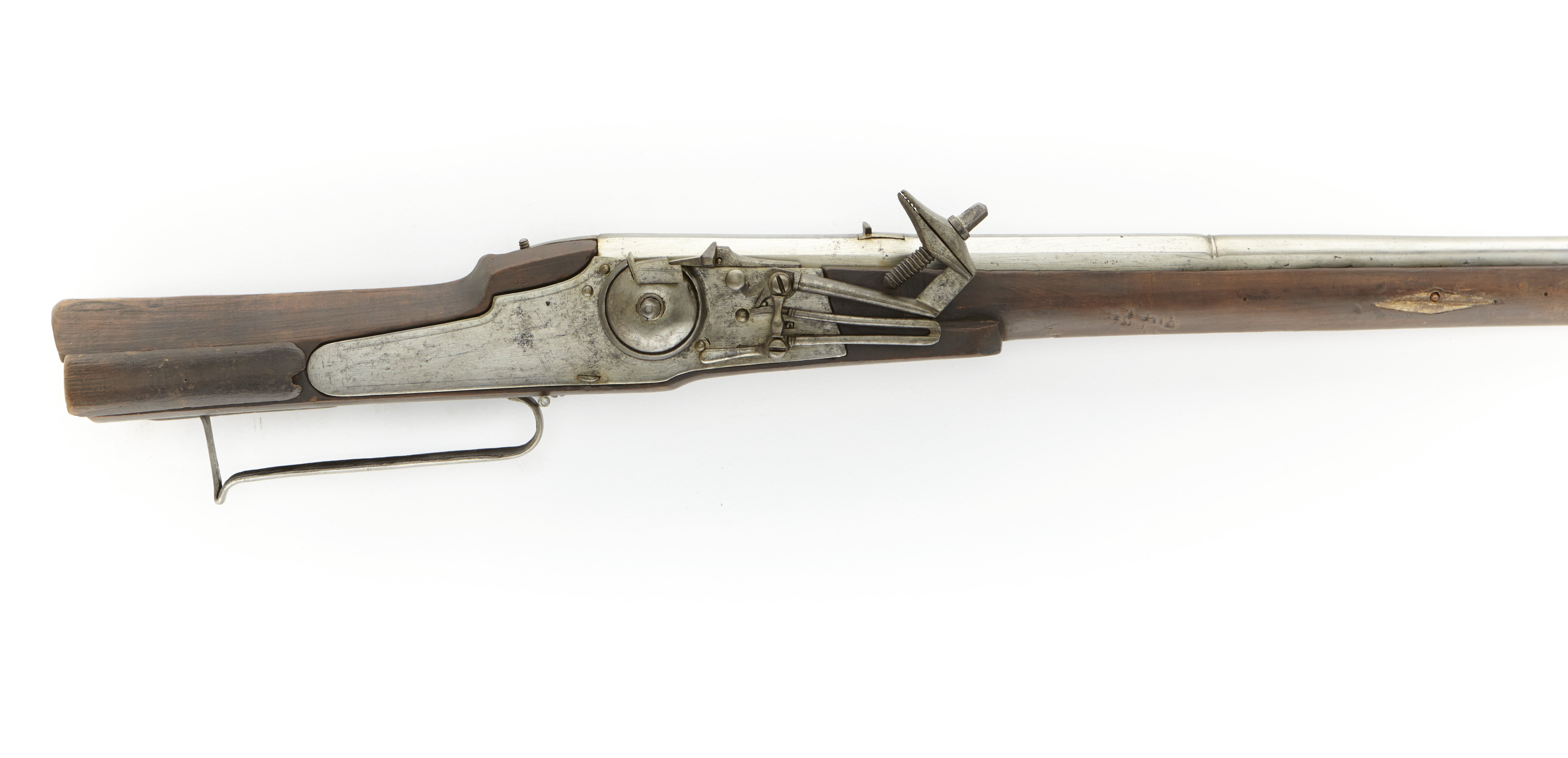 Rund, över kammaren åttkantig, slätborrad pipa av stål. Ståndsikte av stål, förstärkt mynning på pipan. Stolpkorn av koppar. Två häften. Hjullås med plant låsbleck av stål, tysk typ, bakåt avsmalnandegenom två fall. Hjul täckt av välvd hjulkapsel. Låg krutskärm. Rund tryckknapp. Hane med lös underkäke. Brun helstock av trä med smal kolv av tysk typ. Kolvlåda med lock av trä. Tre kantig låsbricka av horn. Utdraget rombiska pipstifts- brickor. Täckt laddstocksränna. Näsband av stål. Trågformig varbygel av stål, holsteinsk typ. Utan tillbehör. Märkt: 338 ovanför låsblecket, stanstyp 5376. 1710 års inventarium p. 7, rum I: "118-338-1 Stoort Hagelbyssa med Hiullååss----"