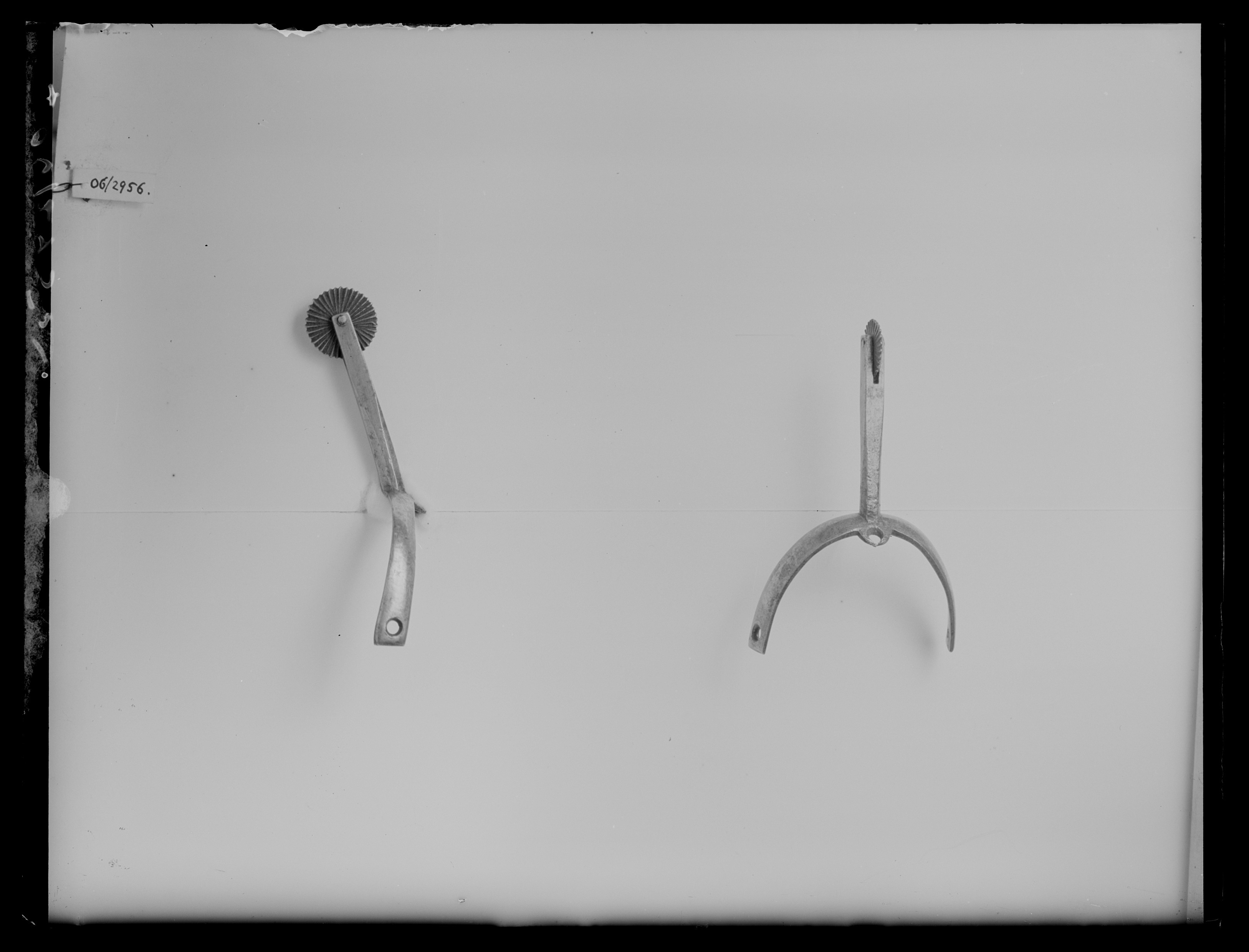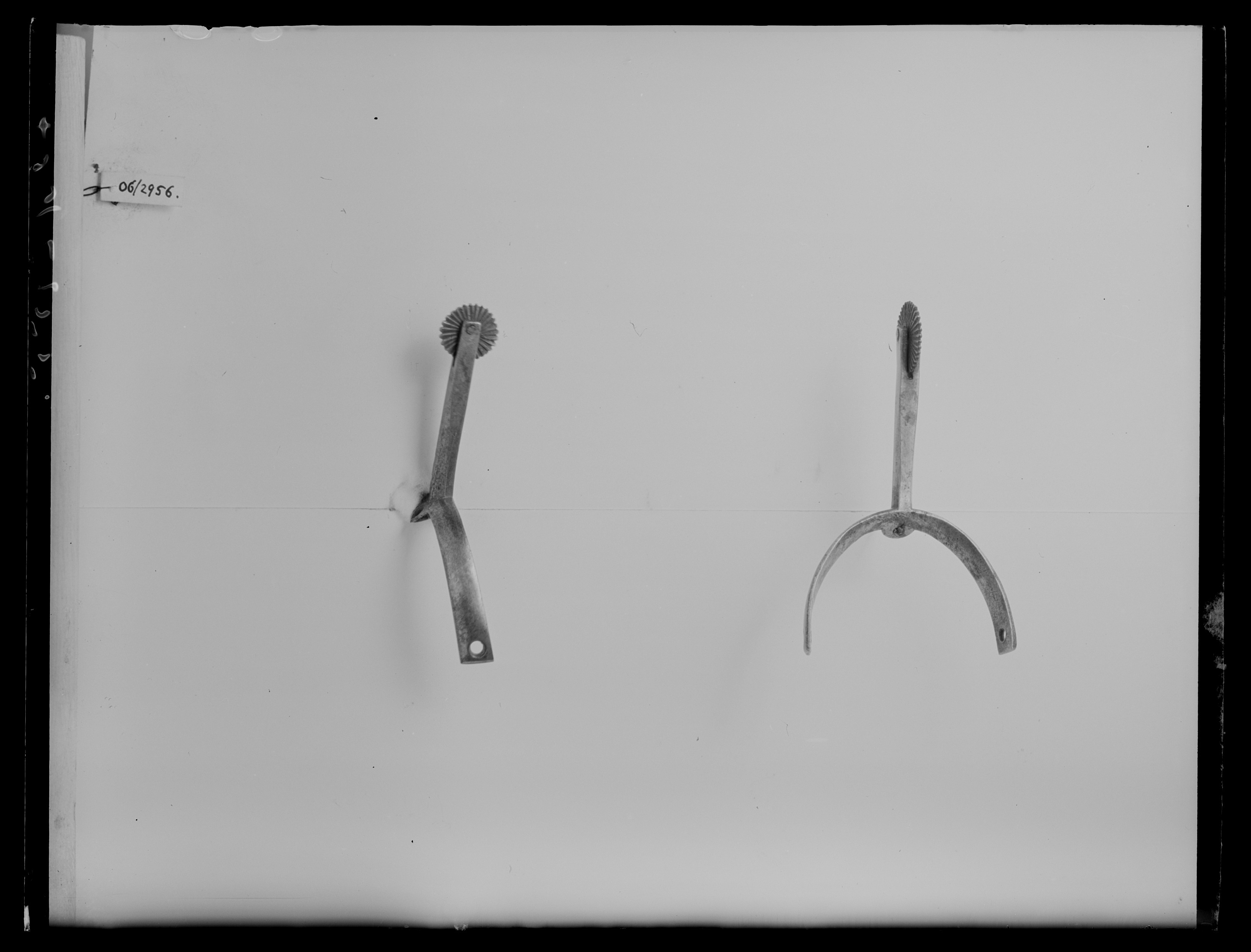 L: 110 mm, b: 61 mm, vikt: 27,4 g Sporre av stål. Korta u-formade skänklar plana på insidan, på utsidan något konvexa med tvära ändar och hål i ändarna. Vid sporrens hals ett litet rundat utskott på nederkanten med ett hål. Rak 53 mm långt något uppåtriktad hals. Intill skänklarna fasad, längre ut fyrkantig. Fintandad klinga 29 mm i diameter.