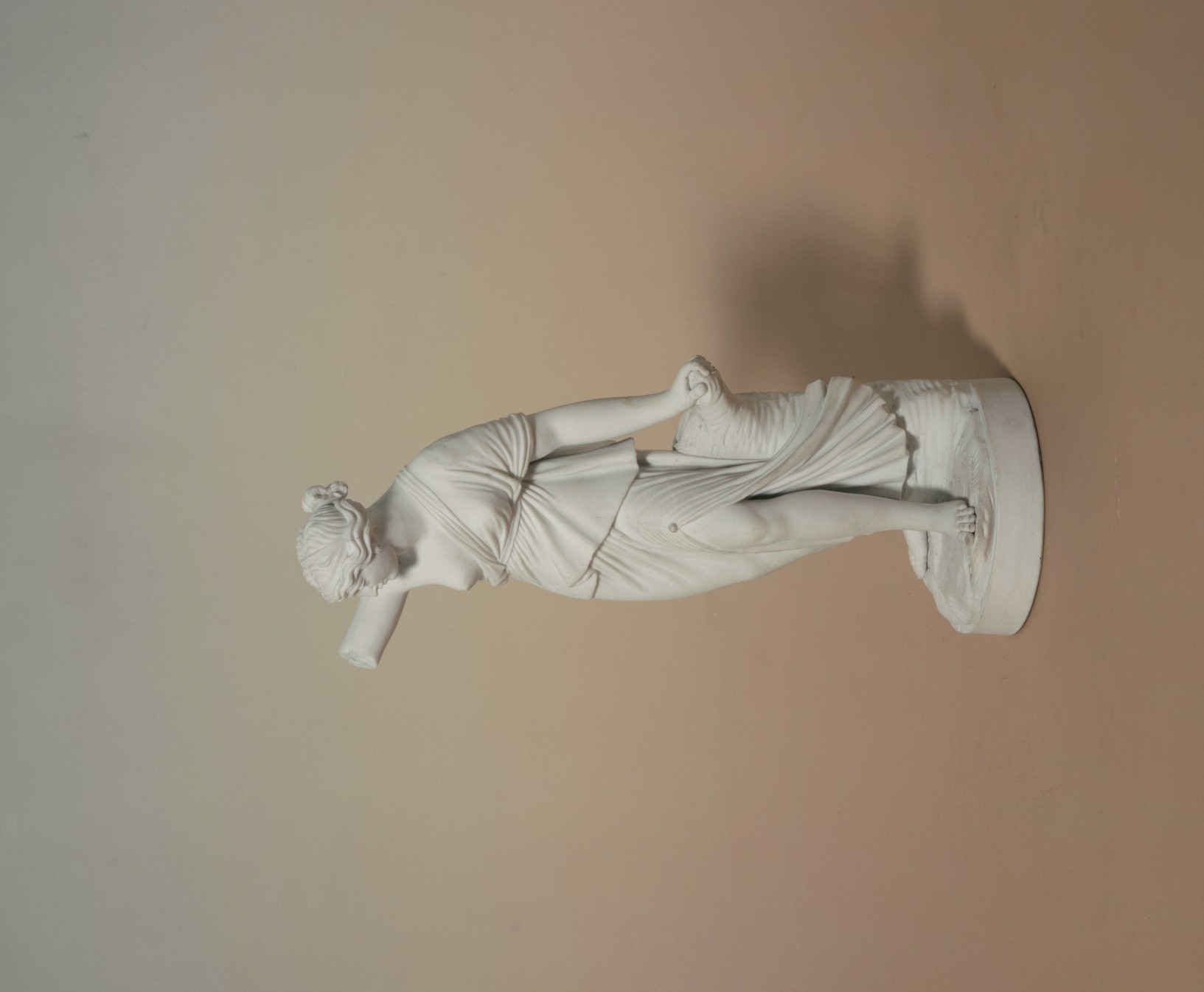 FIGURIN, Diana? stående på rund fotplatta, iklädd löst sittande lång klädnad blottande högra bröstet och vänstra benet.