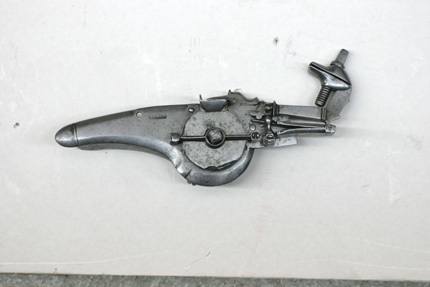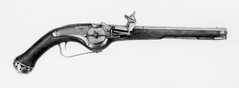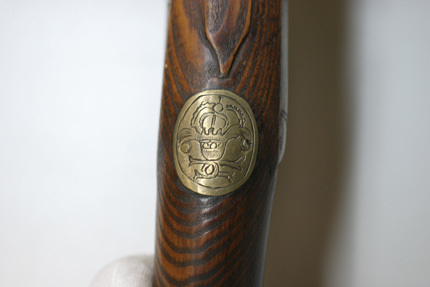 Rund, slätborrad pipa med åttsidig kammare, vid övergången fasade kanter, två tvärgående åsar. På pipans undersida en otydlig stämpel. Riktmedel: Spolformigt stolpkorn, siktskåra på pipbasen. Fästning: Två häften. Pipan fäst med krysskruv underifrån samt två pipstift av trä. Krysskruven har urtag för låsdelar. Hjullås av västeuropeisk typ. Plant låsbleck med fasade kanter, utanpåliggande hjul fäst med hjulbrygga och skruvar kl. 3 och 9. Hane med balusterformig kropp med fyrsidigt tvärsnitt, platt hals med svängd baksida, lös underkäke, käkskruv med fyrsidig flänsskalle. Rundad fängpanna med tämligen hög krutskärm. Fängpannelock med rörlig arm, s-formigt svängt fingergrepp. Balusterformig hanstudel. Låsblecket på insidan stämplat med ett sju-ekrigt hjul. Fästning: Två låsskruvar(?). Svagt böjd avtryckare. Helstock av fransk typ av alm. Beslag av stål. Kolvkappa utan flikar, genombruten med runda hål och lambrekäng-liknande utskärningar. En rundad rörka samt näsband ca 5 mm från mynningen. Oval tumplåt av mässing med namnchiffer, spegelmonogram C krönt av kunglig krona. Rak varbygel. Tillbehör: Laddstock, l: 324 mm av trä med urnformig skoning av stål i stötänden.