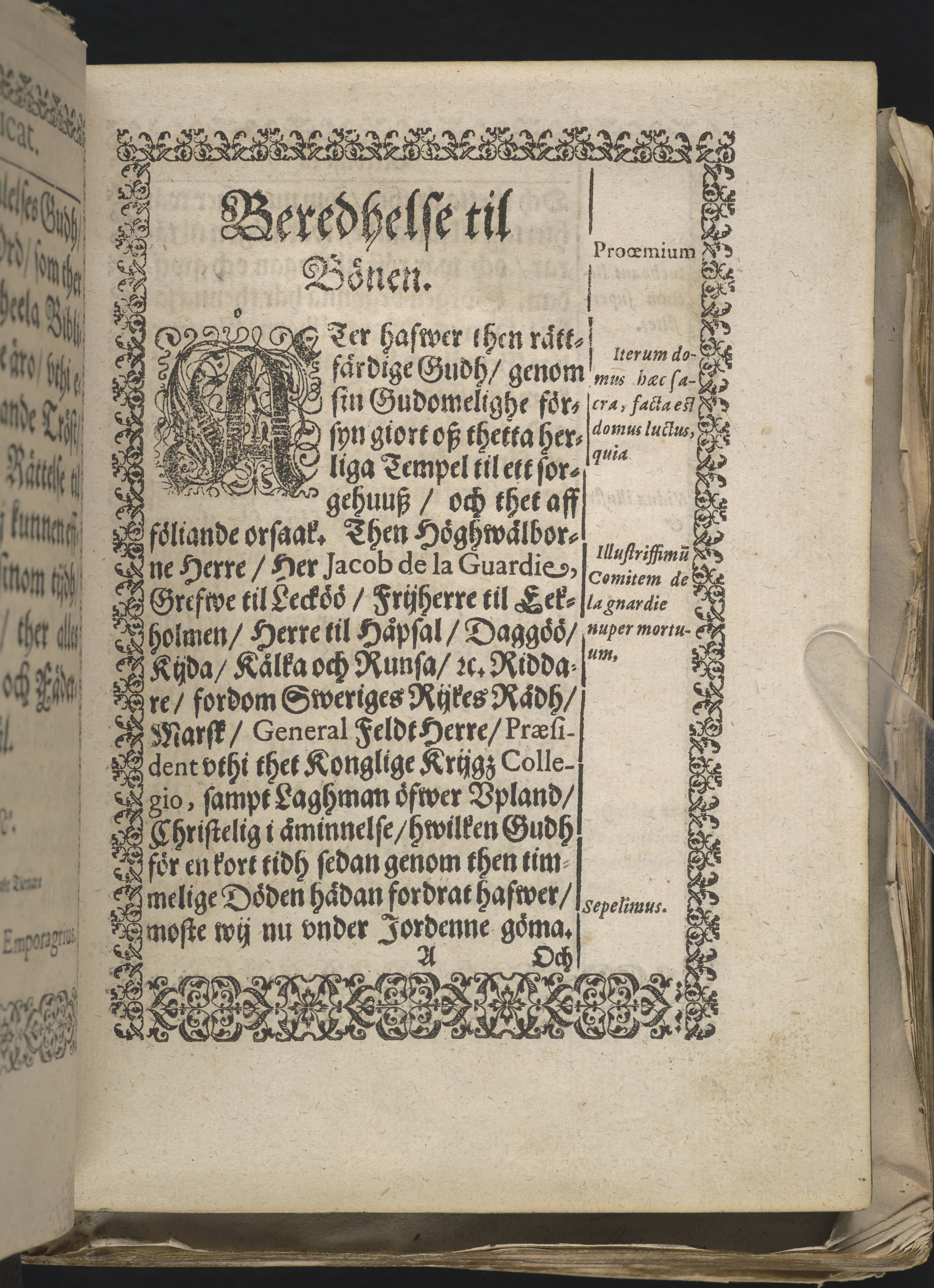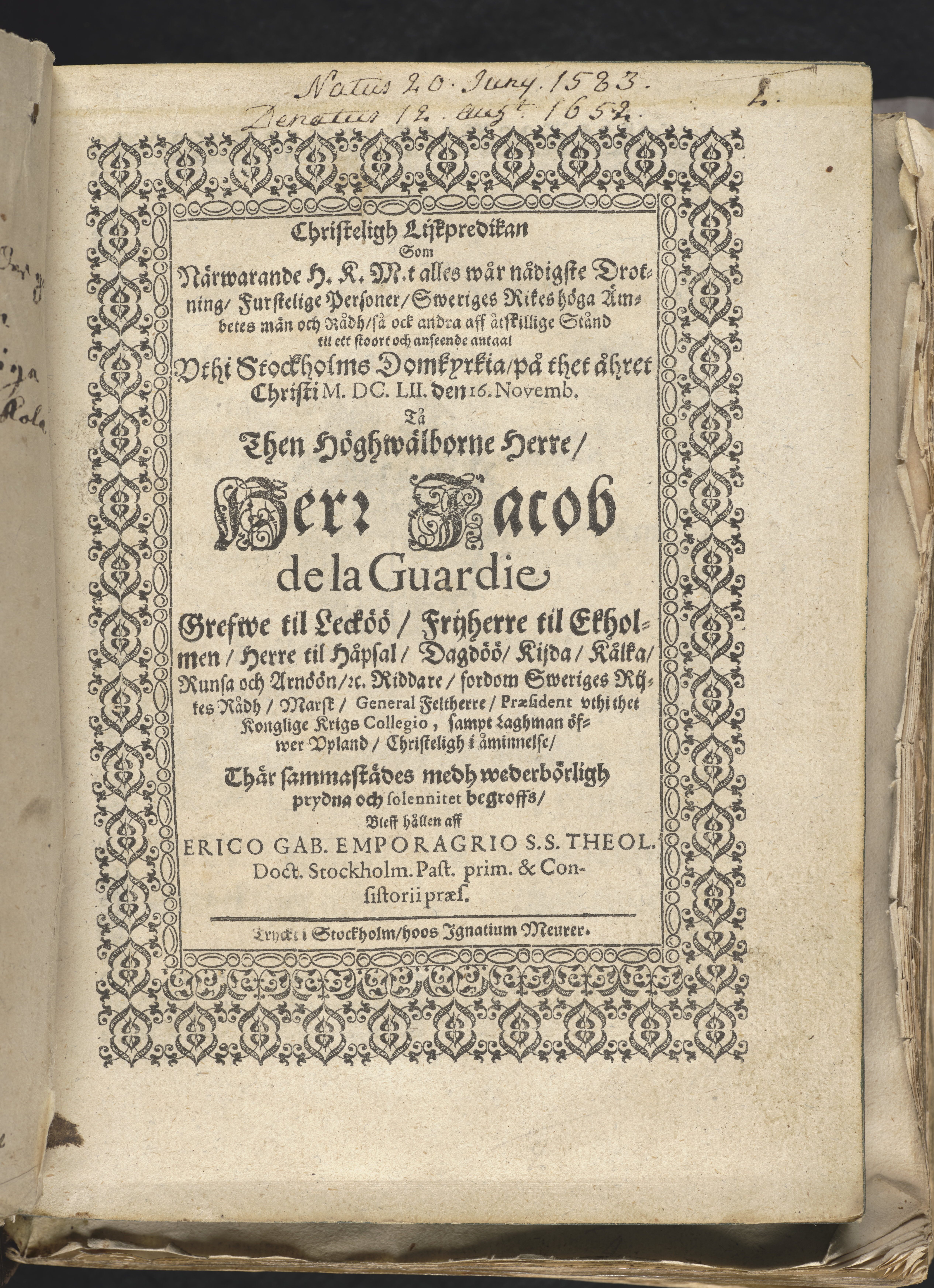 Christeligh lijkpredikan som närwarande H.K.M.t alles wår nådigste Drottning / furstelige personer / Sweriges rikes höga ämbetes män och rådh / så ock andra aff åtskillige stånd till ett stoort och anseende antaal uthi Stockholms domkyrkia / på thet året Christi M.DC.LII. den 16. Novemb. tå .then högwälborne herre / herr Jacob de la Guardie, grefve til Lecköö / friherre til Ekholmen / herre til Håpsal / Dagdöö / Kijda / Kålka / Runsa och Arnöön / &c. Riddare / fordom Sweriges rijkes rådh /marsk / general feltherre / praesident uthi thet kongelige krigs collegio, sampt laghman öfwer Upland / christelig i åminnelse / Thär sammastädes medh wederbörligh prydna och solennitet begroffs / bleff hållen aff Erico Gab. Emporagrio s.s. theol. doct. Stockholm. past. prim. & consistorii praes. Tryckt i Stockholm, hoos Ignatius Meurer.