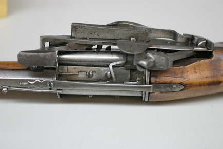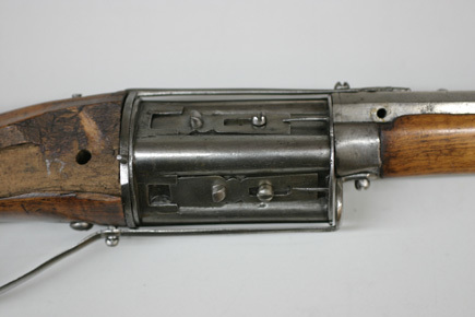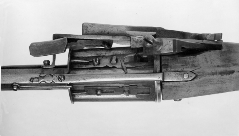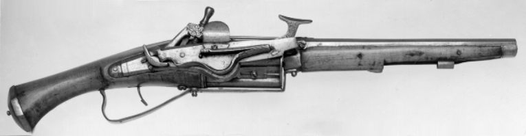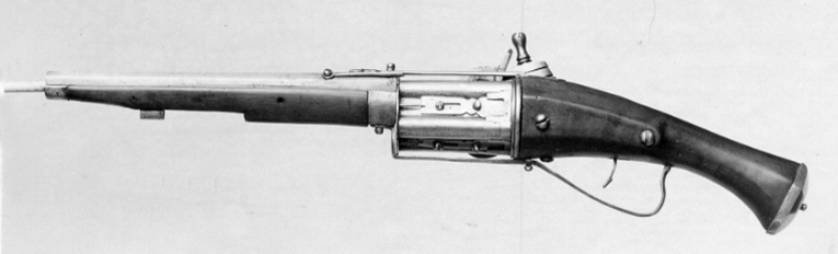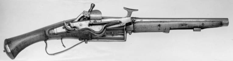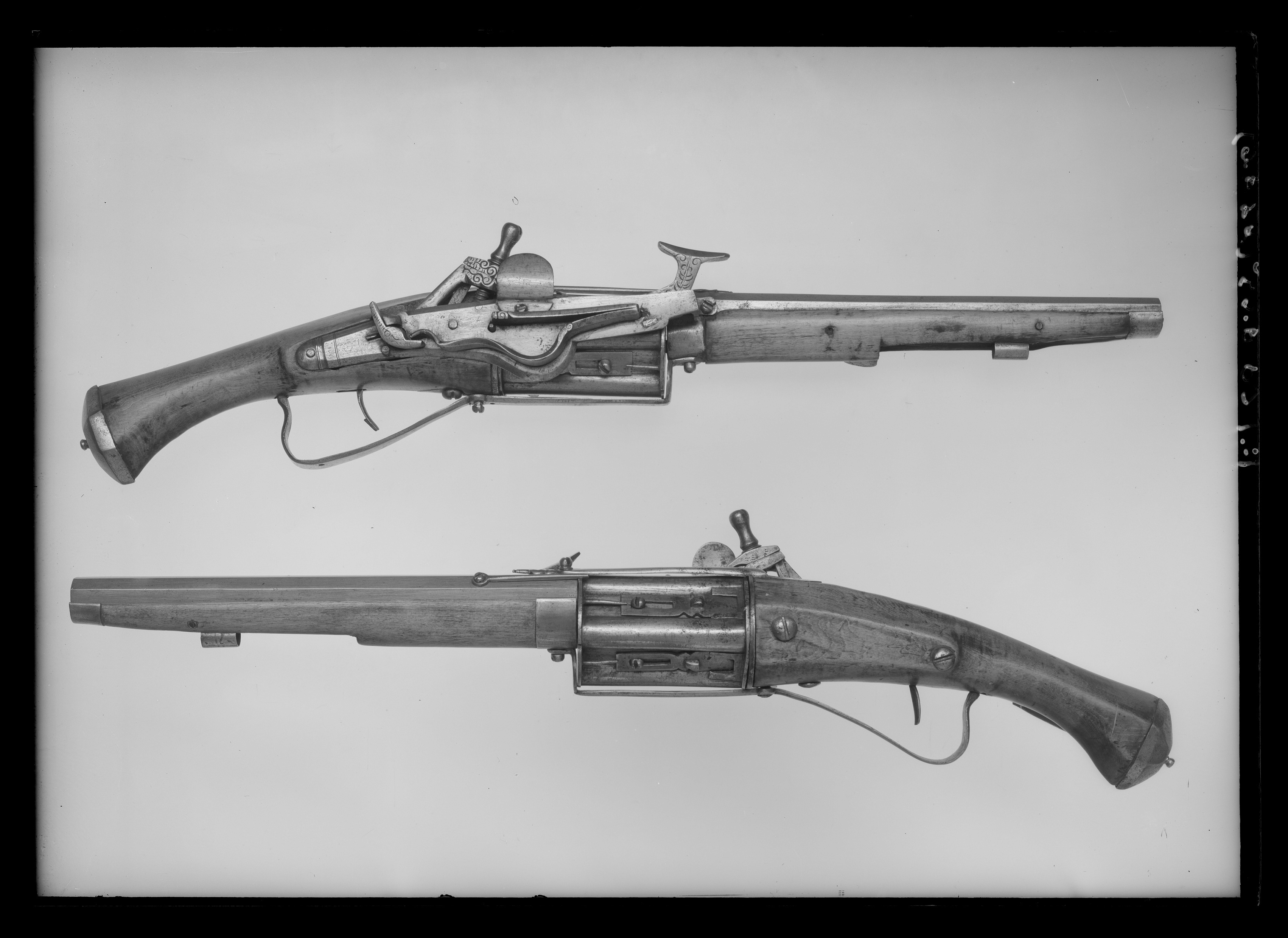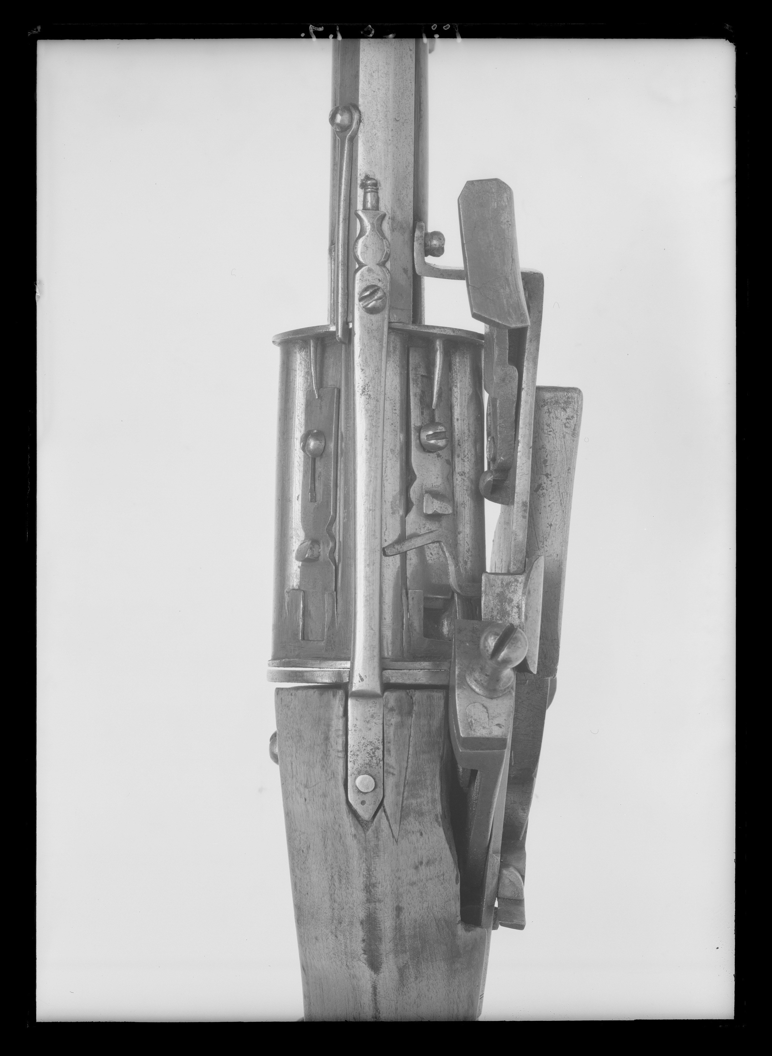 (beskrivning o mått från 11663) Åttsidig, slätborrad pipa av stål. Vid bakänden en stålplatta, fastlödd med kopparlod, hål för trumaxeln. Fästning: Två häften. Förstocken fäst med ett, ursprungligen två pipstift av trä. Pipan skruvad på trumaxeln. Trumma med fyra rör, kaliber 11,2 mm. I båda ändar fastlött stålplattor, på den främre med fyra hål för loppen, ett för axeln samt fyra stopphak i kanten. I den bakre är ett hål för axeln. Fjädrande spärr, fastskruvad vid pipan. Mellan piporna fängpannor med skjutbara lock. Locken öppnas automatiskt med stålstav, fäst på hankroppen. "Ram", bildad på ovansidan av en stålstav, fastskruvad baktill med en krysskruv underifrån, framtill fäst i pipan med skruv, profilerad framände. På undersidan bildas ramen av varbygelns främre arm. Dessutom fungerar låsblecket som ramens h. sida. Snapplås med plant låsbleck med hjullåsformigt nedåtsvängd nederkant, fasade kanter, filade linjer vid bakre fästskruven. Framänden inåtböjd i vinklar som fäste för skruv, fäst i pipan. Hane placerad på insidan av låsblecket. Rak, fyrsidig kropp, rektangulära käkar med punsad rankdekor på utsidan. Överkäken lös och intappad i underkäken, käkskruv med högt, timglasformigt huvud. På kroppens framsida utskott med hål, däri fäst fängpanneöppnare i form av stålstav med änden böjd in över fängpannorna. Utvändig nöt i form av månskära (i nedan) med tå och häl. Utvändig slagfjäder med fasad kant, nersvängd utefter låsbleckets kant. Vid låsbleckets överkant fastskruvat en utåtböjd krutskärm med rundad överkant. Eldstål placerat på låsbleckets insida, böjd, fyrsidig arm, punsad dekor, rektangulärt eldstål, ena hörnet avtaget, yttersidans kant fasad. Invändigt eldstålsfjäder. Fästning: Två låsskruvar från v. sida, en från h. sida, tapp genom låsbleckets mitt från trumaxelns bottenplatta. Avtryckare: Svagt böjd, tunn, fyrsidig avtryckare av stål. Helstock av björk i två delar. Svagt böjd kolv, sexsidig vid kolvänden. Beslag av stål. Sexsidig, välvd kolvkappa med en liten mittknopp. Varbygel framtill utdragen under trumman med i sin tur vinkelrätt böjd platta för fästskruv. Förstock skodd med stålband i båda ändar, slät rörka av stål.