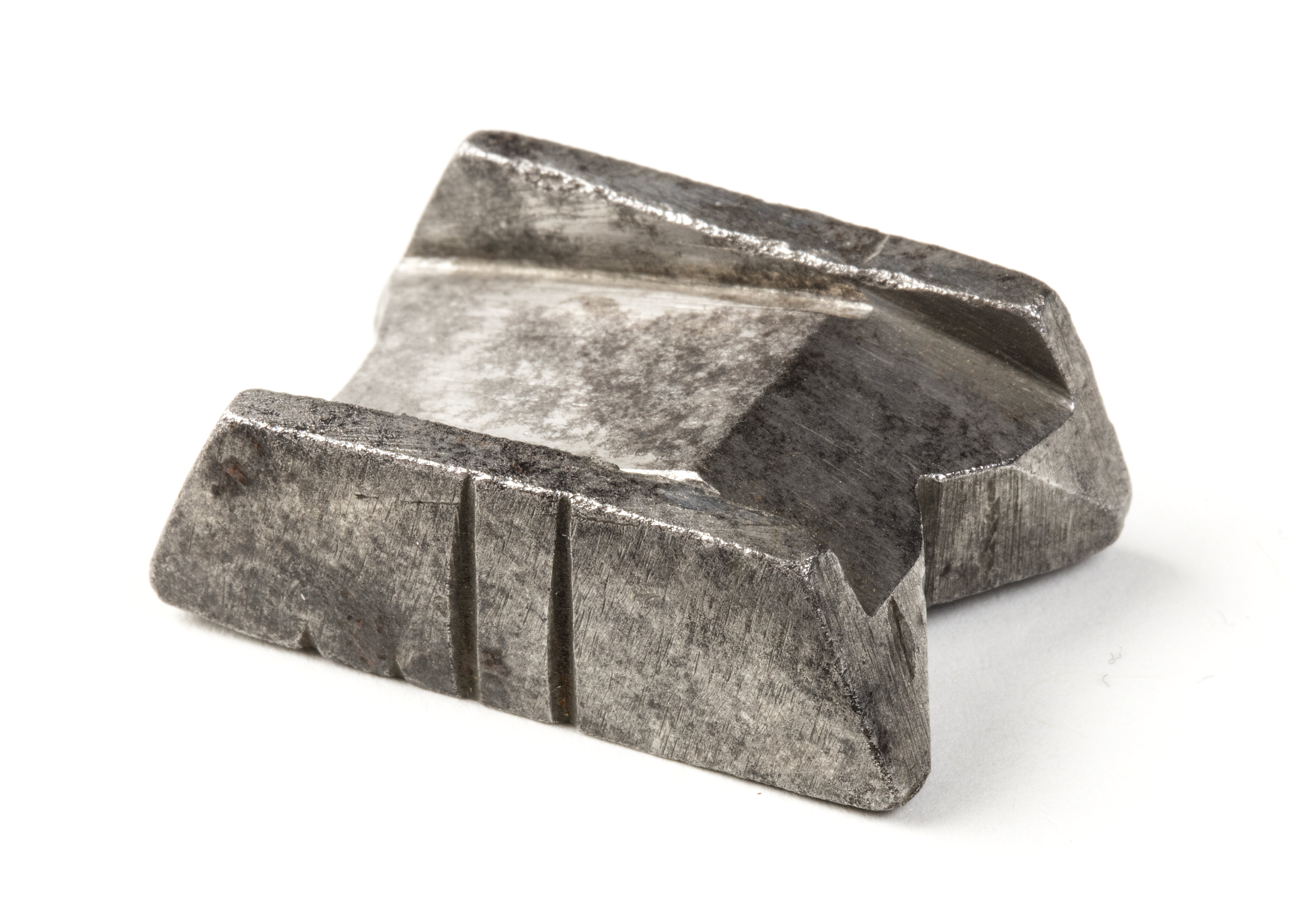 Profileringsstål, bråde, tillhörande en maskin för dragning av blylister till fönster. Prismaformigt. I ena kortänden v-formigt urtag, i den andra bjågformigt. Undersidan är märkt med en punkt och ena långsidan med II. På ovansidan urtag från båda kortsidorna mot en ås - profilen. Ett spår på var sida av profilen.