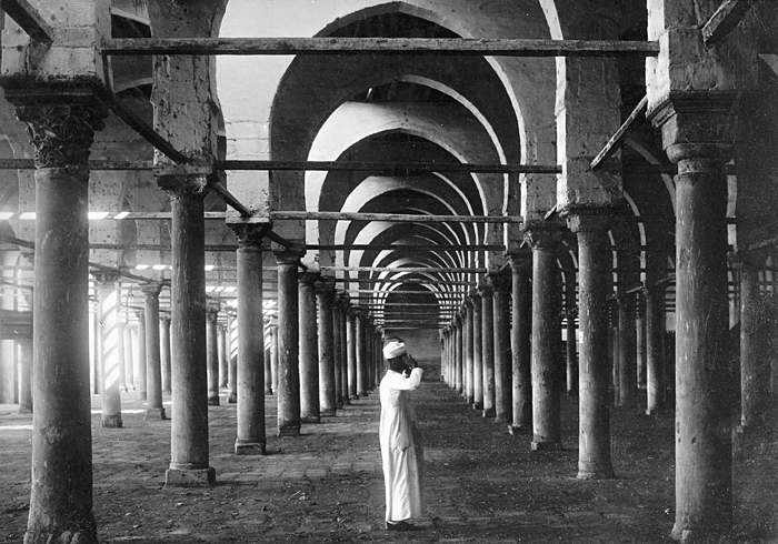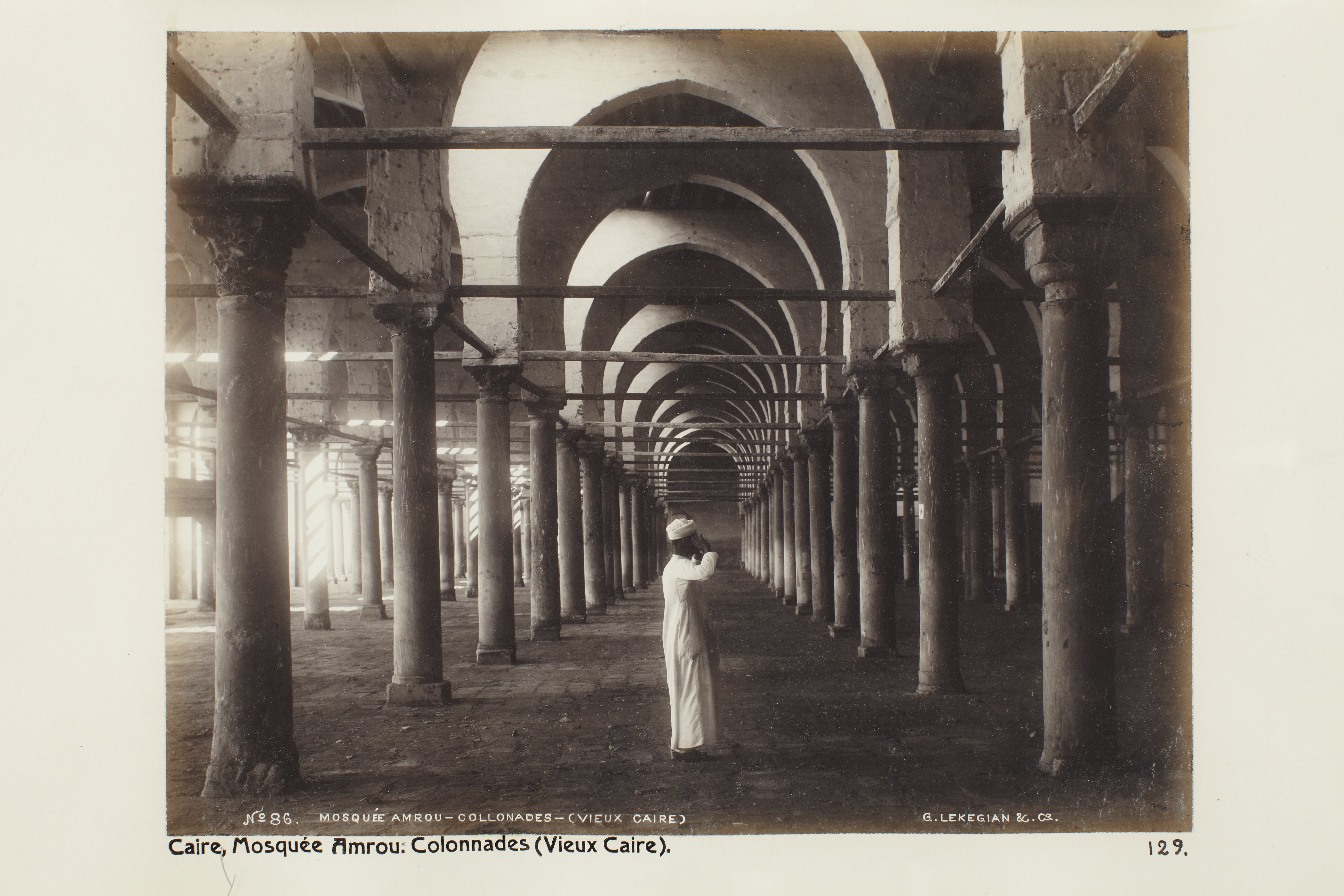 Pelargångarna i Amrou-moskén i Gamla Kairo. Kairo, Egypten. Text på fotografiet: Caire. Mosquée Amrou: Colonnades (Vieux Caire). Fotografierna LXVI:M.01.- 201. kommer från resan till Egypten och Sudan som Wilhelmina och Walther von Hallwyl gjorde vintern 1900-1901. De lämnade Sverige den 5 november 1900 och fortsatte från Egypten till Palestina den 28 mars 1901. Med på resan var döttrarna Ellen med maken Henric de Maré och Irma med maken Wilhelm von Geijer. Wilhelminas sällskapsdam, fröken Ida Uhse reste också med. Under en del av resan anslöt sig ledamoten av Internationella domstolen i Kairo, assessorn Otto Conrad Waldemar Cedercrantz med makan Anna Elisabeth. Vid resan uppför Nilen hade Walther von Hallwyl hyrt ångfartyget Columbia med besättning. Båtresan startade i Kairo 27 december 1900, gick ända till Wadi Halfa varifrån man reste vidare med tåg till Khartum och tillbaka till Wadi Halfa. Båten vände åter i riktning mot Kairo, men det verkar som att sällskapet tog tåg sista biten, från Luxor. Henric och Ellen de Maré samt fru Cedercrantz lämnade båten redan då de passerade Luxor första gången. Resten av sällskapet återvände till Kairo den 1 mars. Fotografierna LXVI:M.01.-120. togs av resenärerna själva, de största av Ellen de Maré, de mellersta av Wilhelmina von Hallwyl och de minsta av Wilhelm von Geijer. Resten köptes av professionella fotografer i Kairo, de flesta från Studio Photogr. Artistique G. Lekegian & Cie. Alla uppgifter kommer från Ida Uhses reseanteckningar. Inköpt hos studio Photogr. Artistique G. Lekegian & Co’.