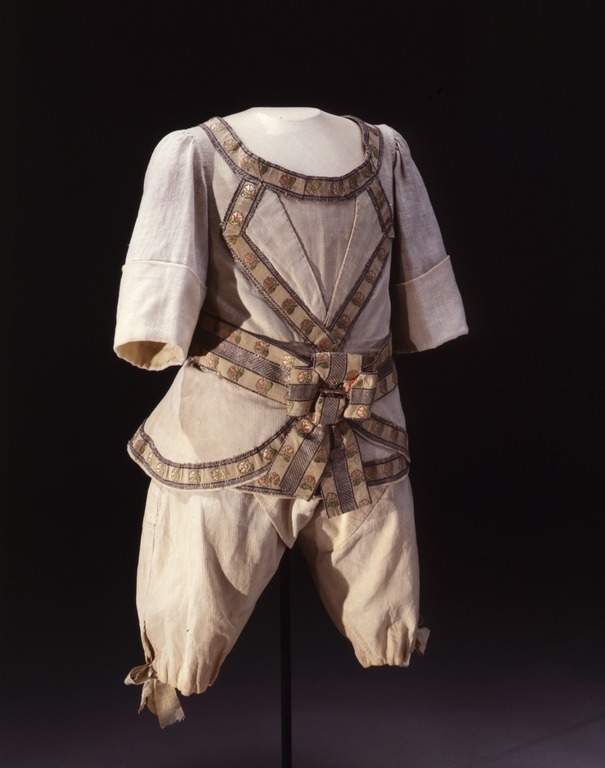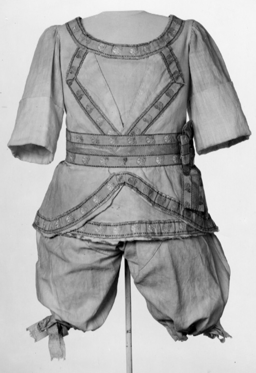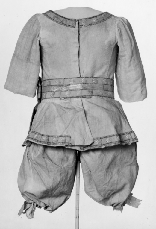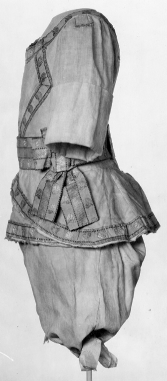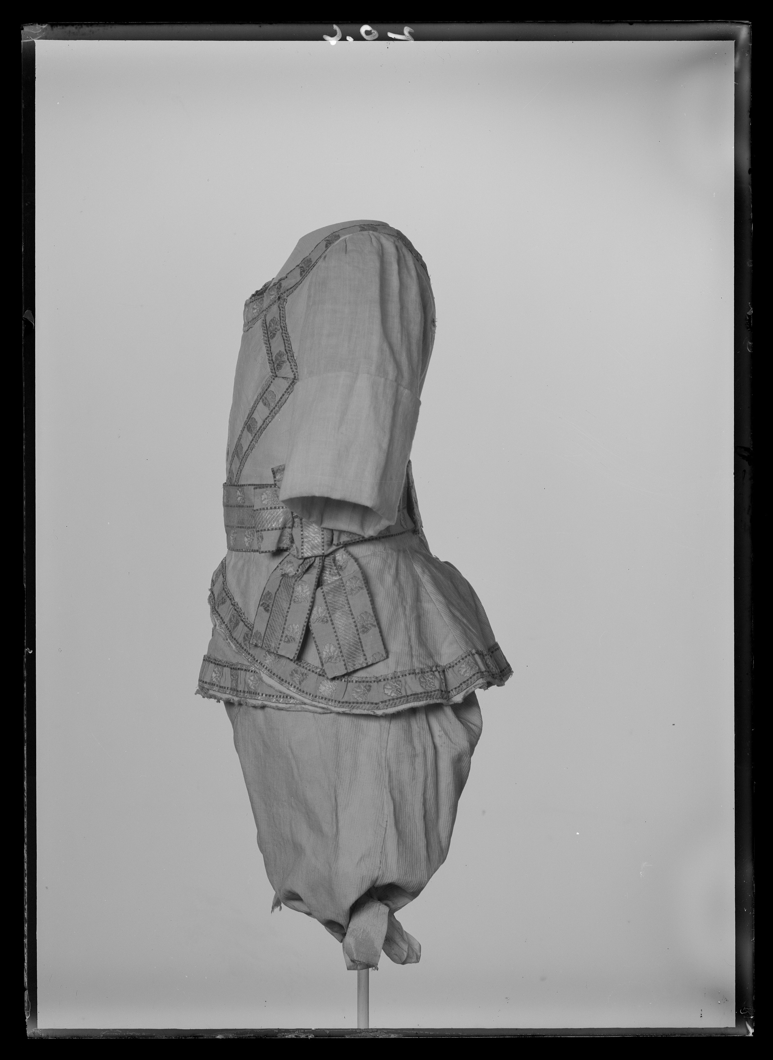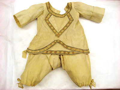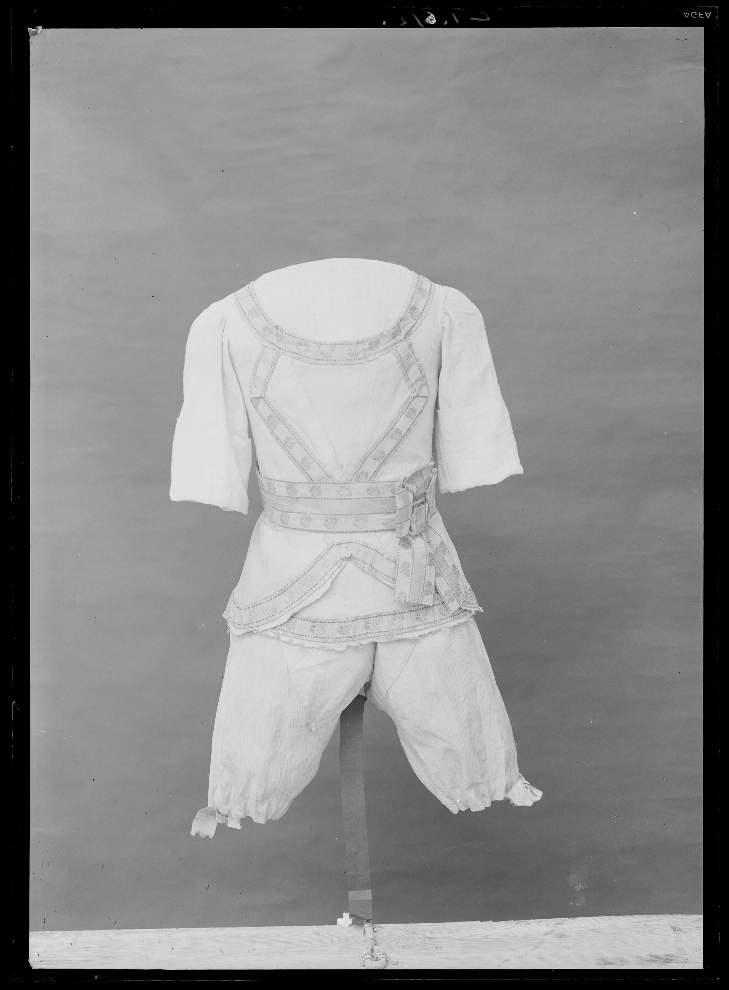 Vit barndräkt bestående av jacka och byxor sydda i tyg vävt av bomull och lin med en randig struktur. Ärmarna är i ett avvikande tunnt ylletyg. Jackan är garnerad med ett 25 mm brett sidenband med rosa blommor och gröna blad, som löper runt halsringning samt tröjans kant och på bröstet. Dräktens liv och byxor är ihopsydda. Byxorna är vida upptill och har en en lucka i grenen (bredd upptill: 270 mm, bredd nertill 95 mm) som knäpps med en knapp (23 mm i diam) på framsidan och bak knyts den ihop med två band. Jackan är 334 mm lång och axelbredden är 250 mm. Båda ärmarna har en puff upptill. De är 240 mm respektive 280 mm långa (olika långa) samt försedda med ett uppslag på 80 mm. Ärmens vidd är 137 mm. Dräktens midjemått är 600 mm. På höger byxben är i sidsömmen ficka, vars öppning är 145 mm bred och 80 mm djup. Till dräkten tillhör ett midjeband, 605 mm långt, med en rosett som är 92 mm bred och 75 mm lång. Midjebandet är försett med samma dekorband som dräkten.