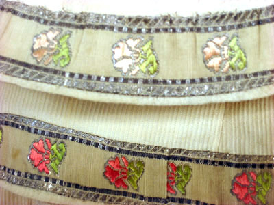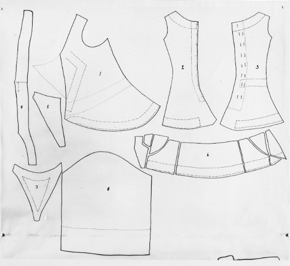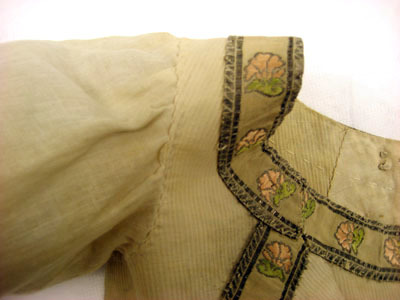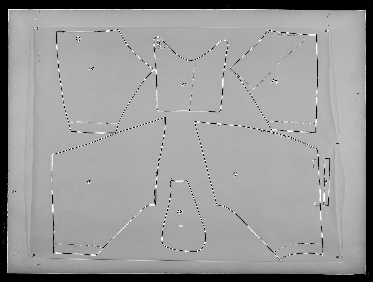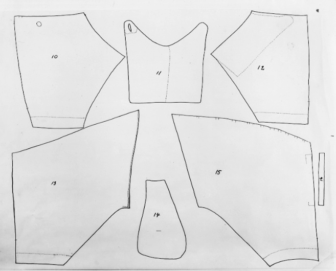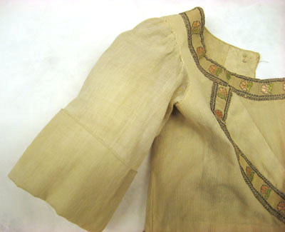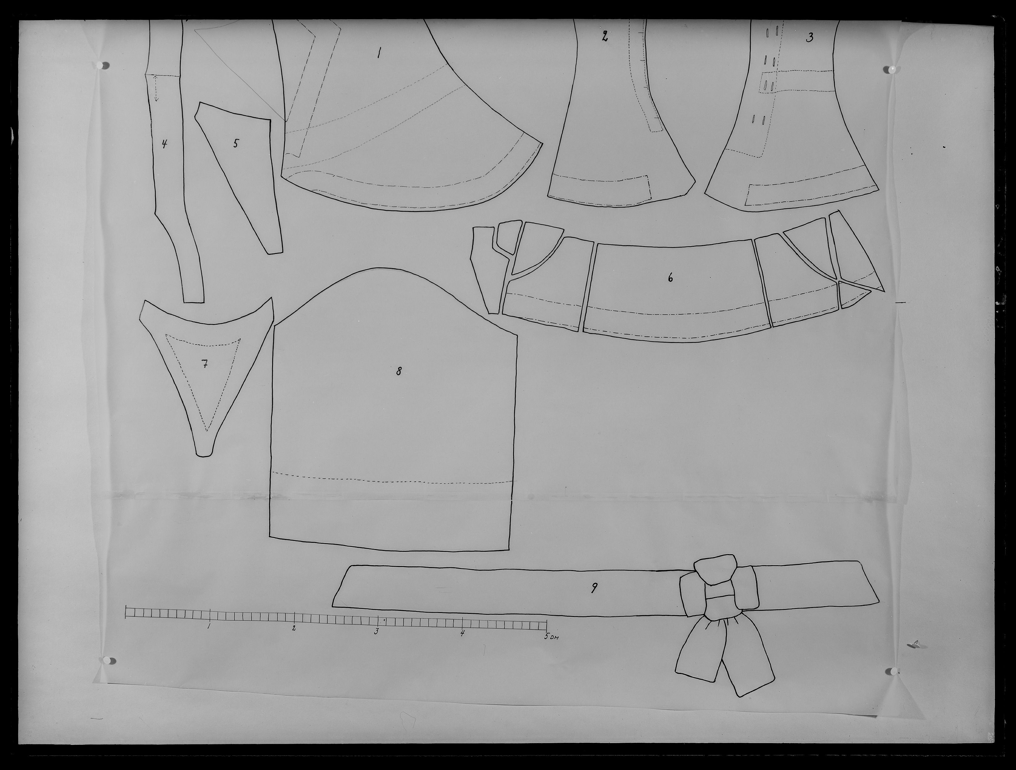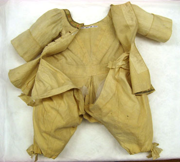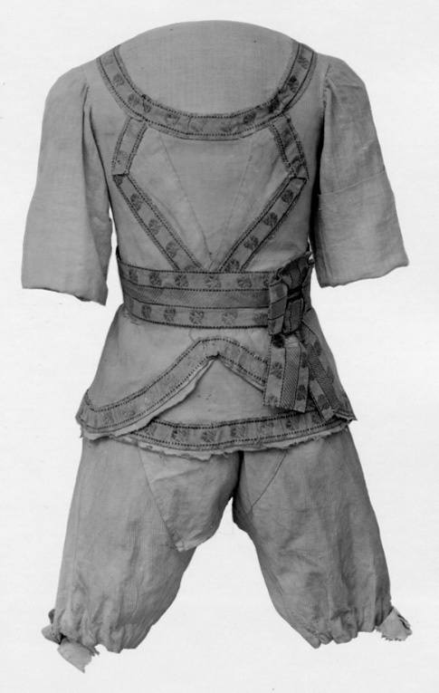 Vit barndräkt bestående av jacka och byxor sydda i tyg vävt av bomull och lin med en randig struktur. Ärmarna är i ett avvikande tunnt ylletyg. Jackan är garnerad med ett 25 mm brett sidenband med rosa blommor och gröna blad, som löper runt halsringning samt tröjans kant och på bröstet. Dräktens liv och byxor är ihopsydda. Byxorna är vida upptill och har en en lucka i grenen (bredd upptill: 270 mm, bredd nertill 95 mm) som knäpps med en knapp (23 mm i diam) på framsidan och bak knyts den ihop med två band. Jackan är 334 mm lång och axelbredden är 250 mm. Båda ärmarna har en puff upptill. De är 240 mm respektive 280 mm långa (olika långa) samt försedda med ett uppslag på 80 mm. Ärmens vidd är 137 mm. Dräktens midjemått är 600 mm. På höger byxben är i sidsömmen ficka, vars öppning är 145 mm bred och 80 mm djup. Till dräkten tillhör ett midjeband, 605 mm långt, med en rosett som är 92 mm bred och 75 mm lång. Midjebandet är försett med samma dekorband som dräkten.