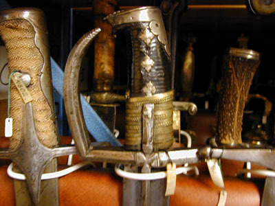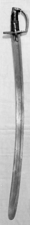 Fäste med plan kappa av silverplåt, framtill utdragen i en spets och något nedåtlutad, framdelens översida med en rad av sju små kulformiga förhöjningar med ett symmetriskt konturerat 40 mm långt ryggstycke, likaledes av silver. Handbygel, parerstänger, styrskenor och tumbygel av slätt stål, handbygeln något böjd, övre änden öppen (nästan anslutande till kappan), den nedre rätvinkligt anslutande till främre parerstången, som är rak liksom den bakre kanten. Utsidan av kryssets mitt format som ett Georgskors, från vilket tämligen smala styrskenor utgår uppåt och nedåt. Insidan av krysset med en bågformig tumbygel, utgående från den övre och nedre styrskenan. Kavel med ovalt tvärsnitt, tvärräfflad, klädd med svärtat skinn och med nedre hälften lindad med mässingslan omväxlande dubbla rader av tvinnad tunn mässingstråd, övre hälften smyckad på ut- och insidan med en vertikal rad av tre korsformiga blommor av silverplåt (sannolikt nithuvuden). Klinga böjd, eneggad med tvåeggat ej eggslipat spetsparti och med rundad udd. Ryggsida plan. På baspartiets insida i ett nedsänkt längsgående rektangulärt fält: I R (I?) G 0. På ut- och insida en bred, grund hålkäl anslutande till ryggkanten.