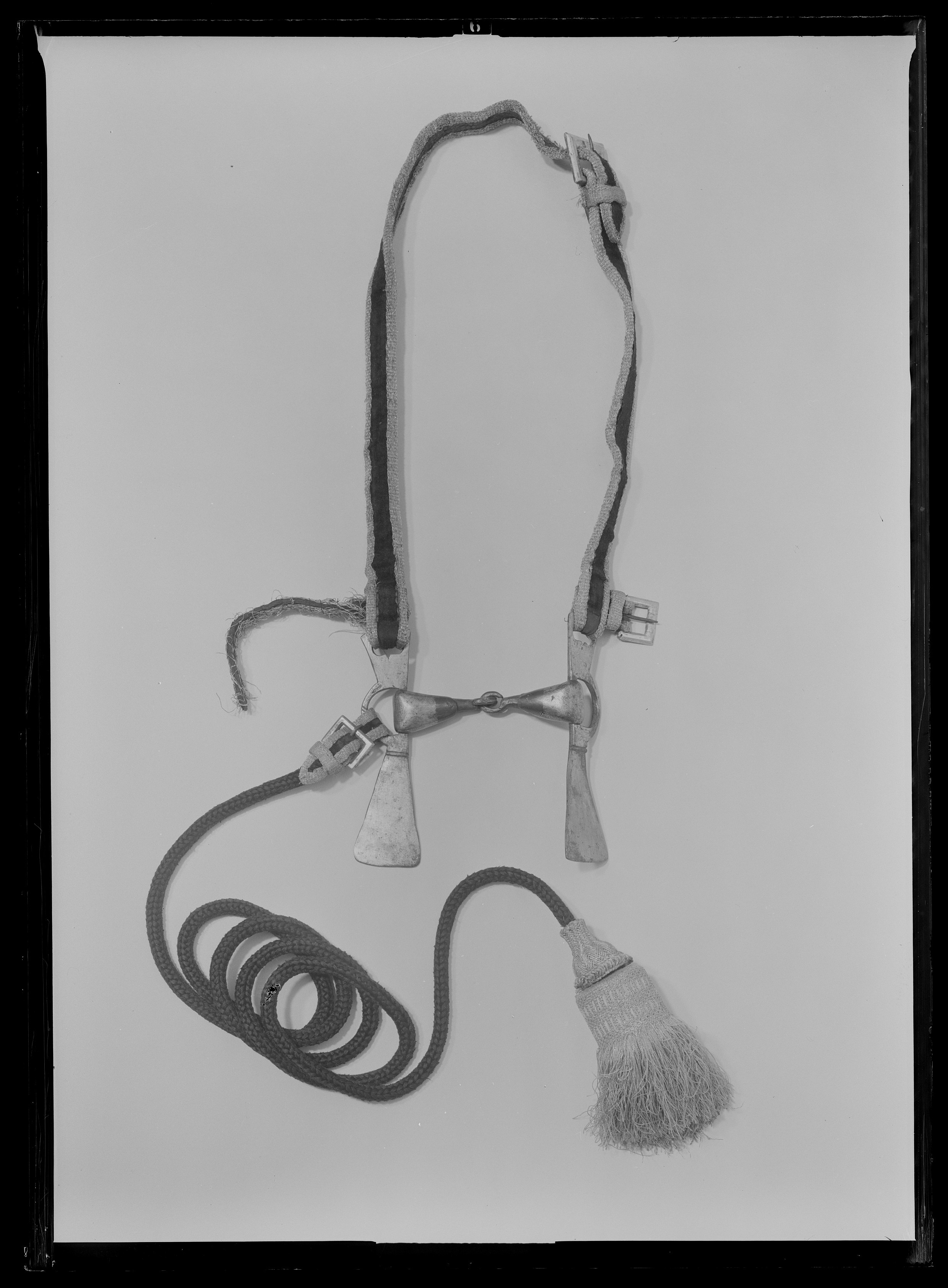 - 6 st hufvudställ med guldgaloner samt handtyglar af svart silke med stora tofsar af guld och isabellfärgat silke, hvartill kommer 6 st förgyllda jerntränsar.