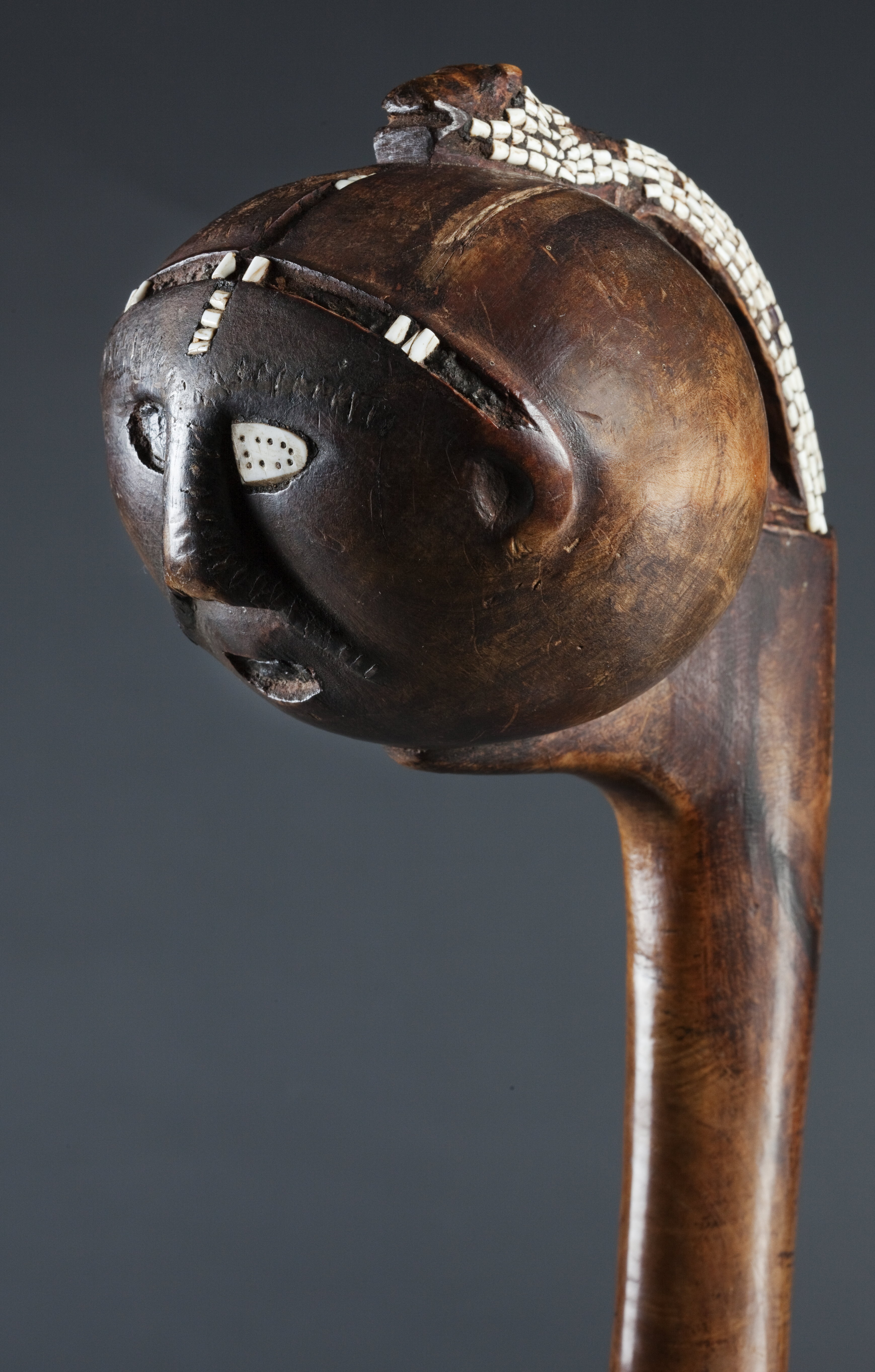 Möjligen en gåva till Carl Gustaf Wrangel eller Per Brahe d.y. från guvernören Johan Printz (1642-1653). Klubba av brunt trä. Klubbhuvudet och skaftet är snidade i ett stycke. Huvudet är i form av människoansikte med en ödla i nacken. Ödlan och ansiktet är inlagda med vitt material, eventuellt wampum (snäckskal), på ödlan även ett par i violett. Runt ögon och näsa finns det inlagda koppartrådar. Skaftets nedre del är i form av en människofot, ett underben samt ett knä. Ovanför knäet finns det ett hål för en bärrem. Enligt 1710 års inventarium p. 75, rum 3, tillsammans med inv.nr 6906: "2 Indianiske handgewär, det ena med ett ansichte frampå, litet beensatt och 1 Foot back på, det andra Heel slätt". Club of brown wood with head and shaft carved in one piece. Head with anthropomorph face and a lizard at the back. The lizard and the face with white inlay, possibly Wampum (shell). Copper wire inlays round eyes and nose of the face. Lower part of the shaft carved into a human leg and foot. One hole above the knee. According to the inventory of 1710 placed together with club no 6906 in the tower chamber of the Wrangel armoury. The items are most likely a gift from Johan Printz , Governor of New Sweden from 1642 to 1653, to Field Marshal Carl Gustaf Wrangel or Lord High Steward Per Brahe the younger.