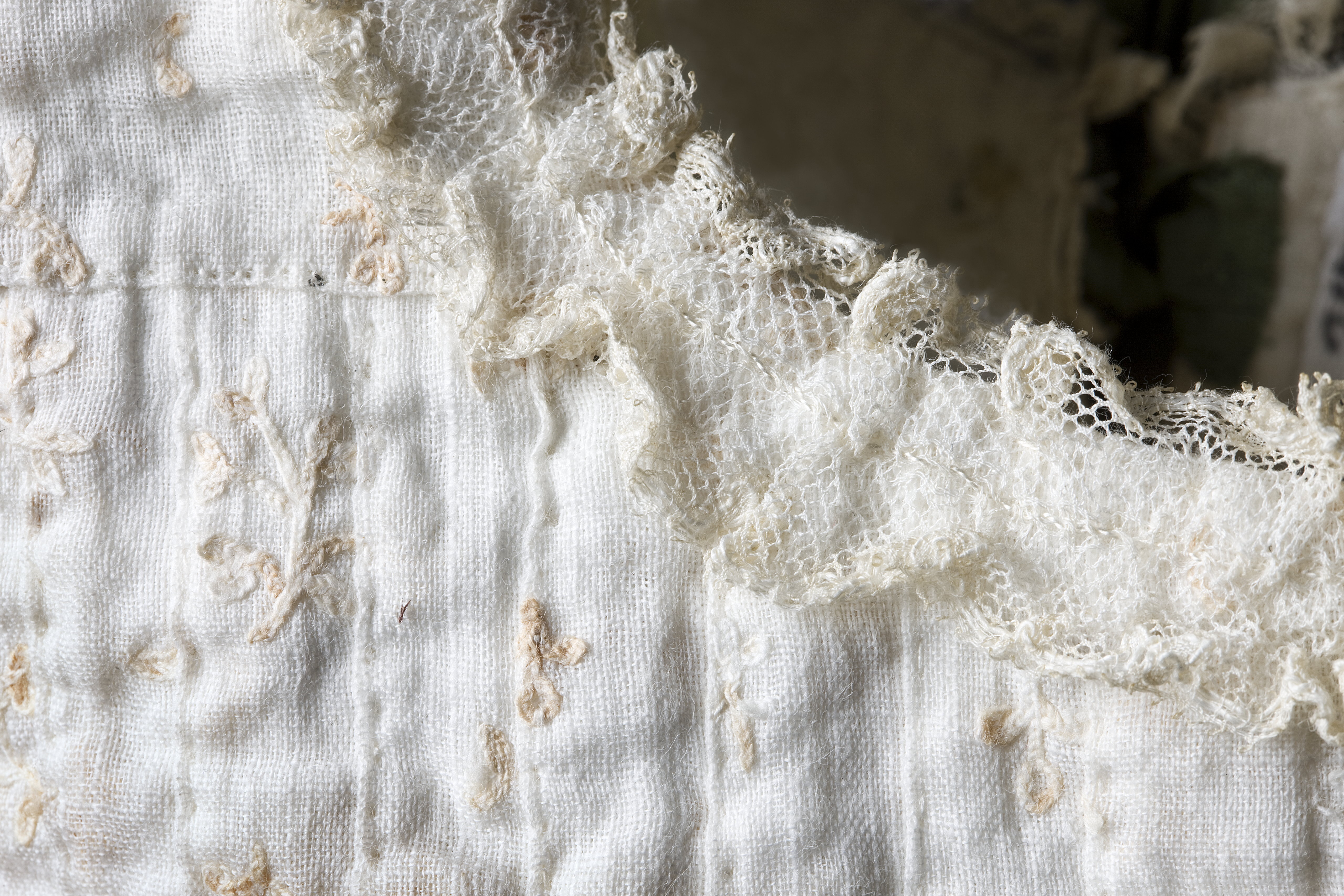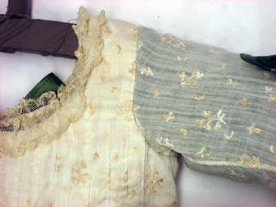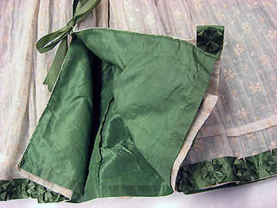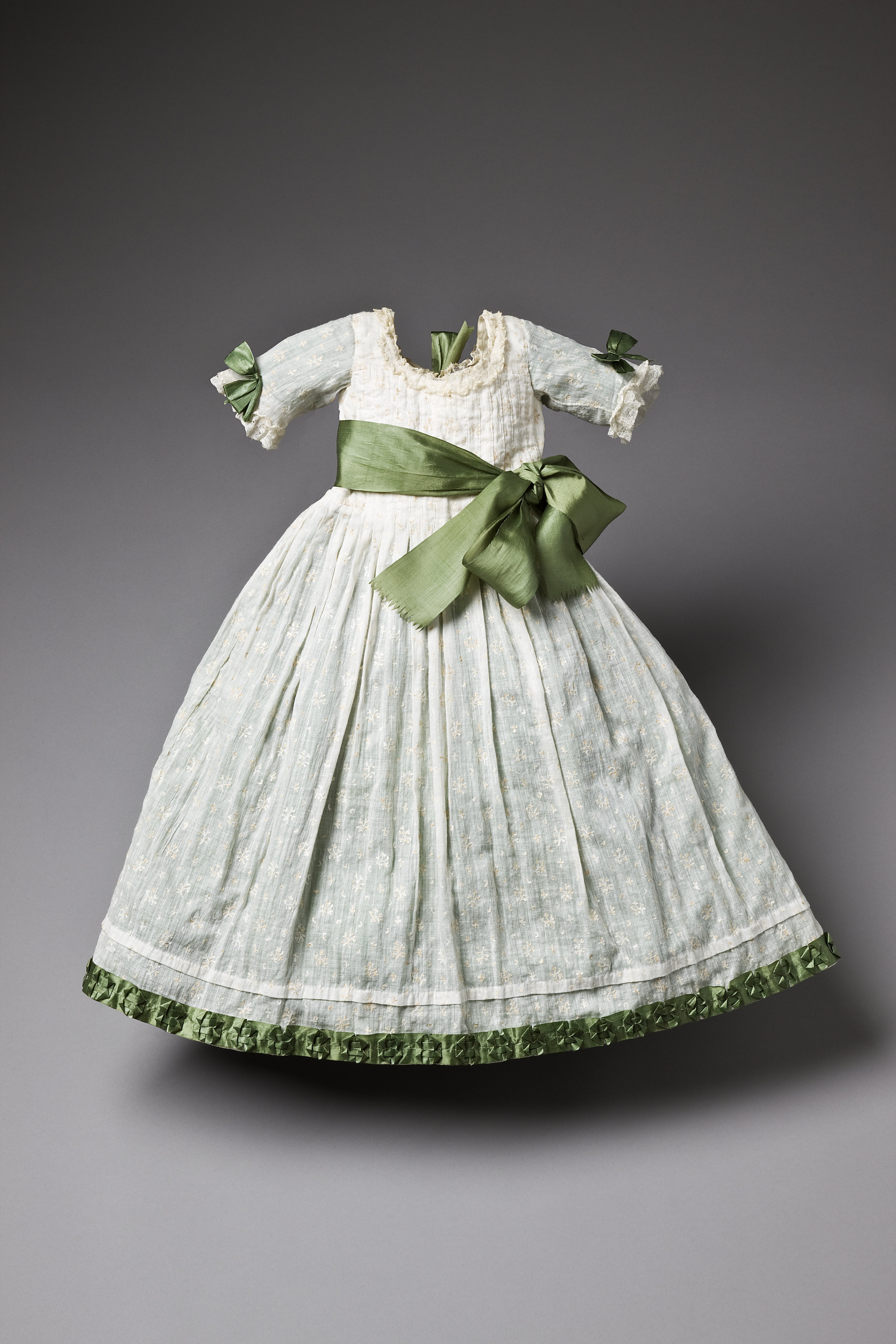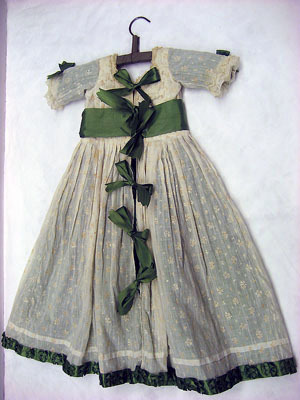 Plagget ingår i en babyutstyrsel som beställdes till det barn som Hedvig Elisabeth Charlotta felaktigt trodde sig vänta sommaren 1775. Plaggen har senare använts av de barn Hedvig Elisabeth Charlotta födde, samt av Gustav IV Adolfs och drottning Fredrikas barn. Naturvit klänning i tunn bomull, s.k. nättelduk med broderade små blommor, bestående av en klänning med underkjol. Underkjolen är i grön sidentaft och fastsydd i midjan. Klänningens livstycke har veck som ger extra vidd till kjolen. Runt halsringningen samt på ärmens linning är en 20 respektive 34 mm bred spets fastsydd. Ett grönt sidenband, 62 mm brett, är fastsytt i midjan och på ärmen är 70 mm breda gröna rosetter. Längst ner på klänningen är ett veck, 10 mm brett, och under detta på den nedre kanten är ett grönt sidenband, 28 mm brett, fastsytt i veck som kan likna rosetter. I ryggen på klänningen finns sex rosetter där de tre översta håller ihop klänningen. Rosettbanden till dessa är 28 mm breda. Klänningens vidd är 800 mm.