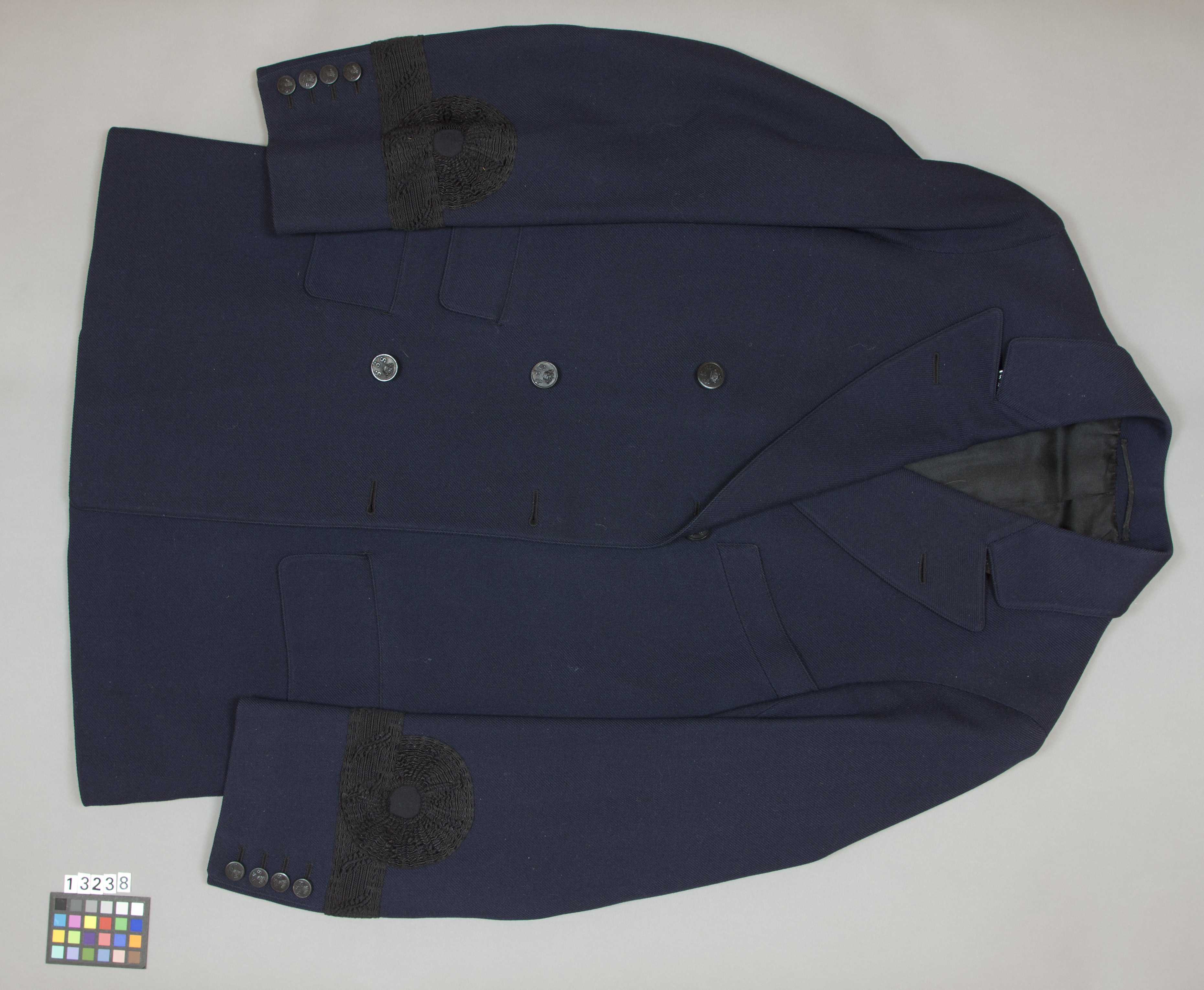 Kavaj av mörkblå yllediagonal dubbelknäppt med fyra par knappar med krona och "S. S. S" d: 20 mm.Slag med genombrutet knapphål. En bröstficka samt tre nederfickor dessa med lock. Nedtill på ärmarnaamiralsgalon av svart silke (utan stjärnor) och sprundmed fyra små knappar lika föregående. Foder av svart siden, i ärmarna vitt siden med smala blå ränder. Två innerfickor.