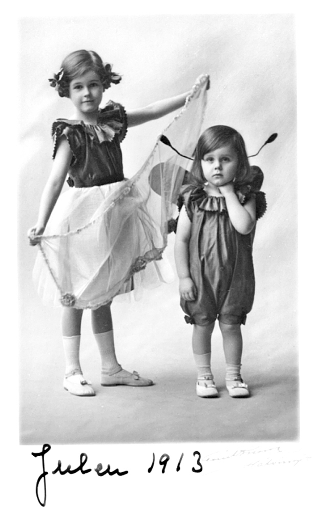 MARGIT och ERIK VON GEIJER, januari 1914. Helfigurer, stående i fantasikläder, MARGIT som fe och ERIK som fjäril. Fotografipapper, dubbeltjockt och vitt. Till höger signering med blyertspenna. Nedtill skrivet med bläck; "Julen 1913". Höjd: 16,8 cm, bred: 10,8 cm. Fotograf EMIL BRUNO i Hälsingborg. Ram gammal, av mässing. Förgylld med matt och blankt, rektangulär. Upptill en bladlist, nedlöpande ett stycke på sidorna. I mitten en bandrosett. På baksidan pappskiva, klädd med rutmönster pressad papper. Det hela fasthållet, på mitten, av ett tvärband med vertikal flädertunga och rundstavig stötta. Nedtill två upphöjda plattungor. Glas original med fasslipad kant. Höjd: 17,7 cm, bredd: 11,5 cm.nm. Fotografi gåva till WALTHER VON HALLWYL, januari 1914 från hans dotter IRMA INGEBORG MATHILDA VON GEIJER, f. 1 juni 1873, gift 14 juni 1894 med sedermera ryttmästaren FREDRIK WILHELM GUSTAF VON GEIJER, f. 8 februari 1865, d. 16 maj 1930. Fotografien utfört efter beställning av IRMA VON GEIJER januari 1914 hos hovfotografen EMIL BRUNO, Södra Storgatan 3, Hälsingborg. Ramen inköpt av WALHER VON HALLWYL 11 oktober 1913 hos CLAÊS HULTBERG, konsthandel, ram- och spegelfabrik, Birger Jarls-gatan 18, Stockholm.