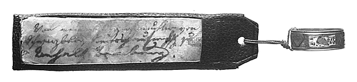 FINGERRING jämte intyg. Av guld med emalj. Bred, jämnbred, med platta sidor på utsidan i guld mot botten av ljusgrön emalj fem olika instrumen. På ringens insida otydligt ristad: C W. Utan stämplar. Tyskt arbete från 1700-talets slut. Intyg: Skrivet med bläck och tysk stil på papper av landgrevinnan Marie av Hessen-Philippsthal, senare uppklistrat på tyg och omslaget med gelatinpapper. Längd: 5,7 cm, bredd: 1,5 cm. Gåva till Wilhelmina von Hallwyl julafton 1896 från hennes mor, inköpt av denne hos antikvitetshandlare Ed Kahlert, Tyskland.