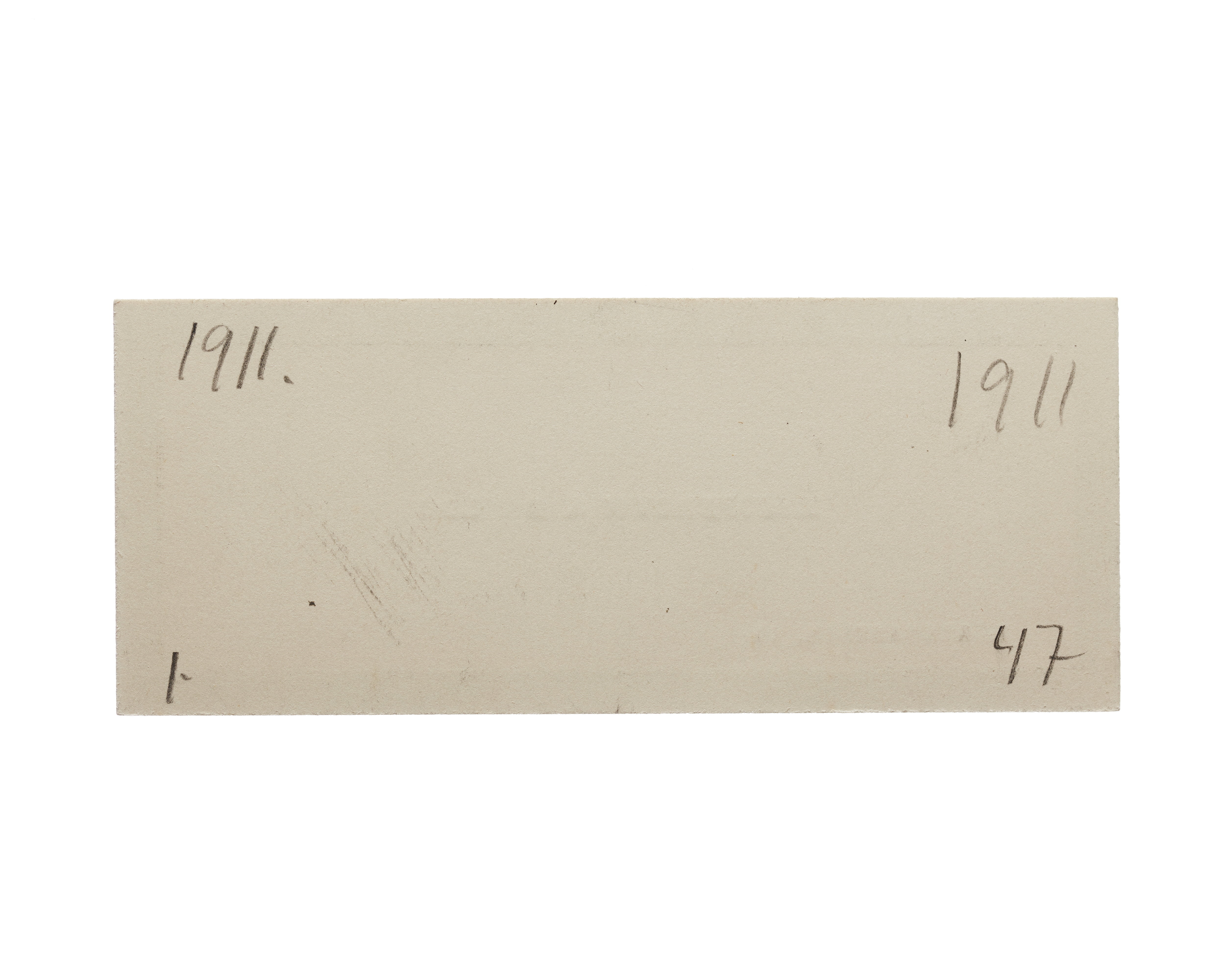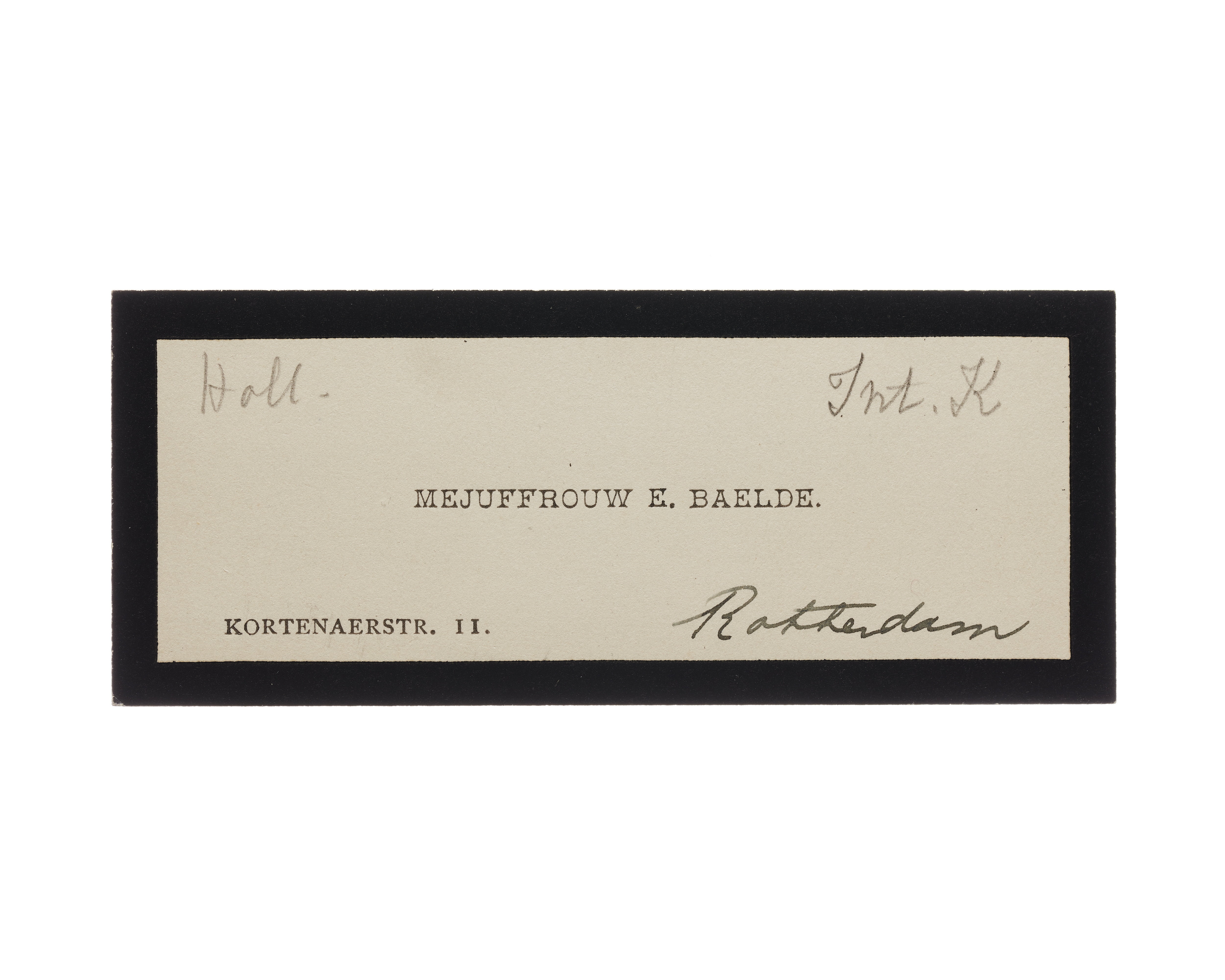 Ett visitkort från Mejuffrouw E. Baelde, daterat 1911, adress (nedre vänstra hörnet) Kortenaerstr. 11. På nedre högra hörnet står med handskrift "Rotterdam". Överlämnat i samband med Internationella kvinnoförbundets kongress i Stockholm 1911.