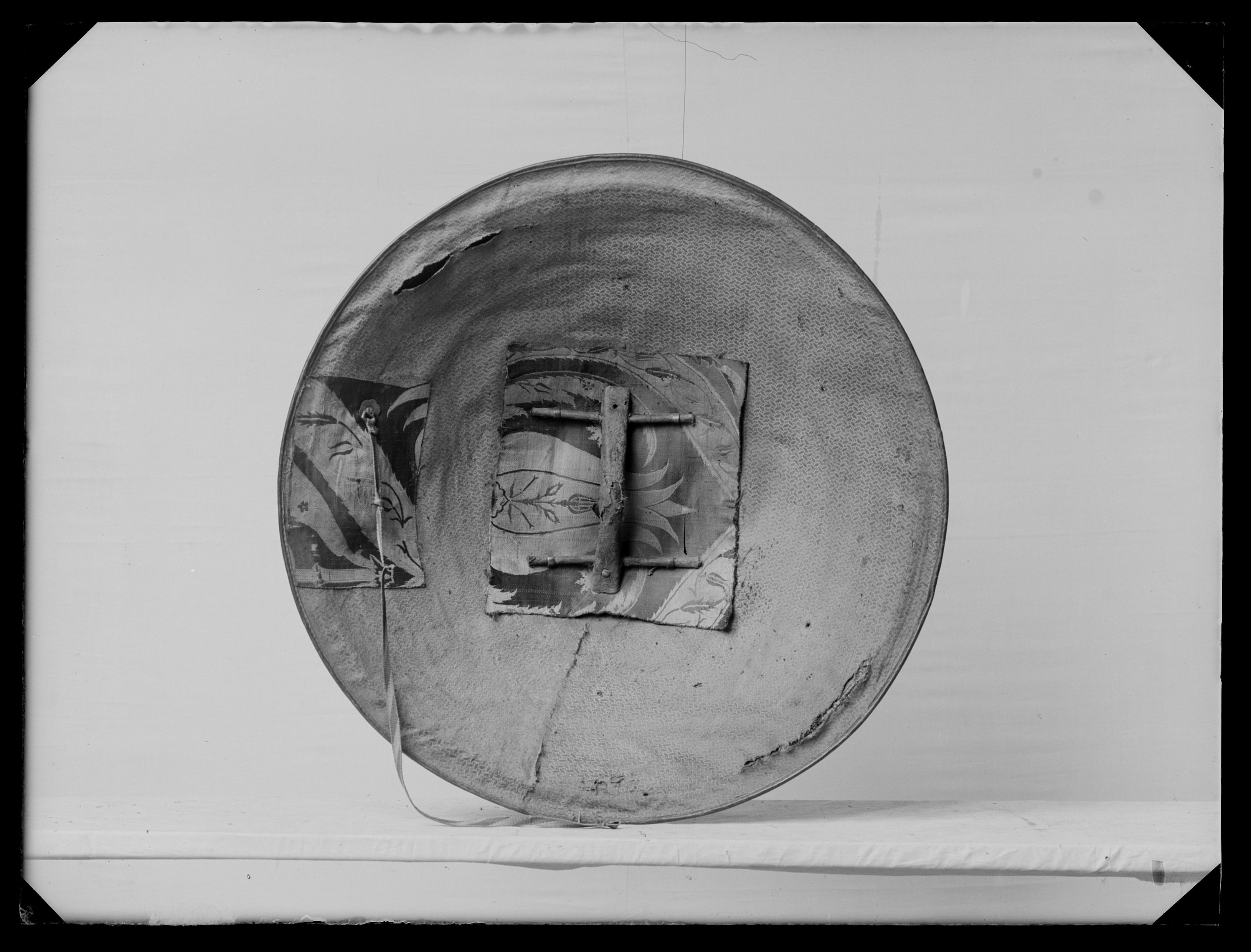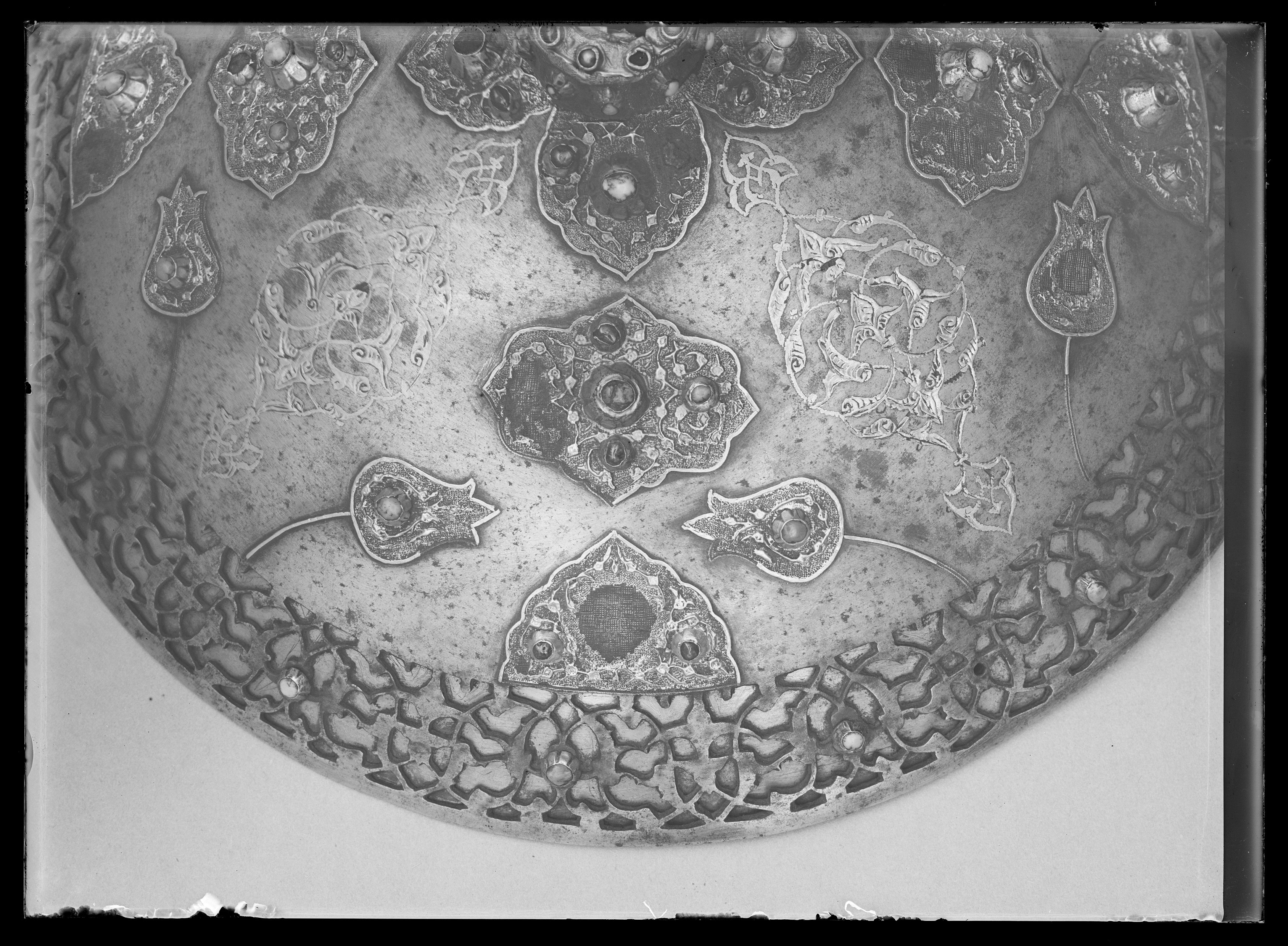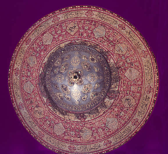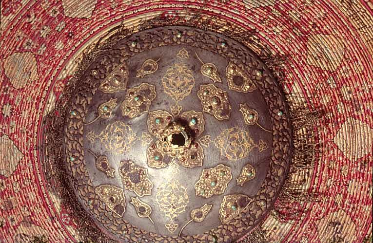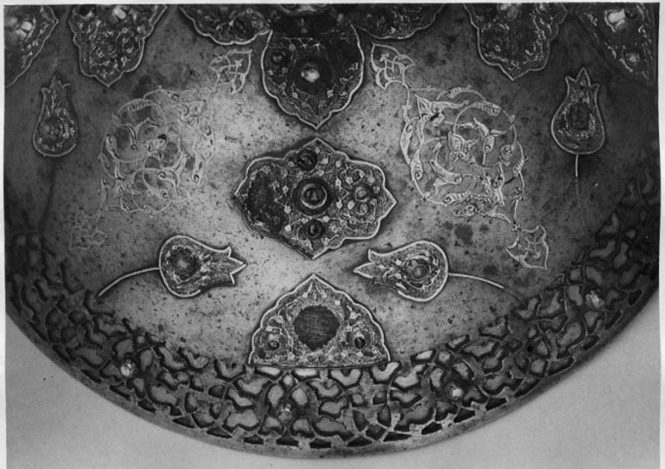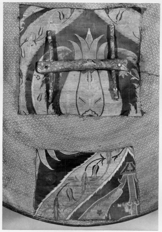 Rörsköld, uppbyggd av 48 synliga grenar (?) lindade och broderade med silke i flera färger gult, rött, grönt, svart, yttersta ringen täckt med en smal grön läderremsa. Ytterst fem ringar omväxlande täckta med rött silke och flätband i svart och guld. Därinnanför en 40 mm bred bård med 12 korantexter i svart mot gul botten och däremellan fyrpassformiga kartuscher med blommor mot röd botten. Därinnanför en 105 mm bred bård med röd botten och kantringar med flätband i svart och gult, i det röda fältet ett glest rankverk av blommor samt 12 spetsovala, stående kartuscher med tre olika kinesiserande djurmotiv, 6 av dem ockrafärgade, högervända lejon (?) mot silverfärgad botten, 3 åt h vända svarta djur (tjurar?) med huvudena vända bakåt mot guldfärgad botten och tre silverfärgade liknande djur (hjortar?) mot guldbotten. Mellan denna ring och centrumplattan en bård ca 45 mm bred med blomdekor. Välvd sköldbuckla - centrumplatta, d: ca 150 mm bestående ytterst av en 25 mm bred, genombruten bård med rankverk mot förgylld (mässings-)bakgrund. Symmetriskt är rankverket besatt med 14 turkoser i blomformiga fattningar (två saknas, den ena fattningen kvar). Därinnanför en symmetrisk dekor bestående av korsformigt arrangerade kartuscher av guldplåt med rankdekor mot prickad bakgrund, kabochonslipade ädelstenar (turkoser och rubiner?) i höga, blomformiga, släta fattningar. Vid den genombrutna bården fyra halva, spetsovala kartuscher med en turkos flankerad av två små röda stenar (en platta komplett, på en saknas mittsten med fattning, på en saknas högra stenen med fattning, på den sista saknas högra stenen med fattning liksom mittstenen, men där finns delar av fattningen kvar. Kartuscherna flankeras av två mot kartuscherna vända tulpanformiga plattor på smala guldskaft, på varja blomma en turkos (fyra turkoser med fattningar saknas). Därinnaför fyra liggande spetsovala kartuscher med fem stenar, en större turkos i mitten, flankerad av två mindre turkoser horisontellt och två röda stenar vertikalt (på en platta saknas stenar och fattningar kl 9 och 12, på en mittsten och stenen kl 9 med fattningar, på en saknas sten nr 6, fattningen kvar medan på den sista plattan saknas sten och fattning kl 9). Sköldbucklans mitt uppdriven i en 17 mm hög, öppen ring, utvändigt täckt med en tunn guldskålla. Kanten svagt godronnerad och dekorerad med 10 turkoser med spetsovala fattningar (en saknas liksom skållan där). På ovansidan fanns ursprungligen en större sten i mitten, omgiven av 10 små stenar, varannan turkos, varannan röd (två röda stenar med fattningar saknas). Ringen omges av en fyrpassformig kartusch med tre stenar på varje blad (en komplett, på en saknas sten och fattning kl 3, på en saknas mittstenen, på den sista likaså sten och fattning kl 3). Mellan korsarmarna symmetriska spetsovala kartuscher med ändblad i form av rankverk av inslaget guld. Sköldbucklan omges av en mycket sliten silkefrans i gult och svart (?). Skölden invändigt fodrad med ett finmönstrat sidentyg i form av romber och cirklar i gult mot grön bakgrund. En söm går ifrån ytterkanten snett in mot ena handtagsfästet. På mitten en stoppad kudde och däröver sytt ett rektangulärt stycke sidenbrokad, lampas (kemha eller zerbaft), b ca 250 mm, h ca 225 mm med tulpaner i ett spetsovalt flätverk i guld eller förgyllt silverblekgult och ockragult mot karminröd bakgrund, en nästan hel blomma flankerad av två blad, omgiven av två, förmodligen i fläta lagda 60 mm breda blekgula band med flätmönster av tulpaner och blad i rött och ockra. Över kudden fäst ett böjt trähandtag på två igenom handtagets ändar gående smala, runda lister, i sin tur fästade i skölden med fyra platta, förgyllda (?) ringar, en nit gående igenom handtagets ytterdel strax utanför listen (den andra saknas). Handtag och lister klädda med en grön brokad med blommönster i ockra. Vid ytterkanten, parallellt med handtaget ytterligare en kudde, täckt med samma röda brokadtyg, l: 185 mm, b 130 mm, två hål för fästning av armringen.