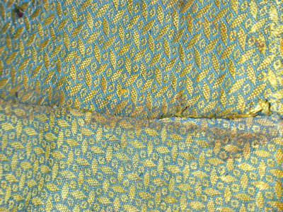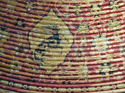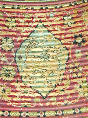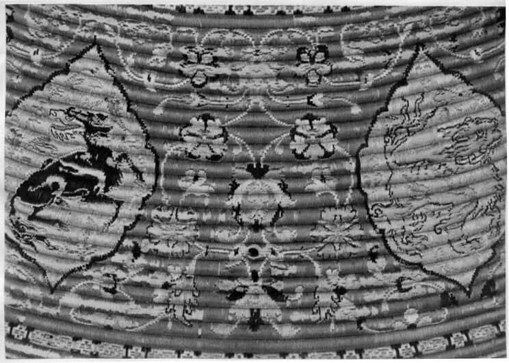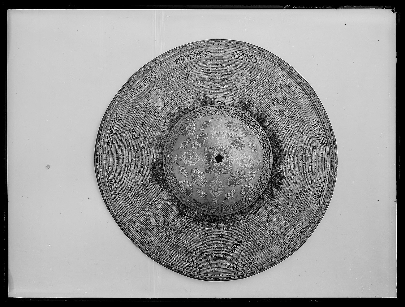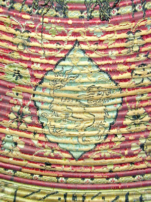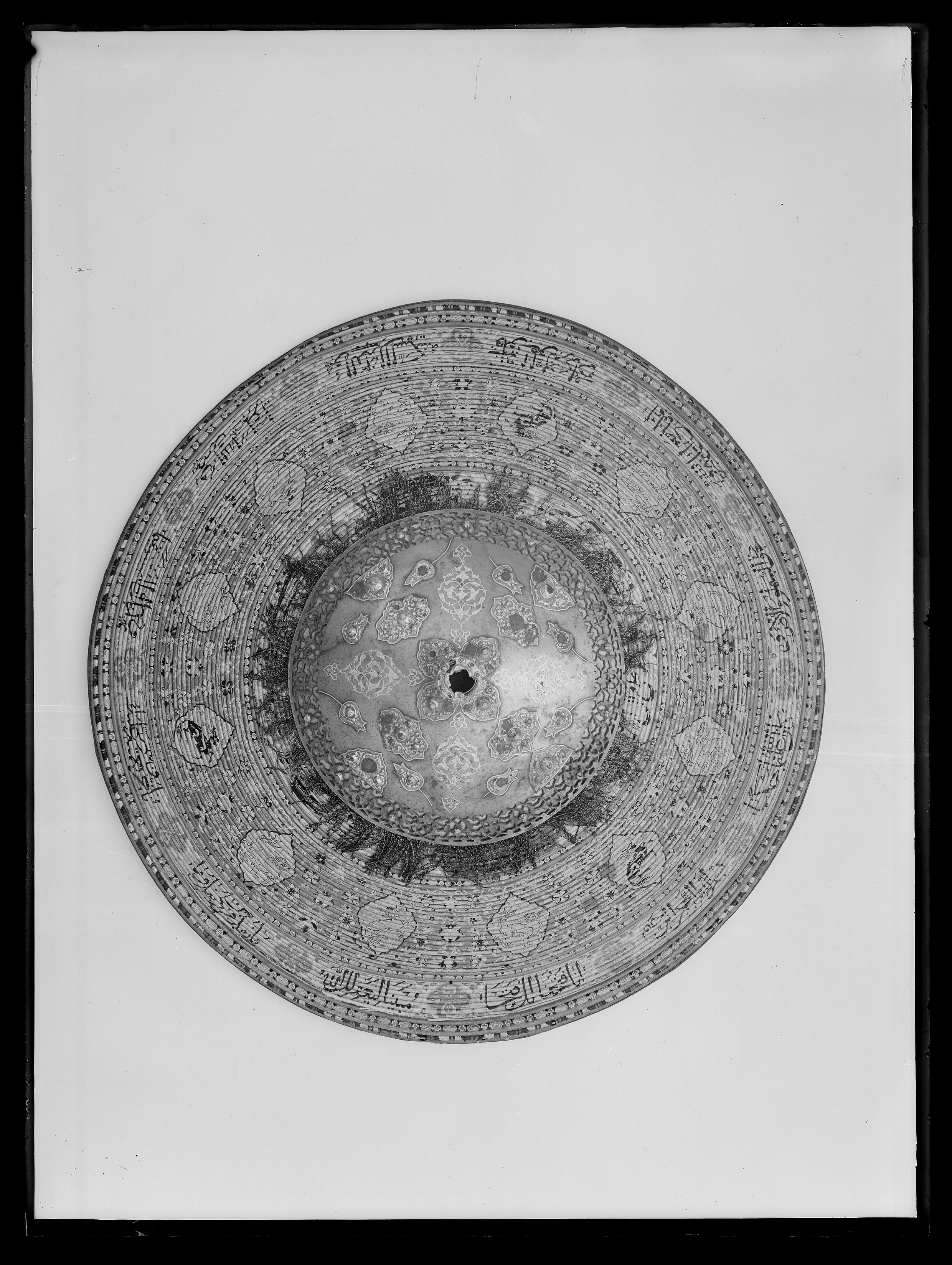 Rörsköld, uppbyggd av 48 synliga grenar (?) lindade och broderade med silke i flera färger gult, rött, grönt, svart, yttersta ringen täckt med en smal grön läderremsa. Ytterst fem ringar omväxlande täckta med rött silke och flätband i svart och guld. Därinnanför en 40 mm bred bård med 12 korantexter i svart mot gul botten och däremellan fyrpassformiga kartuscher med blommor mot röd botten. Därinnanför en 105 mm bred bård med röd botten och kantringar med flätband i svart och gult, i det röda fältet ett glest rankverk av blommor samt 12 spetsovala, stående kartuscher med tre olika kinesiserande djurmotiv, 6 av dem ockrafärgade, högervända lejon (?) mot silverfärgad botten, 3 åt h vända svarta djur (tjurar?) med huvudena vända bakåt mot guldfärgad botten och tre silverfärgade liknande djur (hjortar?) mot guldbotten. Mellan denna ring och centrumplattan en bård ca 45 mm bred med blomdekor. Välvd sköldbuckla - centrumplatta, d: ca 150 mm bestående ytterst av en 25 mm bred, genombruten bård med rankverk mot förgylld (mässings-)bakgrund. Symmetriskt är rankverket besatt med 14 turkoser i blomformiga fattningar (två saknas, den ena fattningen kvar). Därinnanför en symmetrisk dekor bestående av korsformigt arrangerade kartuscher av guldplåt med rankdekor mot prickad bakgrund, kabochonslipade ädelstenar (turkoser och rubiner?) i höga, blomformiga, släta fattningar. Vid den genombrutna bården fyra halva, spetsovala kartuscher med en turkos flankerad av två små röda stenar (en platta komplett, på en saknas mittsten med fattning, på en saknas högra stenen med fattning, på den sista saknas högra stenen med fattning liksom mittstenen, men där finns delar av fattningen kvar. Kartuscherna flankeras av två mot kartuscherna vända tulpanformiga plattor på smala guldskaft, på varja blomma en turkos (fyra turkoser med fattningar saknas). Därinnaför fyra liggande spetsovala kartuscher med fem stenar, en större turkos i mitten, flankerad av två mindre turkoser horisontellt och två röda stenar vertikalt (på en platta saknas stenar och fattningar kl 9 och 12, på en mittsten och stenen kl 9 med fattningar, på en saknas sten nr 6, fattningen kvar medan på den sista plattan saknas sten och fattning kl 9). Sköldbucklans mitt uppdriven i en 17 mm hög, öppen ring, utvändigt täckt med en tunn guldskålla. Kanten svagt godronnerad och dekorerad med 10 turkoser med spetsovala fattningar (en saknas liksom skållan där). På ovansidan fanns ursprungligen en större sten i mitten, omgiven av 10 små stenar, varannan turkos, varannan röd (två röda stenar med fattningar saknas). Ringen omges av en fyrpassformig kartusch med tre stenar på varje blad (en komplett, på en saknas sten och fattning kl 3, på en saknas mittstenen, på den sista likaså sten och fattning kl 3). Mellan korsarmarna symmetriska spetsovala kartuscher med ändblad i form av rankverk av inslaget guld. Sköldbucklan omges av en mycket sliten silkefrans i gult och svart (?). Skölden invändigt fodrad med ett finmönstrat sidentyg i form av romber och cirklar i gult mot grön bakgrund. En söm går ifrån ytterkanten snett in mot ena handtagsfästet. På mitten en stoppad kudde och däröver sytt ett rektangulärt stycke sidenbrokad, lampas (kemha eller zerbaft), b ca 250 mm, h ca 225 mm med tulpaner i ett spetsovalt flätverk i guld eller förgyllt silverblekgult och ockragult mot karminröd bakgrund, en nästan hel blomma flankerad av två blad, omgiven av två, förmodligen i fläta lagda 60 mm breda blekgula band med flätmönster av tulpaner och blad i rött och ockra. Över kudden fäst ett böjt trähandtag på två igenom handtagets ändar gående smala, runda lister, i sin tur fästade i skölden med fyra platta, förgyllda (?) ringar, en nit gående igenom handtagets ytterdel strax utanför listen (den andra saknas). Handtag och lister klädda med en grön brokad med blommönster i ockra. Vid ytterkanten, parallellt med handtaget ytterligare en kudde, täckt med samma röda brokadtyg, l: 185 mm, b 130 mm, två hål för fästning av armringen.