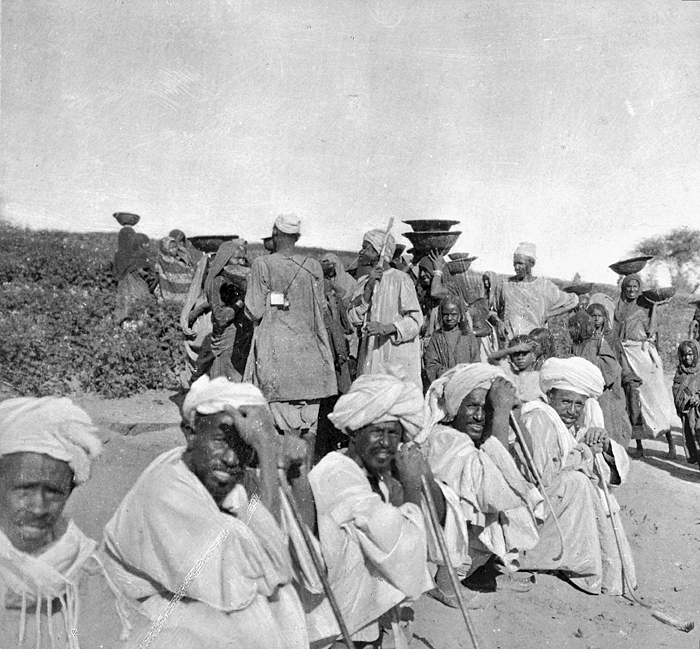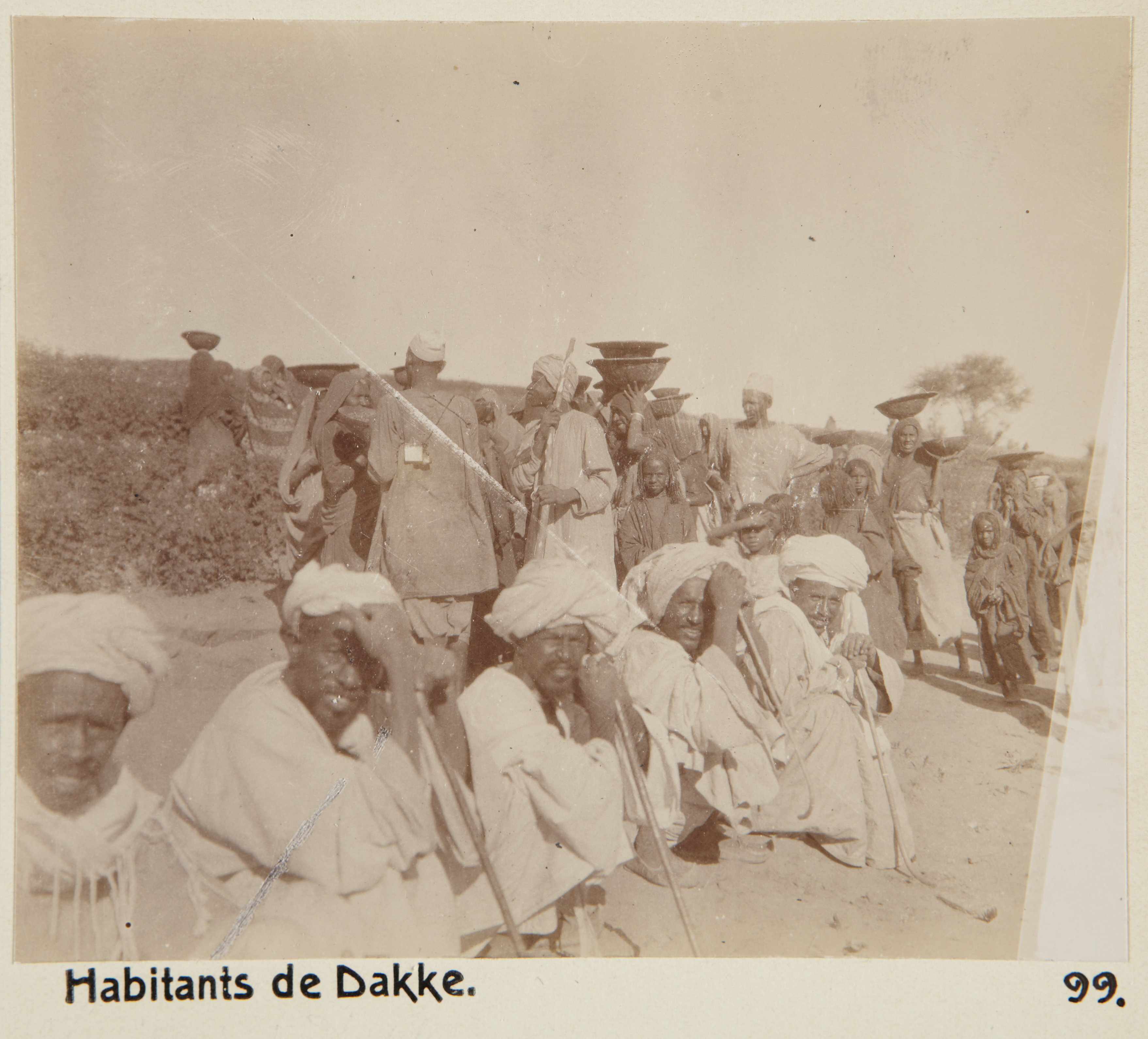 Invånare i Dakka (Dakke), Egypten. Text på fotografiet: Habitants de Dakke. Fotografierna LXVI:M.01.- 201. kommer från resan till Egypten och Sudan som Wilhelmina och Walther von Hallwyl gjorde vintern 1900-1901. De lämnade Sverige den 5 november 1900 och fortsatte från Egypten till Palestina den 28 mars 1901. Med på resan var döttrarna Ellen med maken Henric de Maré och Irma med maken Wilhelm von Geijer. Wilhelminas sällskapsdam, fröken Ida Uhse reste också med. Under en del av resan anslöt sig ledamoten av Internationella domstolen i Kairo, assessorn Otto Conrad Waldemar Cedercrantz med makan Anna Elisabeth. Vid resan uppför Nilen hade Walther von Hallwyl hyrt ångfartyget Columbia med besättning. Båtresan startade i Kairo 27 december 1900, gick ända till Wadi Halfa varifrån man reste vidare med tåg till Khartum och tillbaka till Wadi Halfa. Båten vände åter i riktning mot Kairo, men det verkar som att sällskapet tog tåg sista biten, från Luxor. Henric och Ellen de Maré samt fru Cedercrantz lämnade båten redan då de passerade Luxor första gången. Resten av sällskapet återvände till Kairo den 1 mars. Fotografierna LXVI:M.01.-120. togs av resenärerna själva, de största av Ellen de Maré, de mellersta av Wilhelmina von Hallwyl och de minsta av Wilhelm von Geijer. Resten köptes av professionella fotografer i Kairo, de flesta från Studio Photogr. Artistique G. Lekegian & Cie. Alla uppgifter kommer från Ida Uhses reseanteckningar.