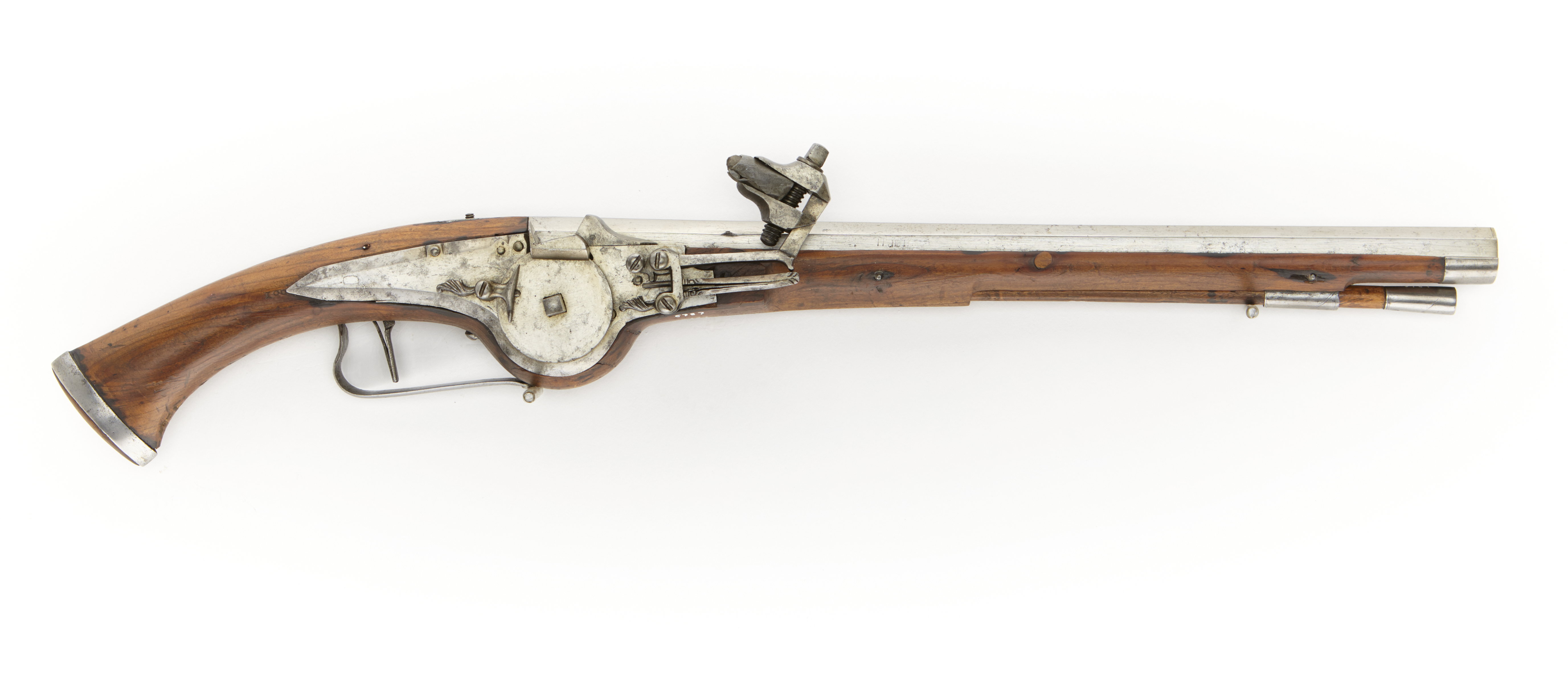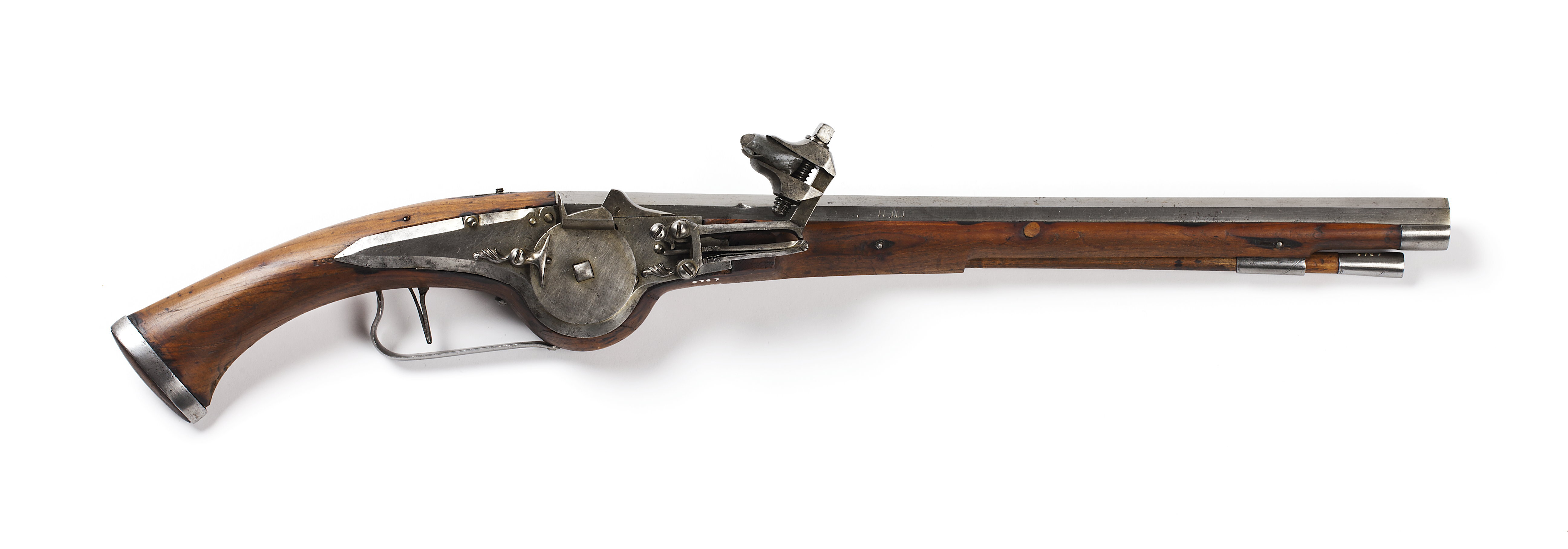 1710 års inventarium p. 42, rum II, tillsammans med inv.nr. 5786 "70-100-1 Par korta D:o (Pijstoler) efwen lijcka med de förre". Åttkantig, slätborrad pipa av stål. Två häften. Hjullås med plant låsbleck med fasade kanter. Låsblecket är utsvängt för hjulet. Hjulet fasthålles av en krampa med en vertikal stålstav fäst kl.9. Hane med lös underkäke. Brun helstock av trä, kolven har spetsoval genomskärning med stålband kring kolvens bakre del. Kolven är utsvängd för hjulet. Överrörka och näsband av stål. Varbygel av stål. Tillbehör: Laddstock av trä, doppsko av stål. Märkt: 100 bakom låsblecket, stanstyp 5376.