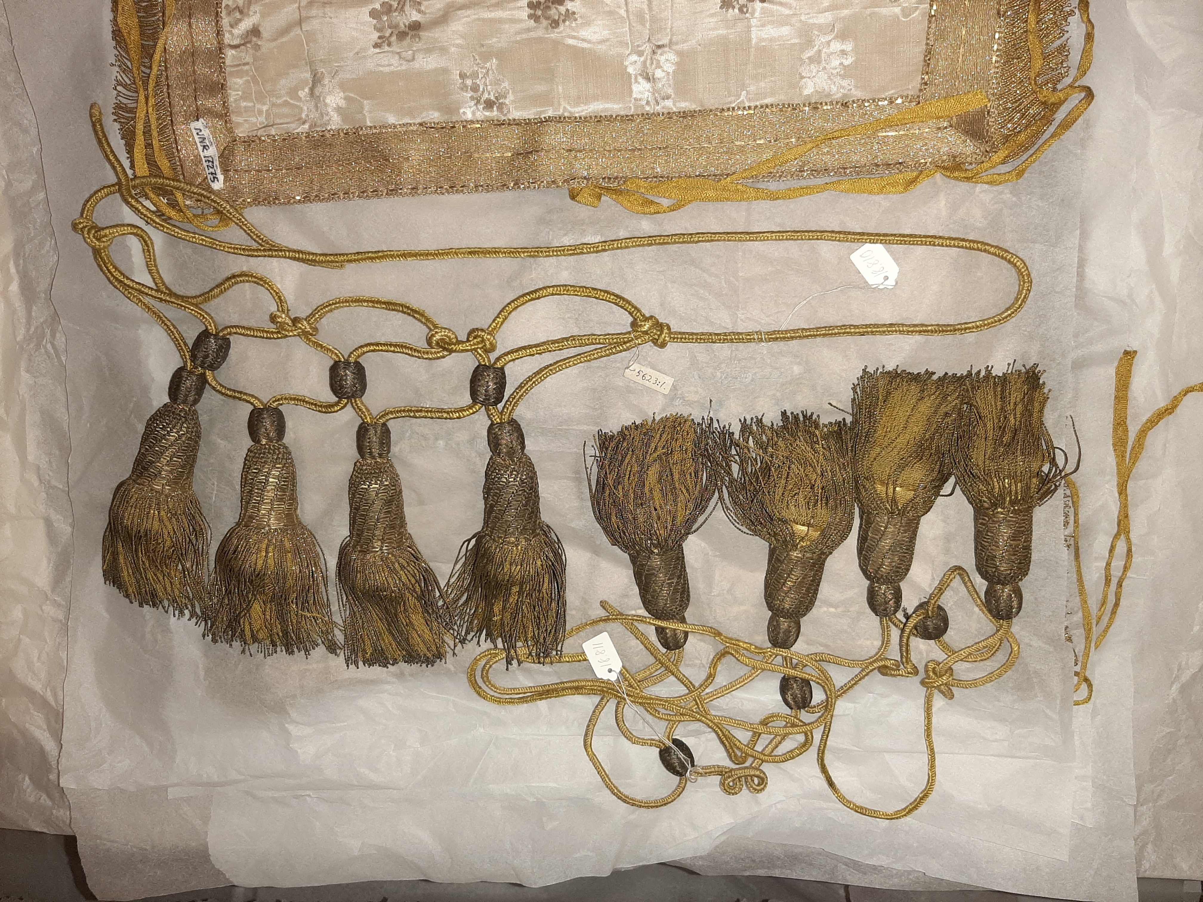 Banderoll av gult silke med fyra tofsar av gult silke och guldtråd. Häroldstrumpet nr 9244.