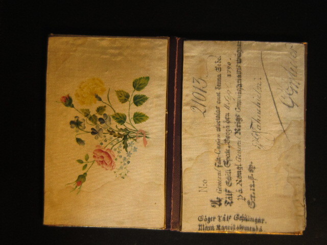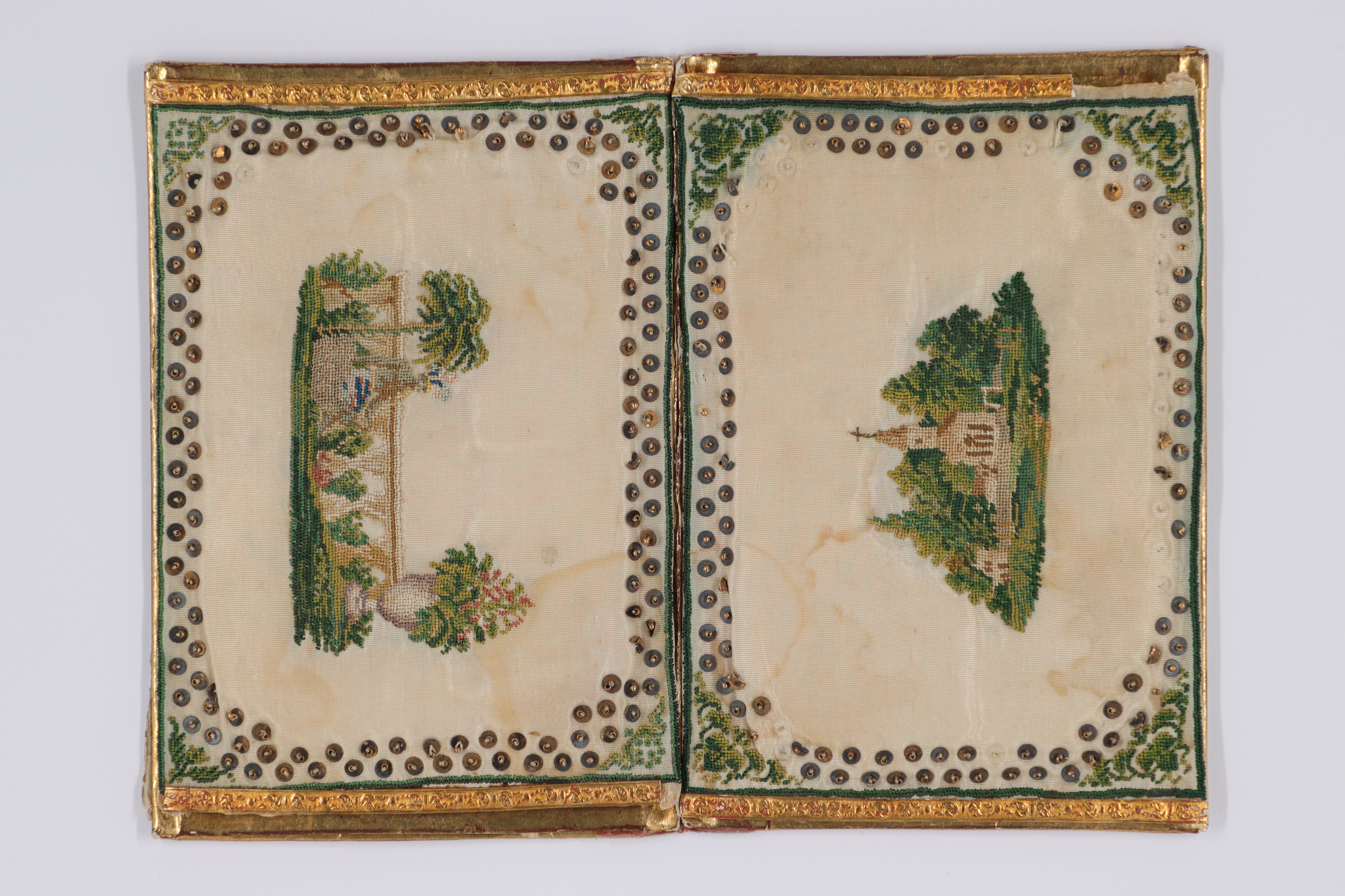 Plånbok av vitt siden med petit point-broderier och paljetter. Kant av guldfärgat, präglat papper. På ena halvan ett motiv med en kyrka i ett landskap. På andra halvan växter vid en balustrad. På insidan måleri på siden. En blomsterbukett med rosor, en nejlika, violer och förgätmigej på ena halvan. På andra halvan en sedelavbildning daterad till 21 sept 1790 och med sedelnumret 21013.