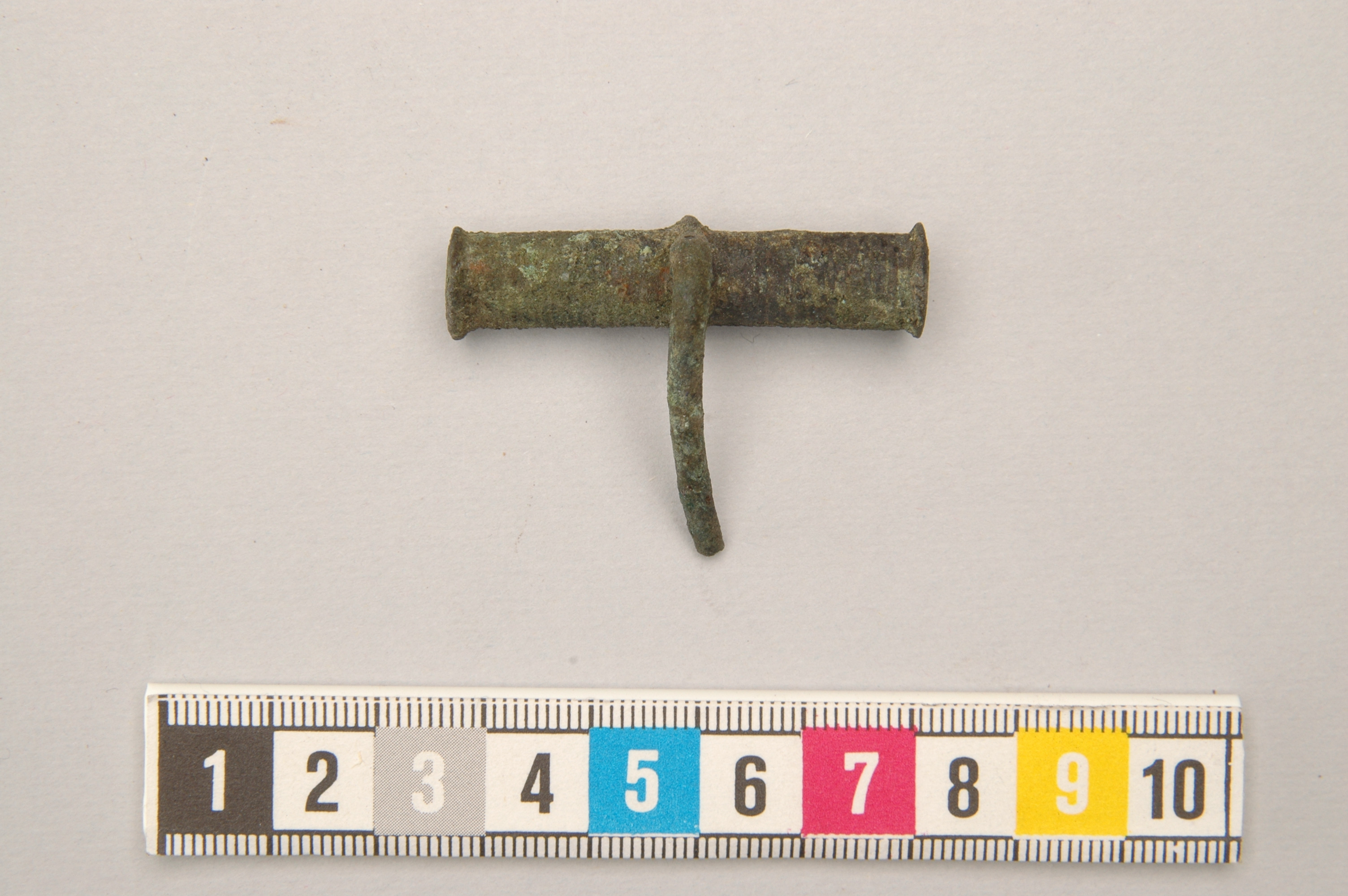 Nål av brons med huvud i form av en tvärställd, massiv, trind ten. Ornerad med imiterad spiralbindning. Stjälken är avbruten.