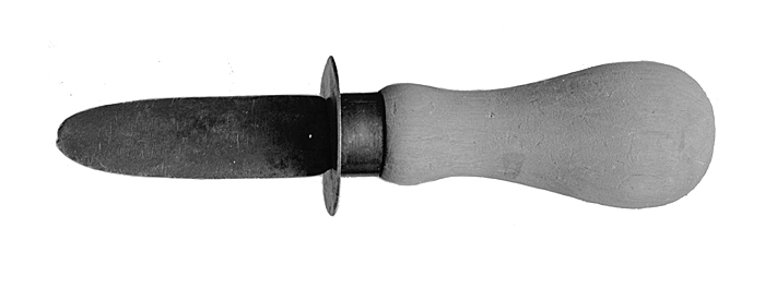 KNIV (fiskrensnings-) Av stål, med träskaft. Blad dubbeleggat, med rundad udd och svagt flackrundade sidor; vid skaftroten en rakt utstående tunn fläns. Skaft av vitbok, svarvat och långsträckt päronformigt, med en genom hela skaftet gående tånge samt med inre änden utsvälld och avlsutad i en kort tapp, skodd med en mässingsring. Längd: 16,6 cm. Blad, bredd: 2,3 cm. Skaft, längd: 9,3 cm.
