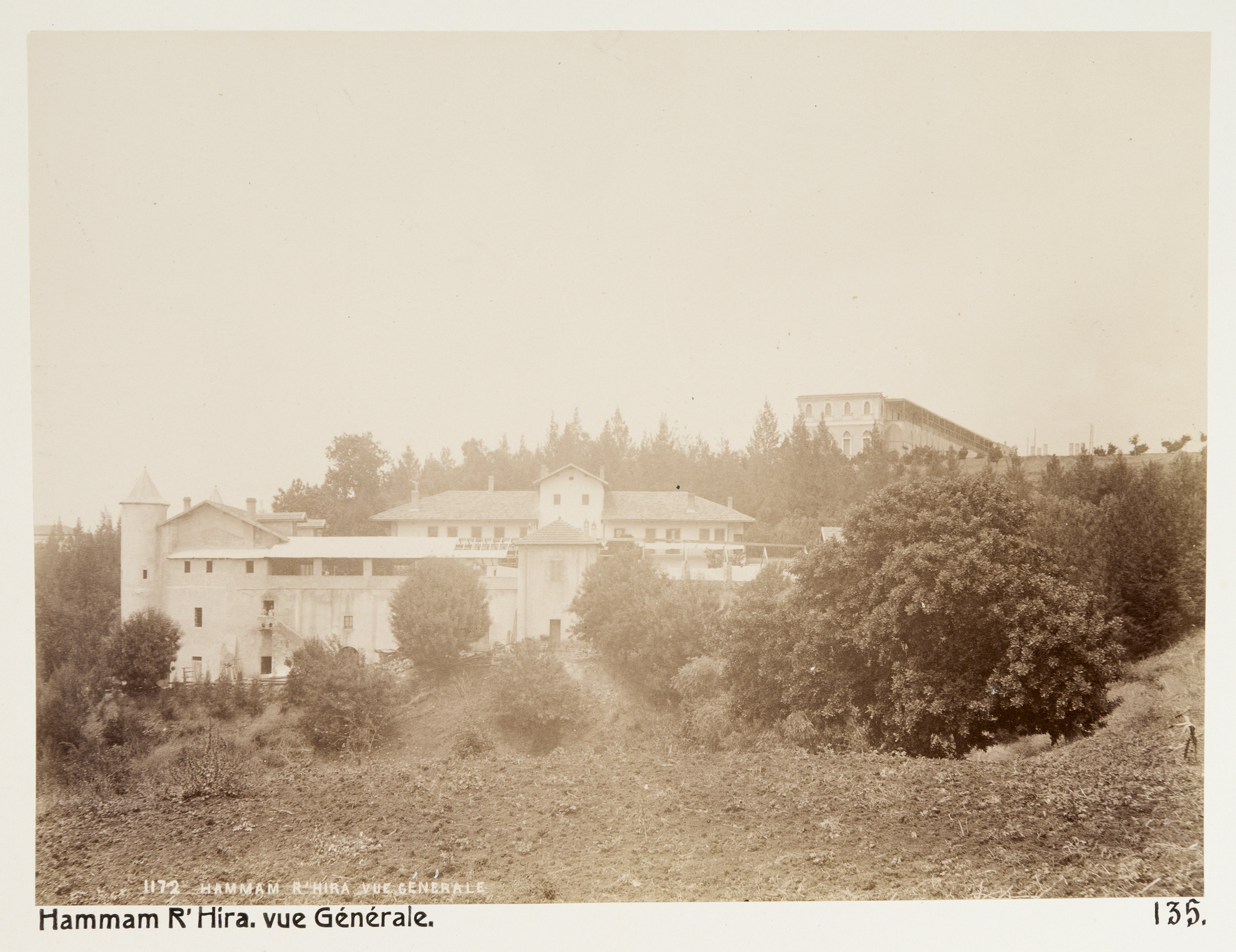 Hammam R'Hira (Hammam Righa). Översiktsvy. Bilden är en dubblett till LXVI:F.135. Bilderna med inventarienummer LXVI:K.H.01.-137. är inköpta av Johanna Kempe, f. Wallis, i Alger, Biskra, Tunis, Constantine, Oran och Blidah vid hennes vistelse i nämnda städer tillsammans med sin dotter och svärson, Wilhelmina och Walther von Hallwyl, dotterdottern Irma samt fröknarna Caroline Pflaum och Ida Uhse under deras resa genom Algeriet och Tunisien samt åter över Schweiz 11 februari - 19 maj 1889. Förestående uppgifter lämnade med ledning av fröken Ida Uhses Reseanteckningar. Vissa av bilderna är dubbletter till bilder i inventarienummerserien LXVI:F.01.-138. som köptes in av Wilhelmina von Hallwyl under samma resa.
