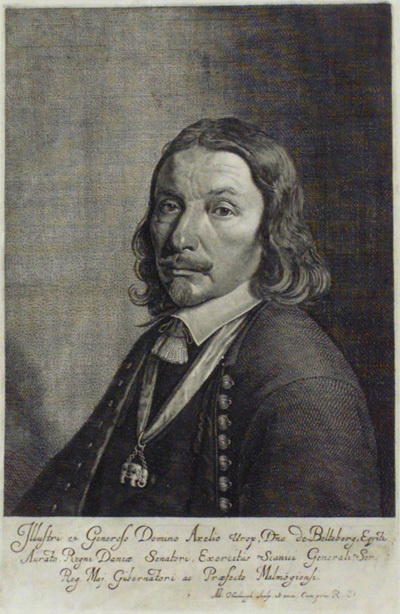 Porträtt av Axel urup till Baeltebjerg, riksråd (1655), 1601-1671, förläning Malmöhus i Danmark. Kopparstick, 1650-tal.