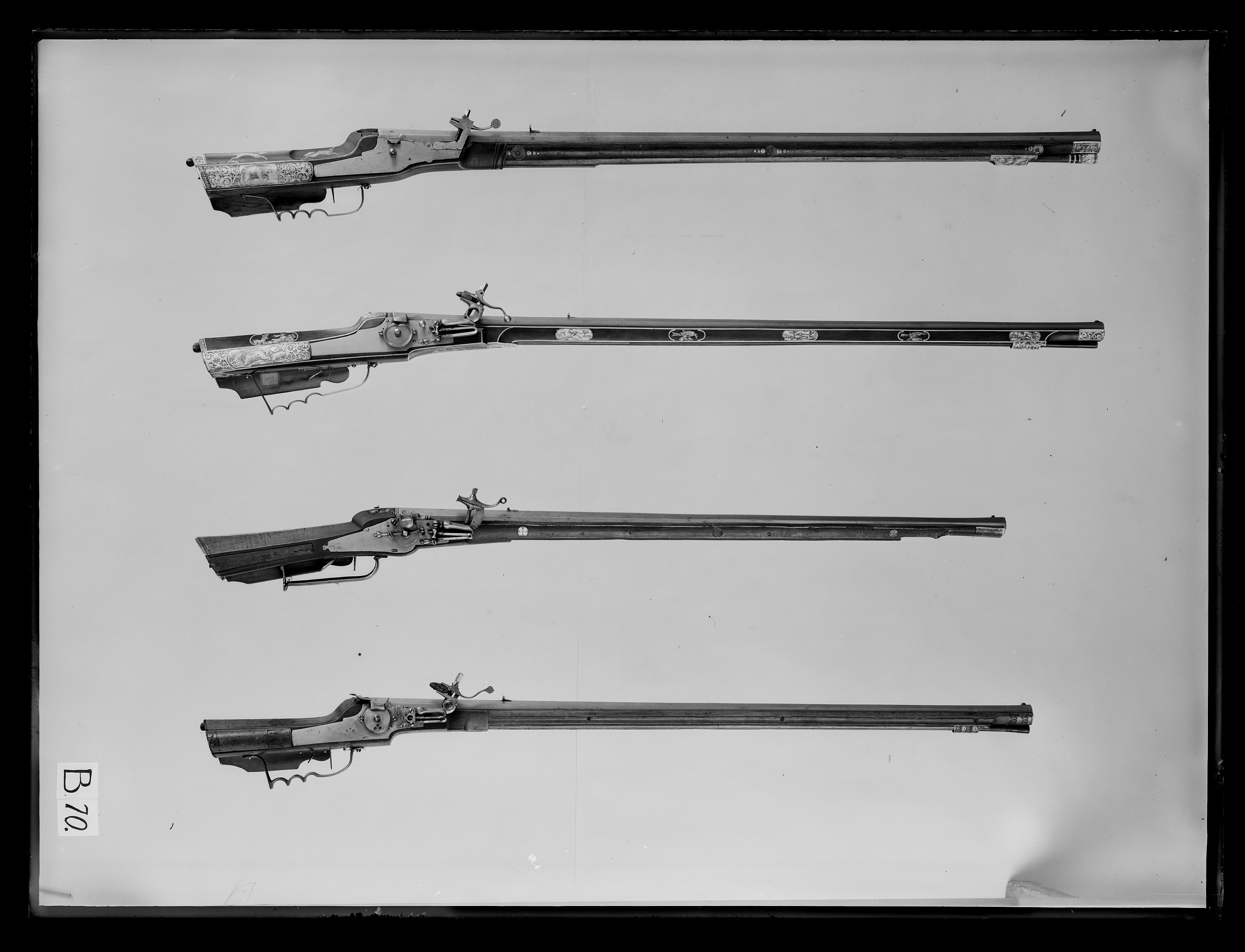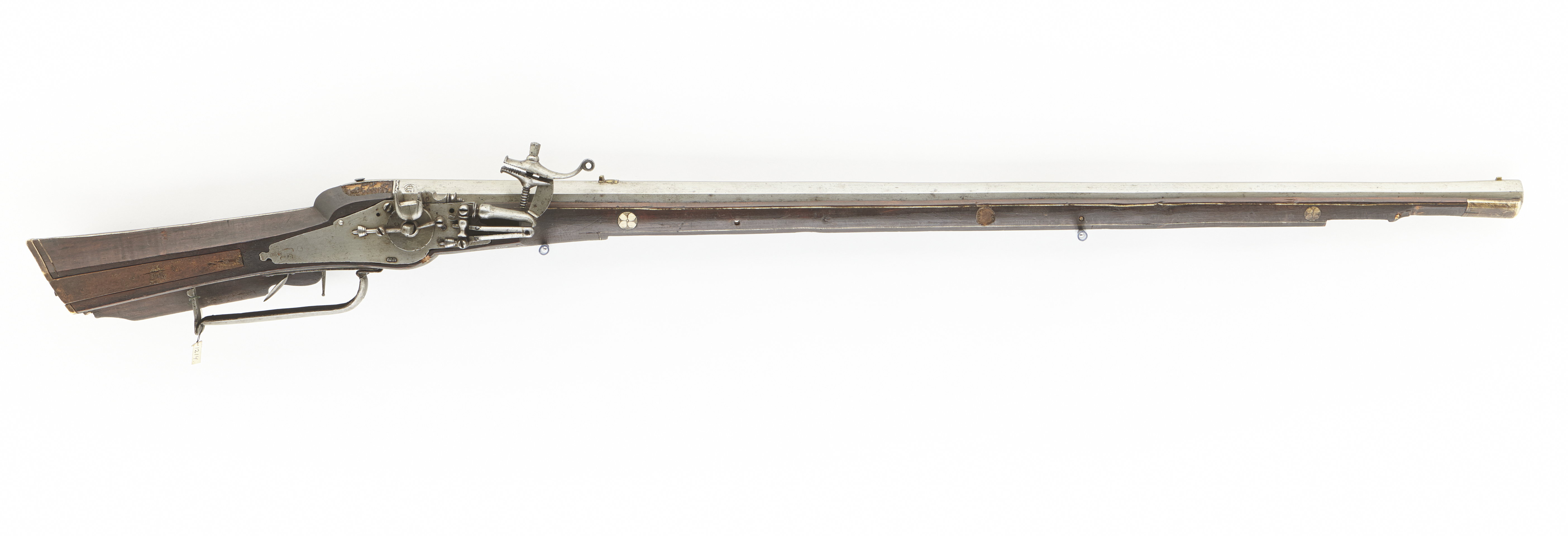 Åttsidig pipa av stål med åtta räfflor och skålade bommar. Kantlinjer längs siktskåran. På kammaren två stämplar: I T och en otydlig. Riktmedel: Siktskåra från krysskruv till sikte. Sikte av mässing med skålad grop i klacken framför siktet. Spolformigt stolpkorn av mässing. Fästning: Tre häften. Pipan fäst med krysskruv (urspr.underifrån?) samt två pipstift av stål. Hjullås av stål med plant låsbleck, l: 200 mm, utvändigt hjul fäst med tvärgående skena, fastskruvad kl.3 o 9. Från den vänstra skruven utgår ett löv med pokalformig utbuktning. Fängpanna med stor, nedtill rundad, svagt välvd gavel, rak krutskärm, fängpannelock med rörlig arm. Tryckknappen saknas. Hane med lös underkäke, Fyrsidigt käkskruvhuvud. Uppåtböjt fingergrepp med inrullad ytterände. Rak hanhals, svängd kant framtill. Hankropp med spetsovalt tvärsnitt, balusterformig hanstudel. Hanfjäder med rundade ytterkanter, liten skålning i vinkeln. Fjäderlövet utformat som hjulbryggans löv, benet dock kortare. Fästning: Två låsskruvar. Avtryckare med snälltryck. Brun helstock med kolv av tysk typ, kolvlåda och snidad volut på vingen. Bakplåt av ben, fäst med benstift. På hela stocken kantlister av ben. På båda sidor om svansskruvbladet graverade benplattor, mittplattan saknas. Kolvlådelockets platta borta. På framstocken runda beninläggningar med graverade, fyrbladiga blommor. Näsband av ben. Rak, trågformig varbygel.