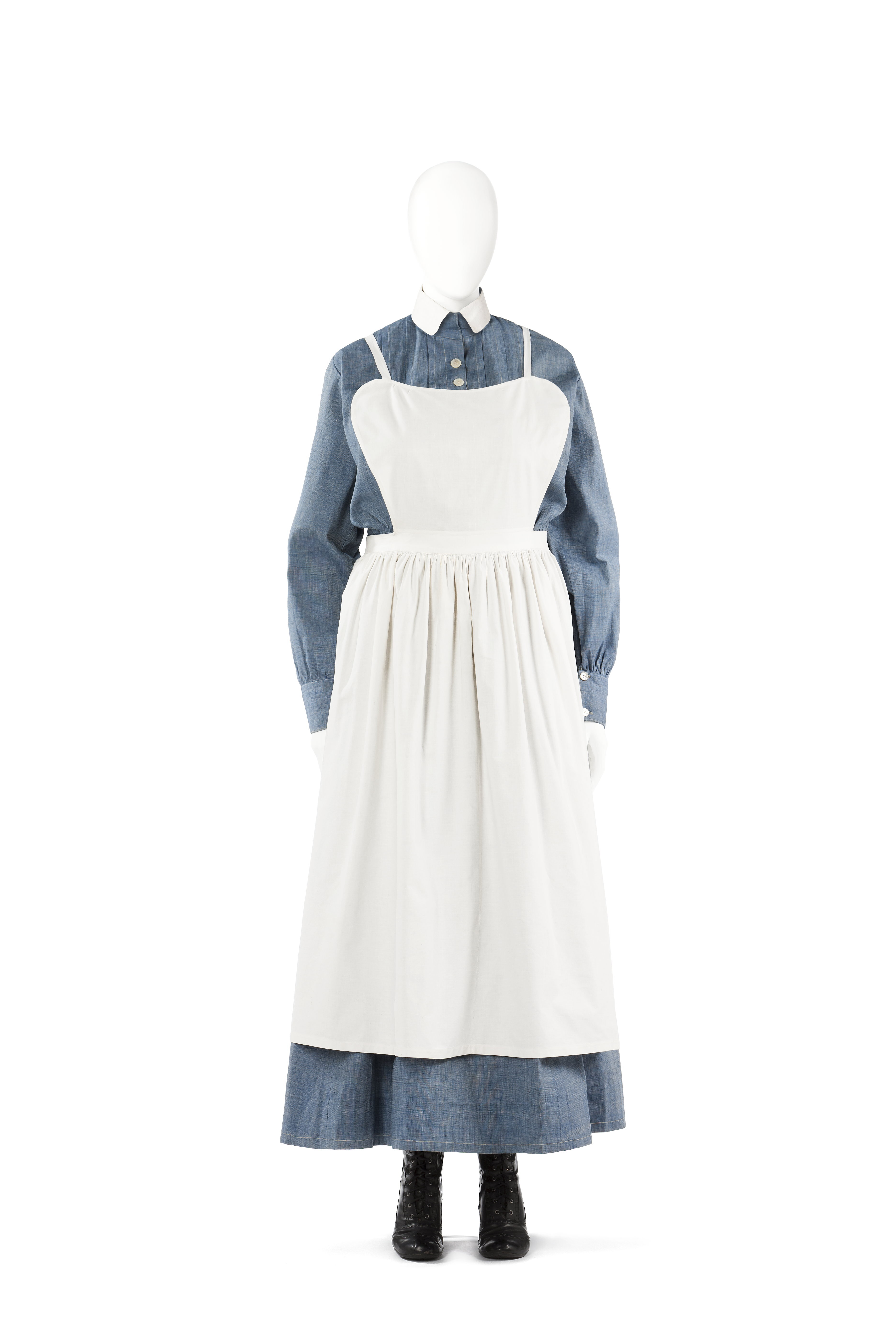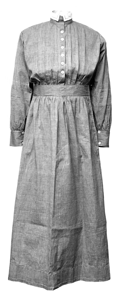 KLÄNNING (vardags för husjungfrun) Blus och kjol i ljusblått bomullstyg s.k. skötersketyg. Tyget tvåskaftat med omväxlande vit och ljusblå varp och mörkblått inslag. Hand- och maskinsytt. Blus: Bestående av två framstycken och ett bakstycke svagt sneddade. Hopsydda med maskinsydd s.k. fransk fällsöm. Framstycken tre längdgående maskinsydda efterveck. Halsringning rund, krage rakt uppstående och knäppt med två tryckknäppen av mässing. Prydnadskrage av vitt tvåskaftat linne med smala kantfållar nedsydda med handsydd enkel hålsöm. Kjol: Bestående av fyra våder, knäppning i vänster sida med två hakar och två breda hyskor, sprund i vänster sida. Kjolens nedre kant brett omviken, alla sömmar sydda med vit bomullstråd, knappar isydda med vitt silke. Blus längd: 49 cm. Bröstvidd: 70 cm Halsvidd: 43,5 cm. Halskrage höjd: 4,8 cm. Midjevidd: 91 cm. Ärm längd: 66 cm. Prydnadskrage längd: 38 cm, bredd: 8 cm. Kjol längd fram: 98 cm, bak: 98 cm, vidd: 2,08 cm. Linning längd: 90 cm. Förfärdigad efter beställning av Wilhelmina von Hallwyl september 1924 hos Knut A.K. Wennerström, A.-B. siden- och manufakturhandlare, Stockholm. Prydnadskrage inköpt av Wilhelmina von Hallwyl hos Bikupan, försäljningsmagasin för svenska fruntimmersarbeten, Stockholm.