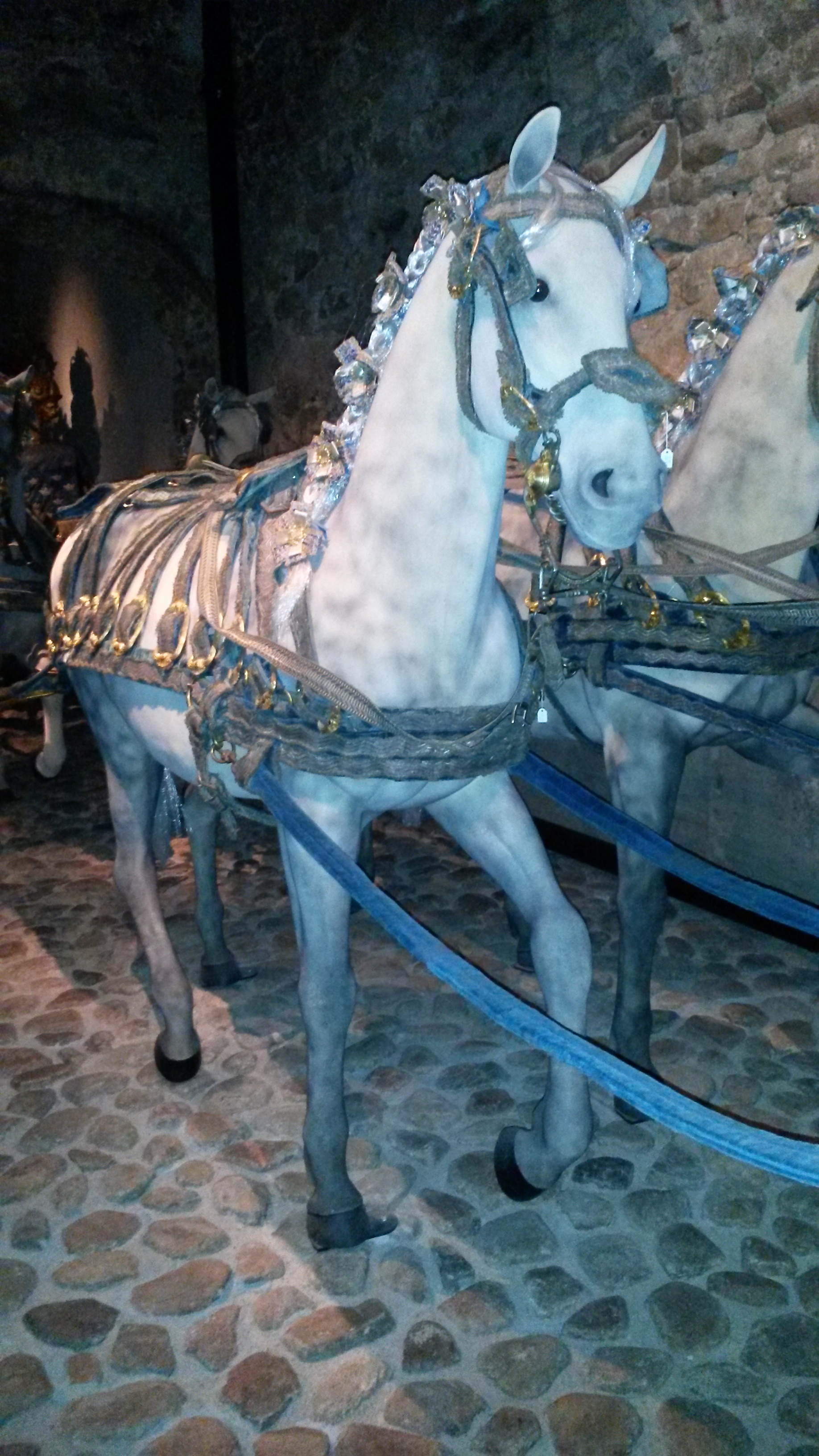 Huvudlag till seldon ( "nr 2", gnr 30:115:2) till kröningsspannet. Remmarnas stommar av läder överklädda med blå sammet på framsidan kantade med 7 mm bred guldfrans och i mitten en 20 mm bred silvergalon. På huvudet en 400 mm lång och 70 mm bred rem som förgrenar sig i två, en främre och en bakre 35 mm breda, på höger och på vänster sida. Vid pannbandet på vänster sida en rosett fastbunden med ett blått linneband. Rosett av blått sidenband kantade med en 10 mm bred guldspets och på mitten en 20 mm bred silverspets. Stomme av linne. I rosettmitten en av silverlan överklädd knapp, kantad av en guldfrans och en mindre rosett i silver. 250 mm från mittpunkten på huvudet avslutas de 4 remmarna. De främre remmarna och den vänstre bakre remmen är fästa i de övre mässingspännena. Mässingspännena 90 mm långa och 60 mm breda. Vid spännet på den främre vänstra remmen en skygglapp 120 mm lång och 110 mm bred, med baksida av blått linne i tuskaft. En fortsättning på de främre remmarna med ett par 500 mm långa och avslutas i de nedre spännena som fäste för betslet. På höger rem sitter fastsatt en 530 mm lång rem. Den bakre vänstra remmen 570 mm lång och avslutas med ett spänne. Utgår från det övre vänstra spännet att fästas i jämnhöjd med det högre främre spännet. Anmärkning: Pannbandet sitter endast fäst i vänster sida. En skygglapp saknas på höger sida (?), och 150 mm av av höger rem saknas. Sammeten trasig. Konserverad. (Beskrivning avser föremålet innan konserving).