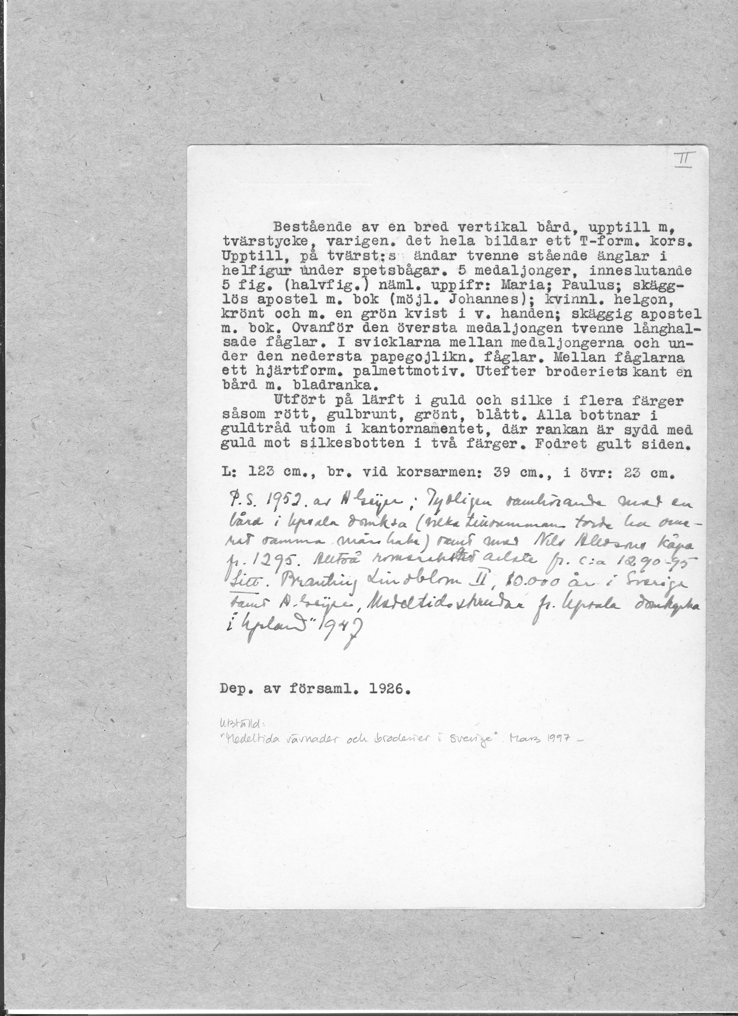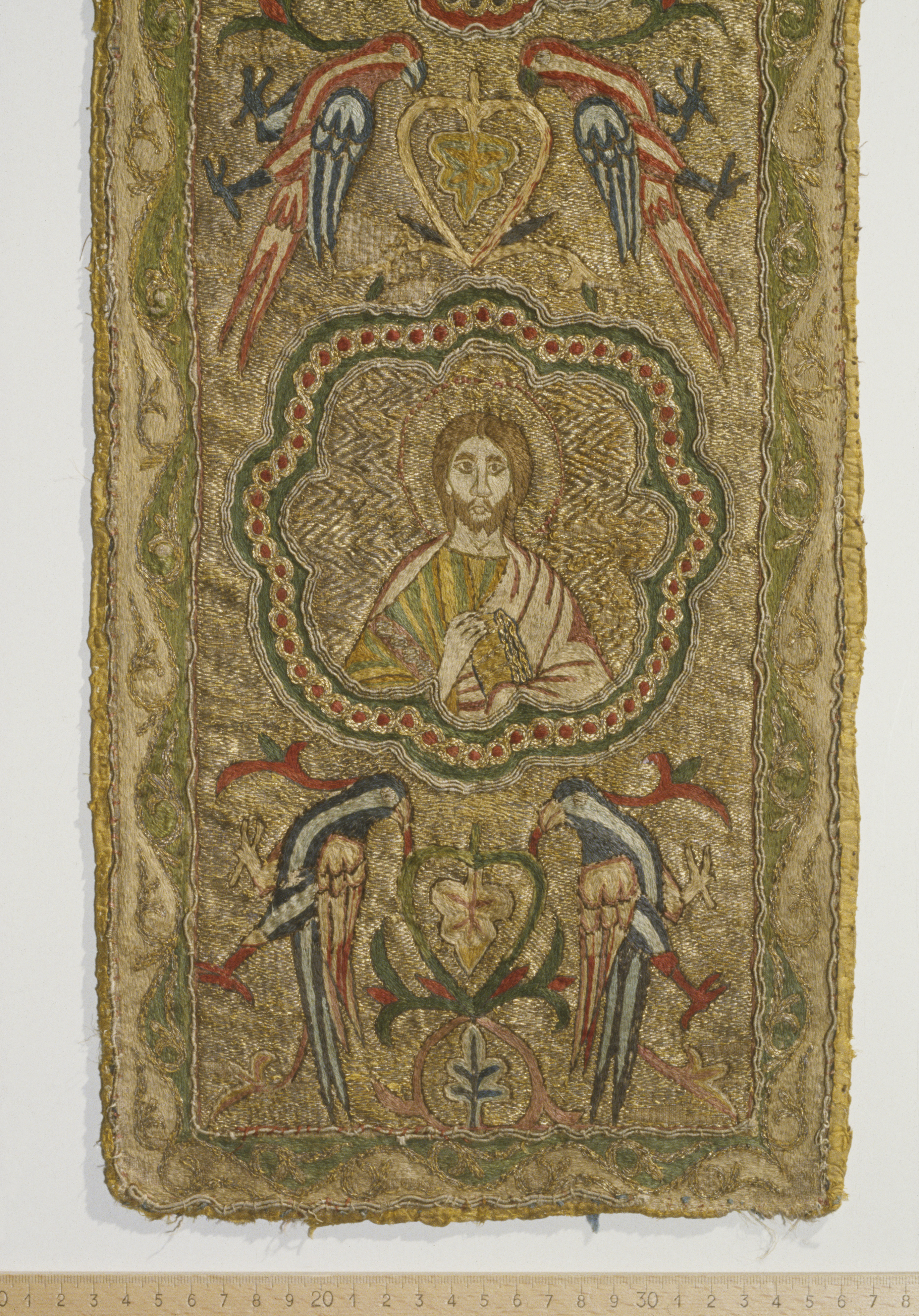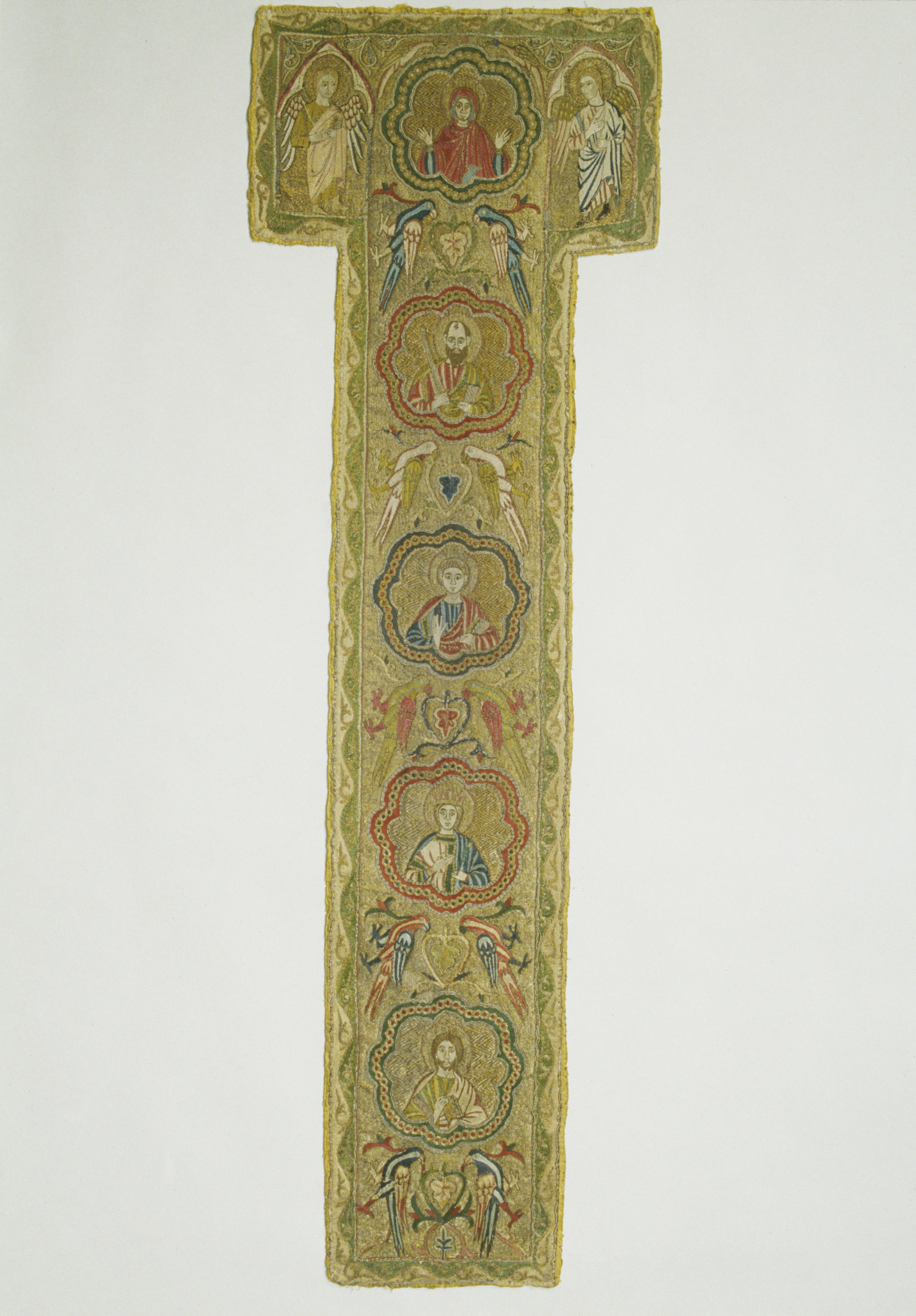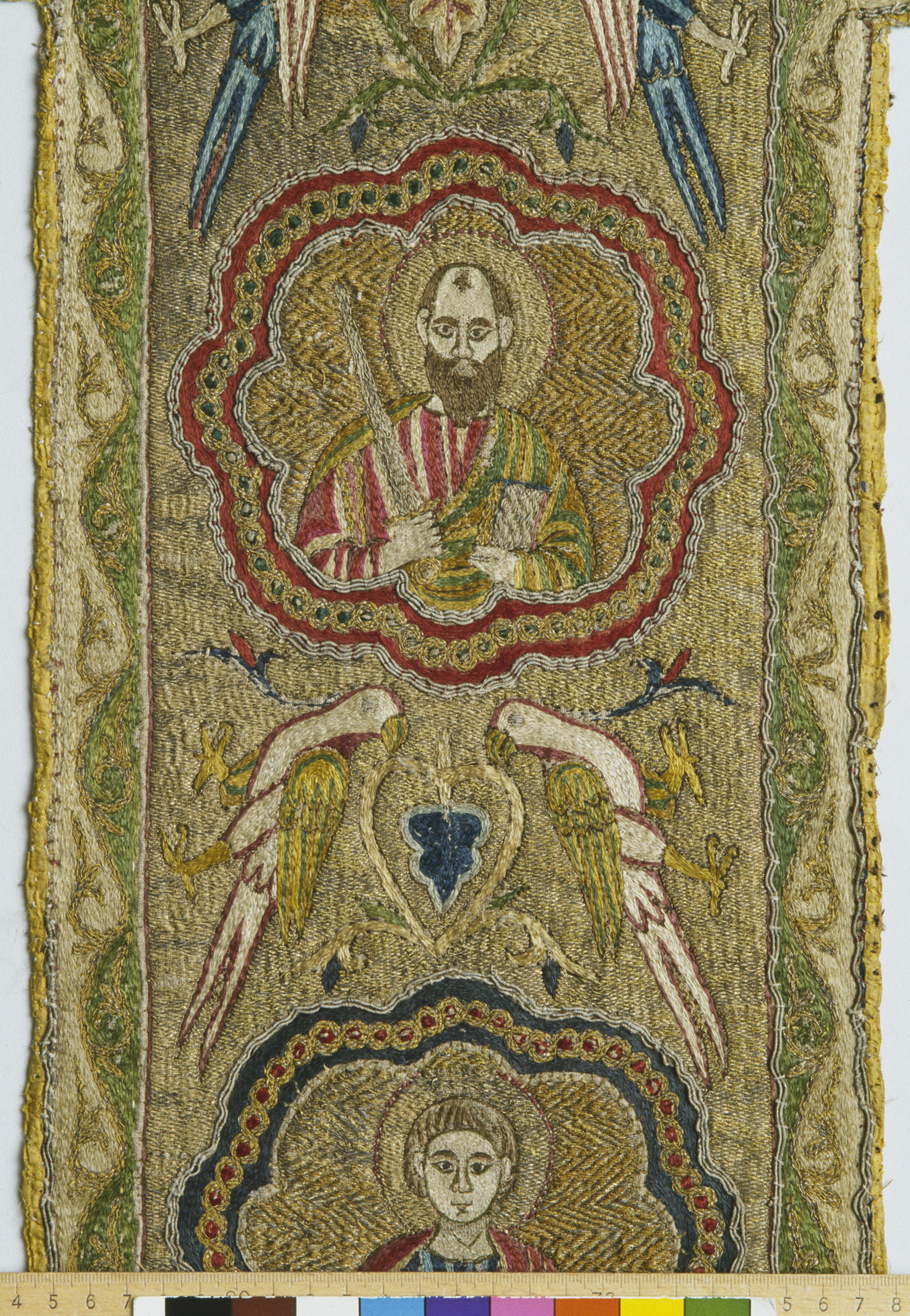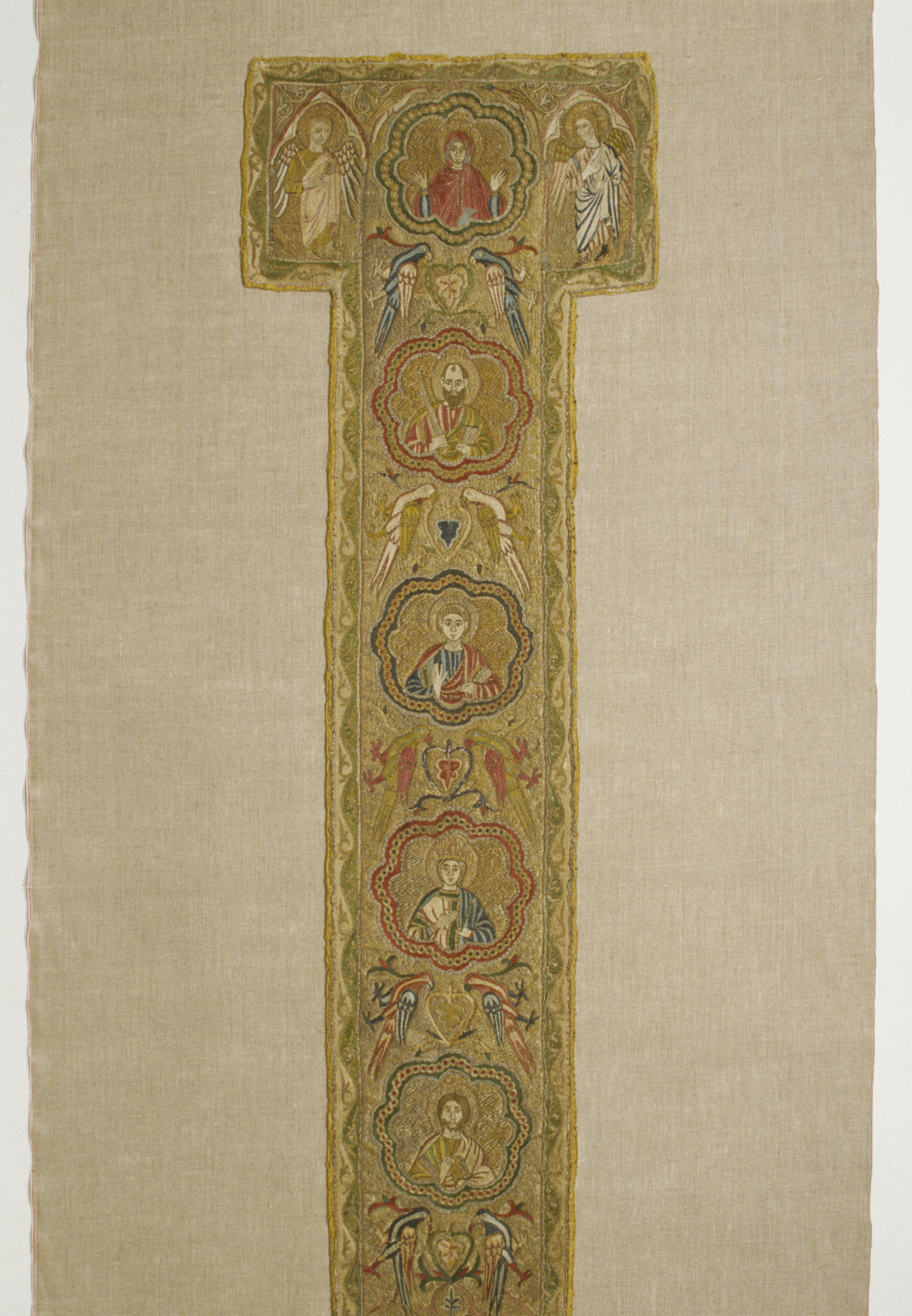Figurbroderi i guld och silke på lärft. Fem medaljonger med Maria, S. Paulus, apostel, kvinnligt helgon, apostel. Fåglar. Gult sidenfoder. Italienskt arbete. Deponerad 1926, (Utställd 1997) Korset kommer ursprungligen från Uppsala domkyrka. Bården som satt på den ursprungliga mässhaken finns i Uppsala domkyrkomuseum. Korset är ett italienskt arbete från 1200-talets slut med Maria, St Paulus, eventuellt Johannes evangelisten, ett krönt kvinnligt helgon och en apostel.