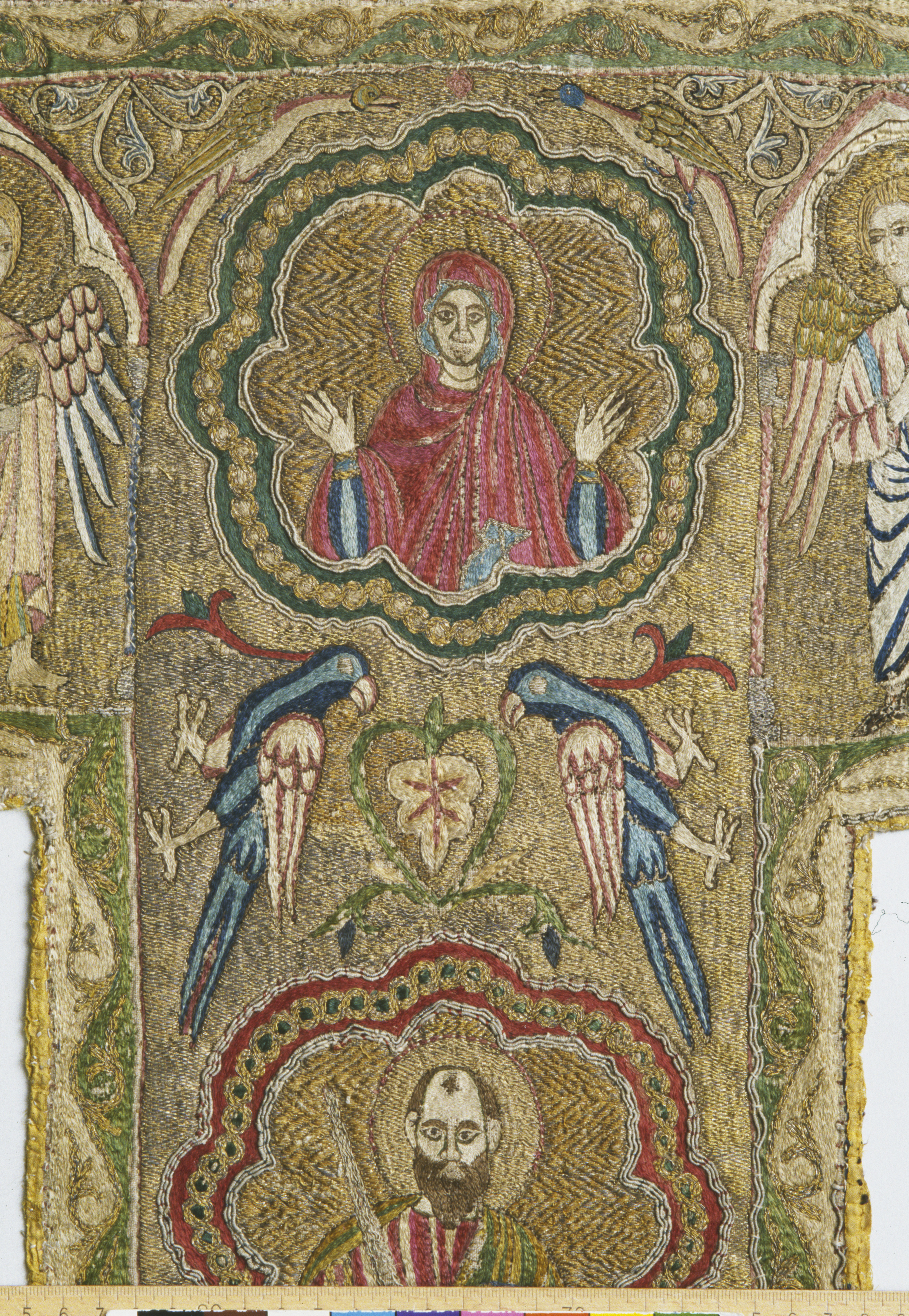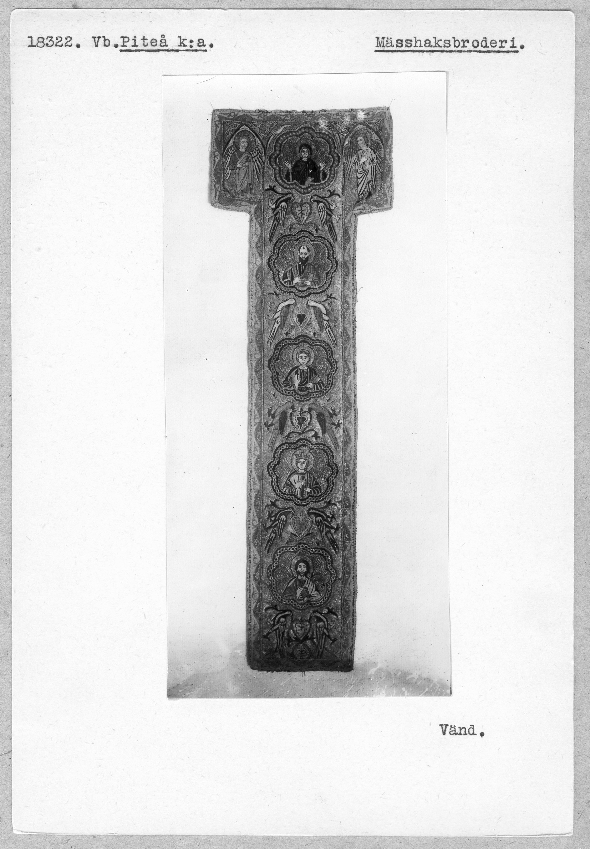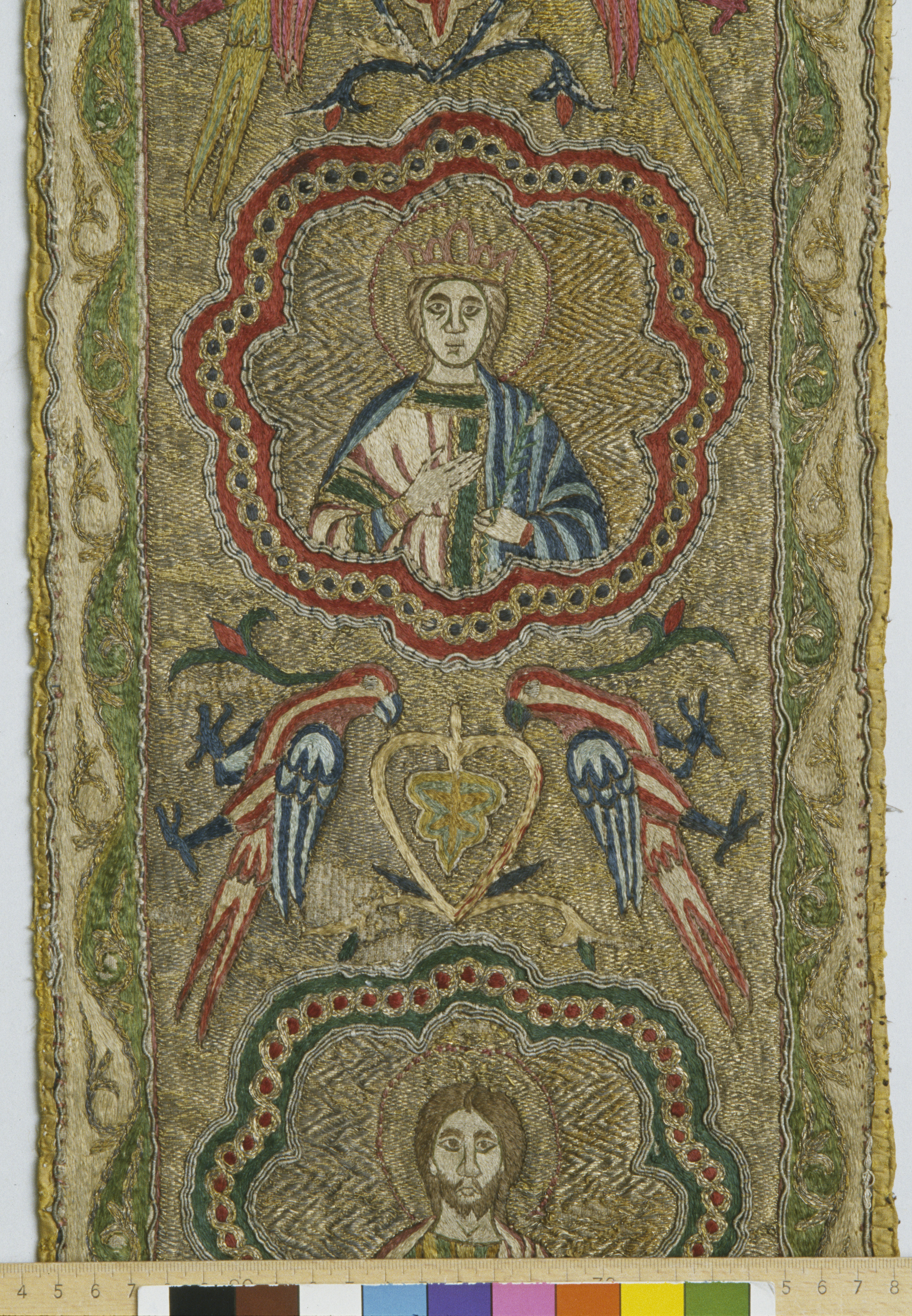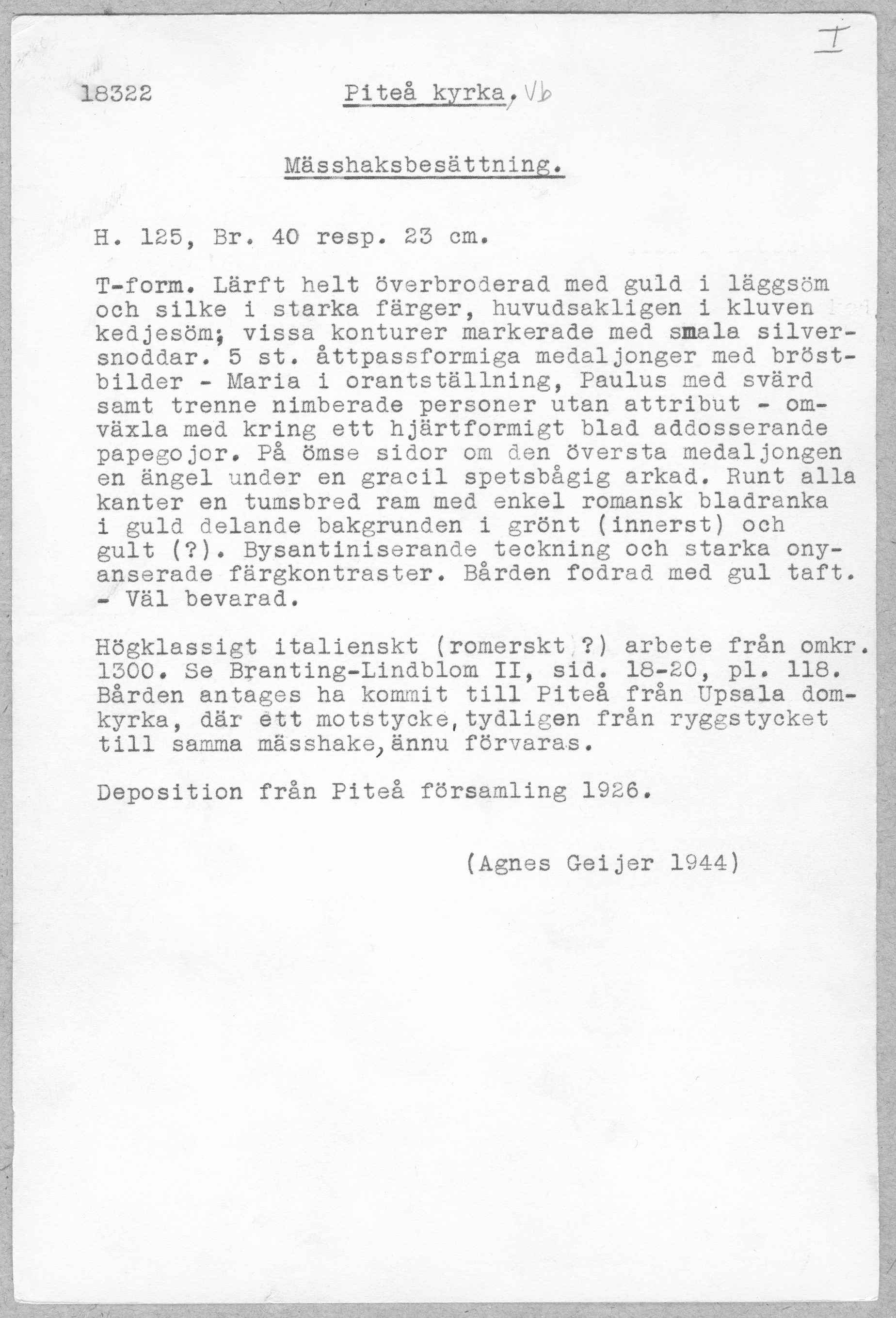 Figurbroderi i guld och silke på lärft. Fem medaljonger med Maria, S. Paulus, apostel, kvinnligt helgon, apostel. Fåglar. Gult sidenfoder. Italienskt arbete. Deponerad 1926, (Utställd 1997) Korset kommer ursprungligen från Uppsala domkyrka. Bården som satt på den ursprungliga mässhaken finns i Uppsala domkyrkomuseum. Korset är ett italienskt arbete från 1200-talets slut med Maria, St Paulus, eventuellt Johannes evangelisten, ett krönt kvinnligt helgon och en apostel.