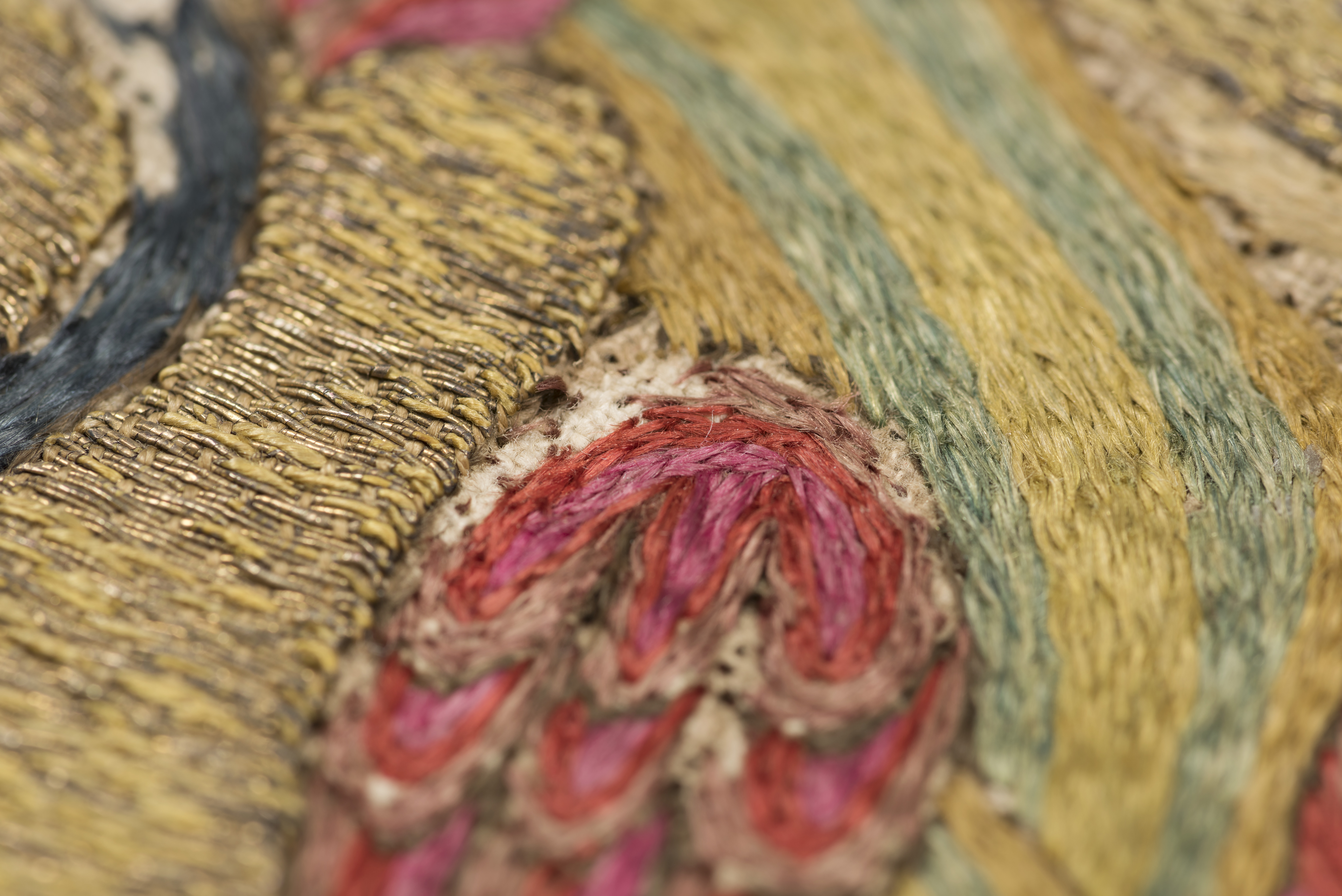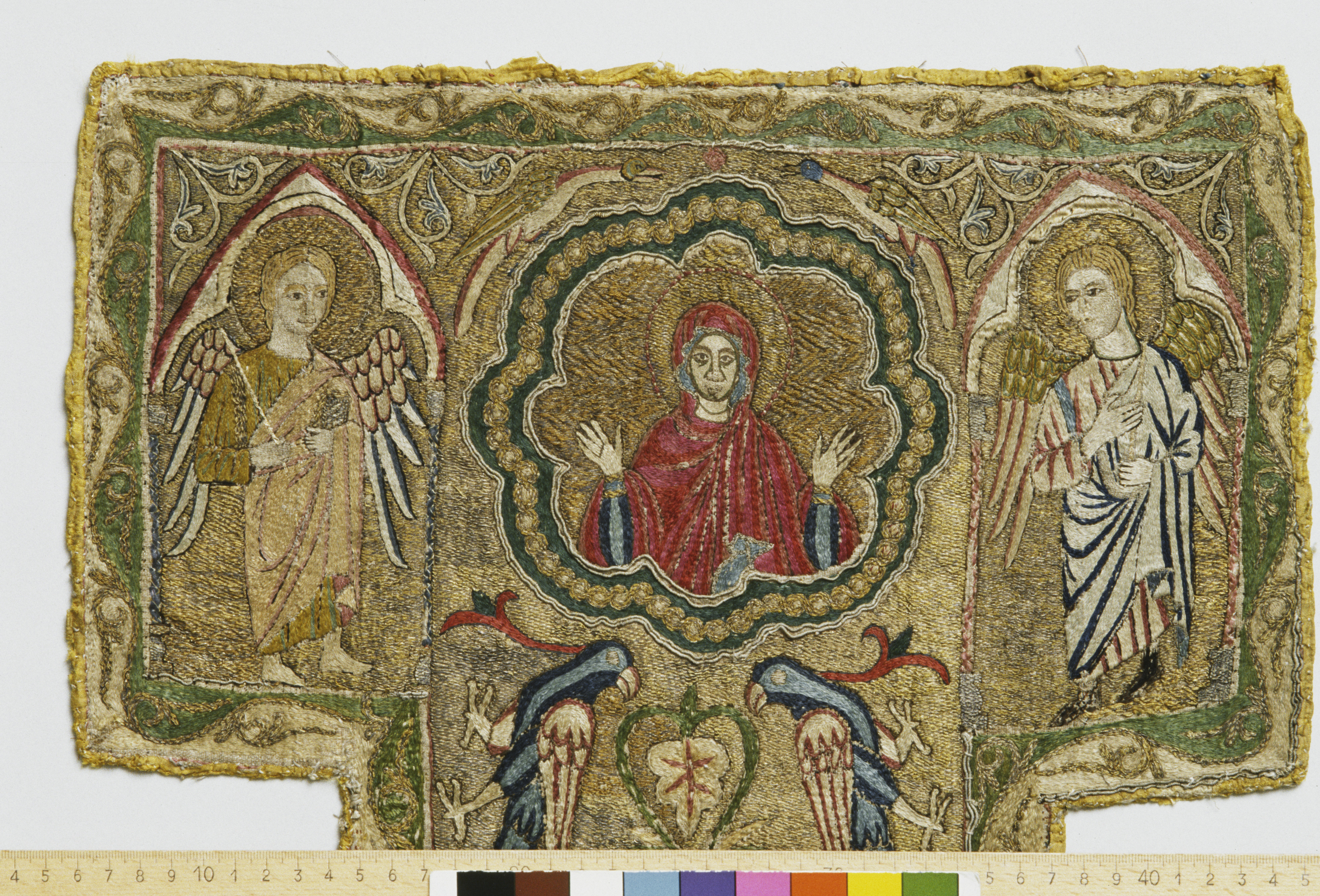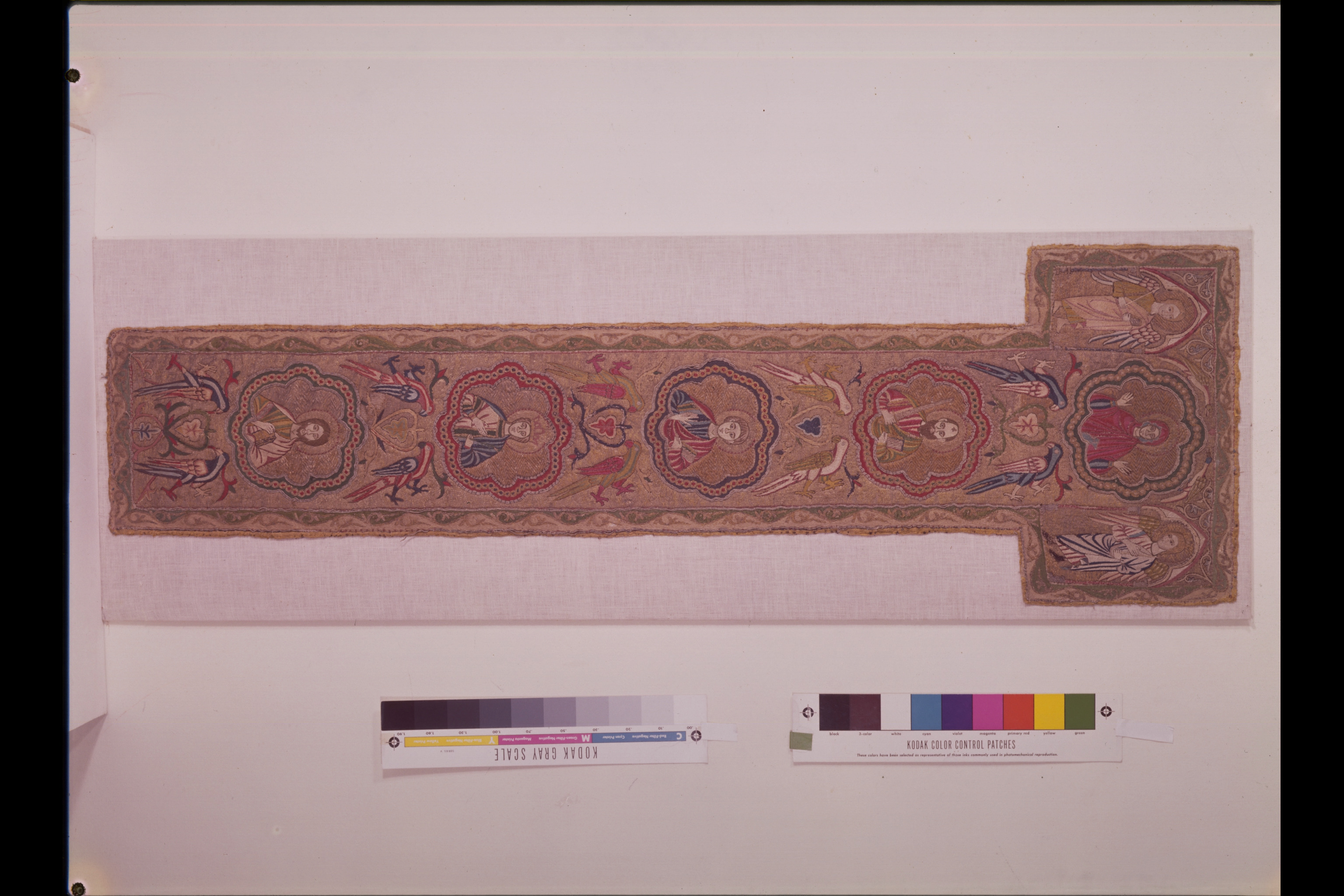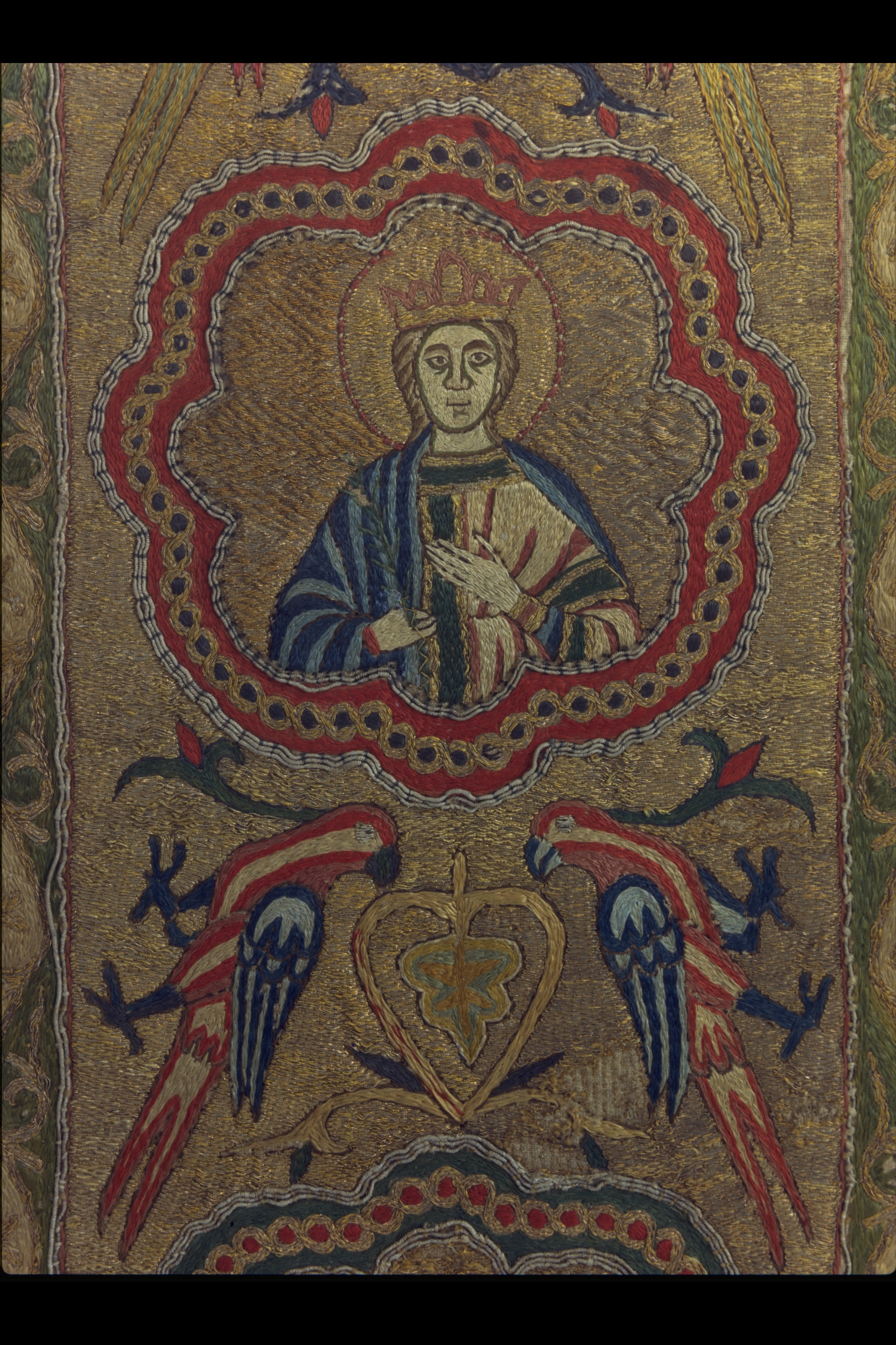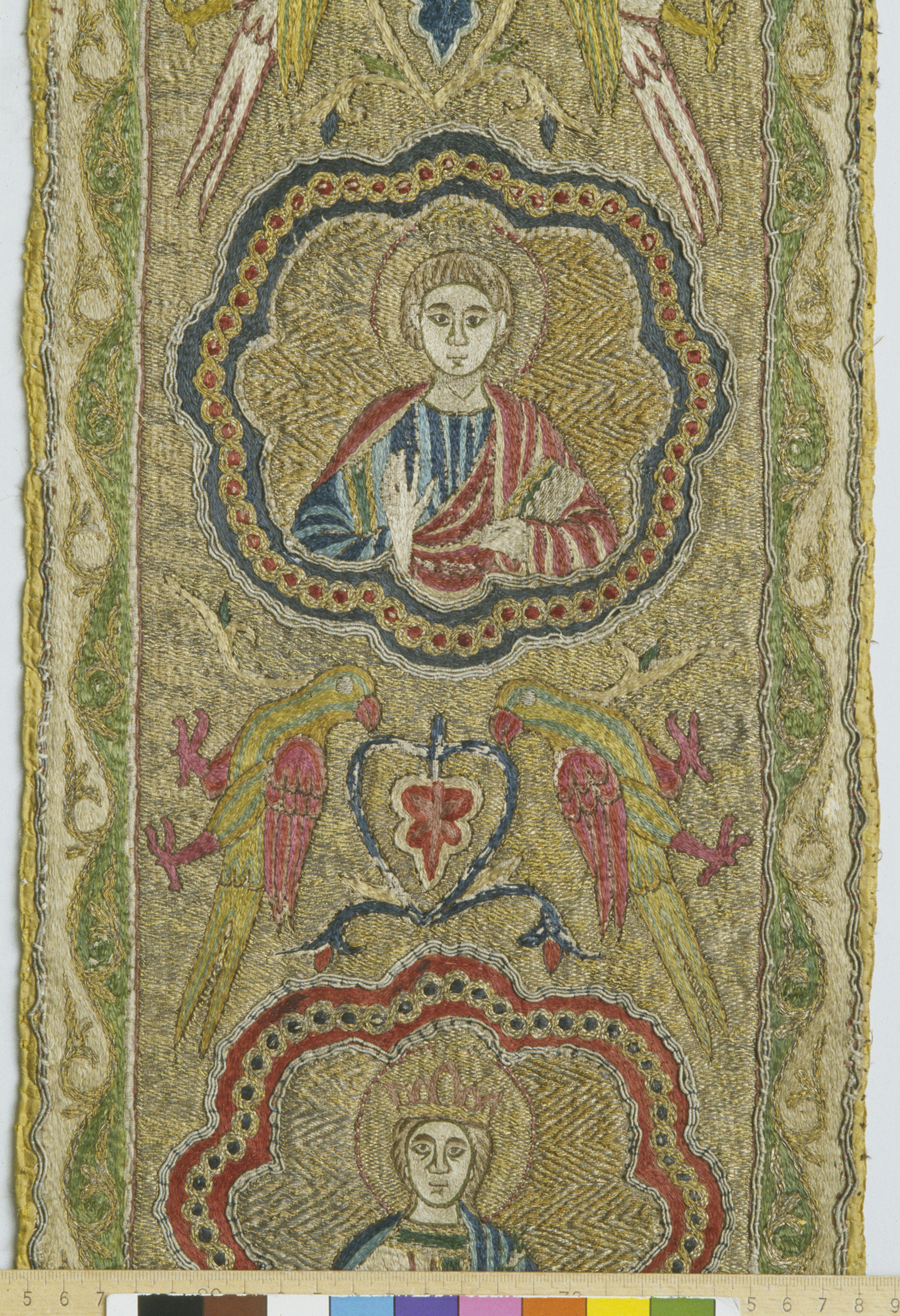 Figurbroderi i guld och silke på lärft. Fem medaljonger med Maria, S. Paulus, apostel, kvinnligt helgon, apostel. Fåglar. Gult sidenfoder. Italienskt arbete. Deponerad 1926, (Utställd 1997) Korset kommer ursprungligen från Uppsala domkyrka. Bården som satt på den ursprungliga mässhaken finns i Uppsala domkyrkomuseum. Korset är ett italienskt arbete från 1200-talets slut med Maria, St Paulus, eventuellt Johannes evangelisten, ett krönt kvinnligt helgon och en apostel.