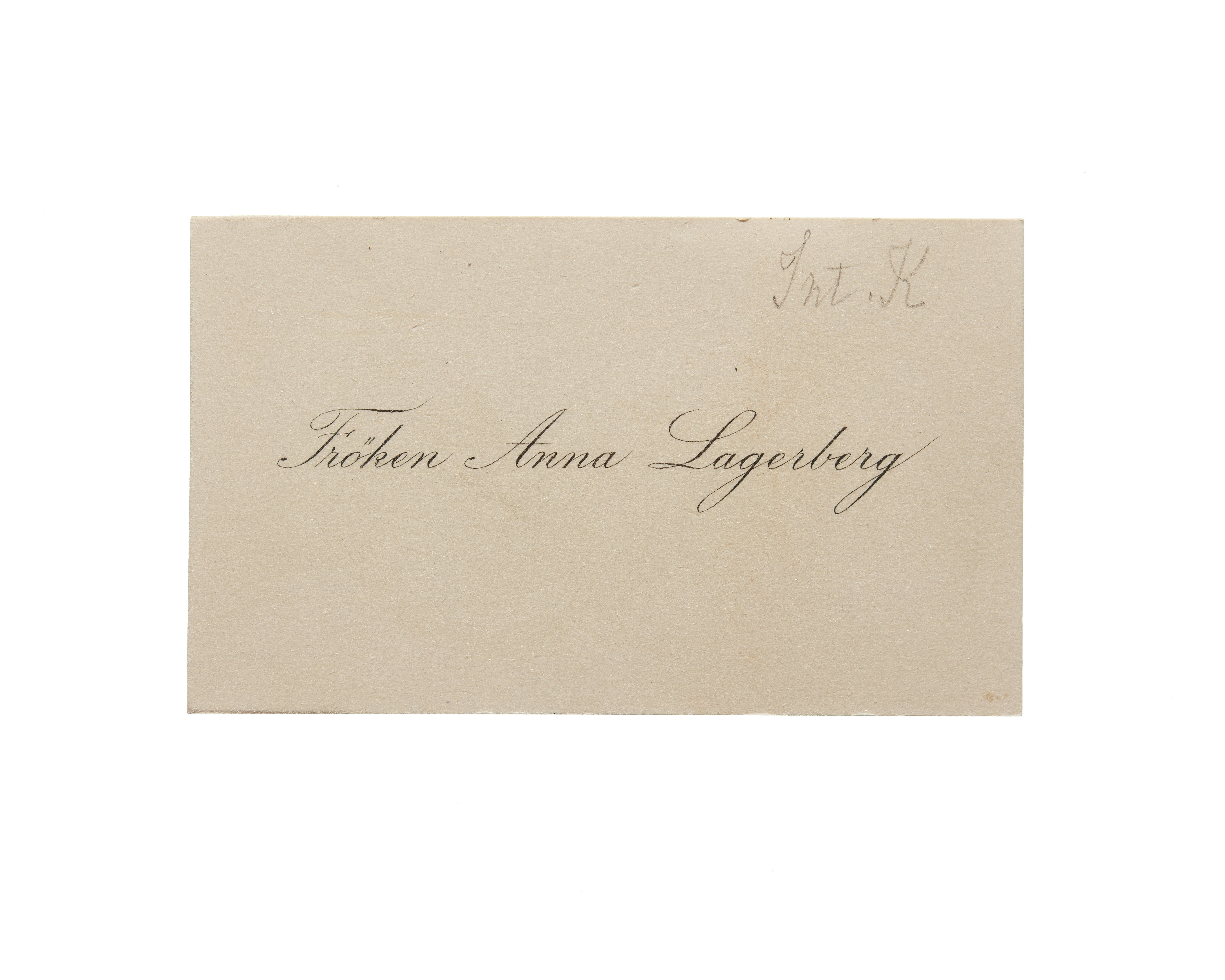 Ett visitkort från Fröken Anna Lagerberg, daterat 1911. Överlämnat i samband med Internationella kvinnoförbundets kongress i Stockholm 1911.