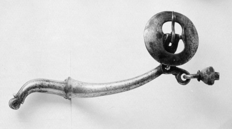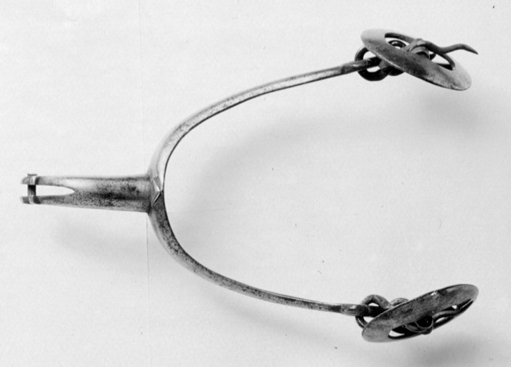 Sporre av förtent stål med u-formade skänklar och 45 mm lång nedåtböjd hals. Vid skänklarnas båda ytterändar stor rund remsölja med bred kant samt hake (får hålfotsrem).