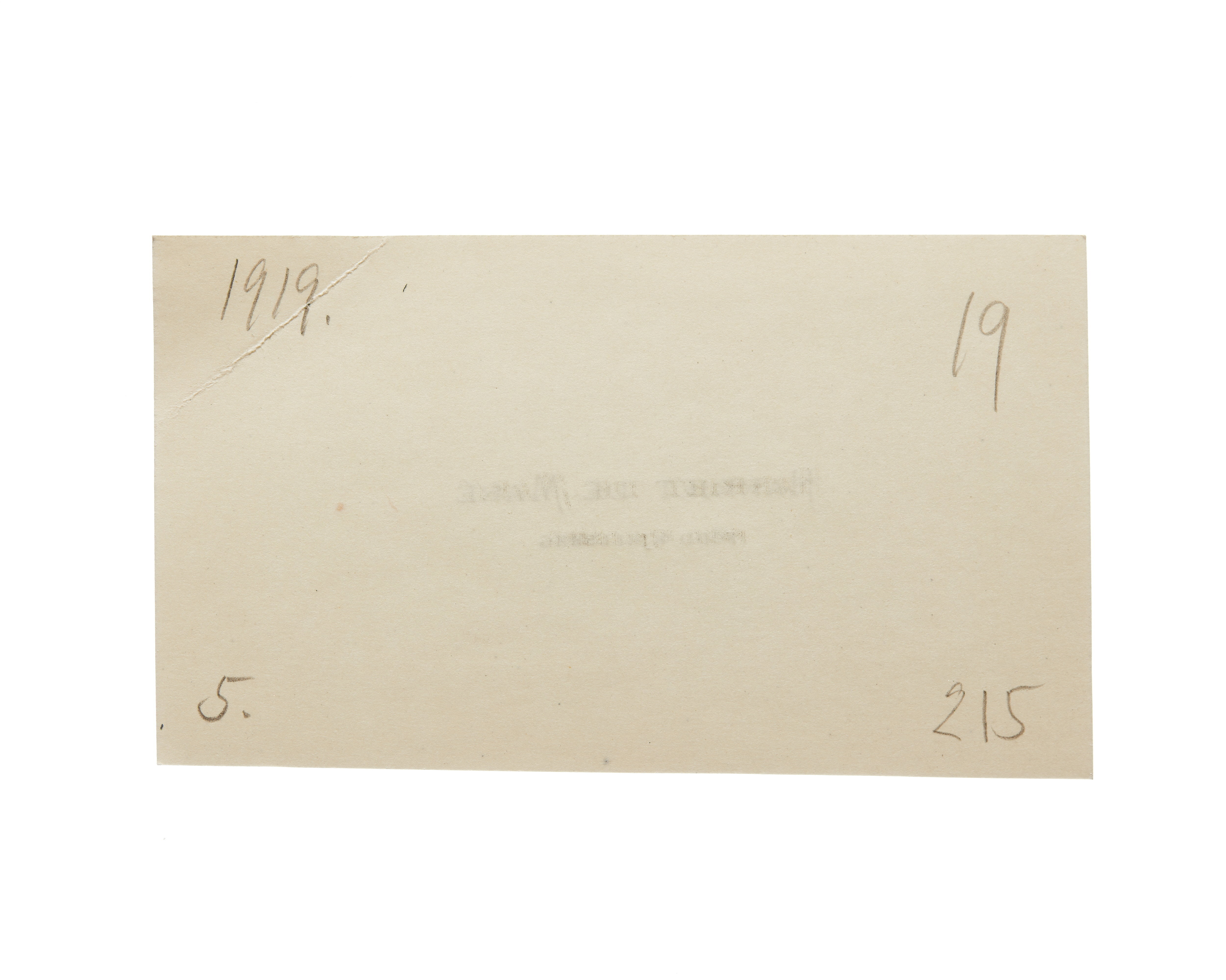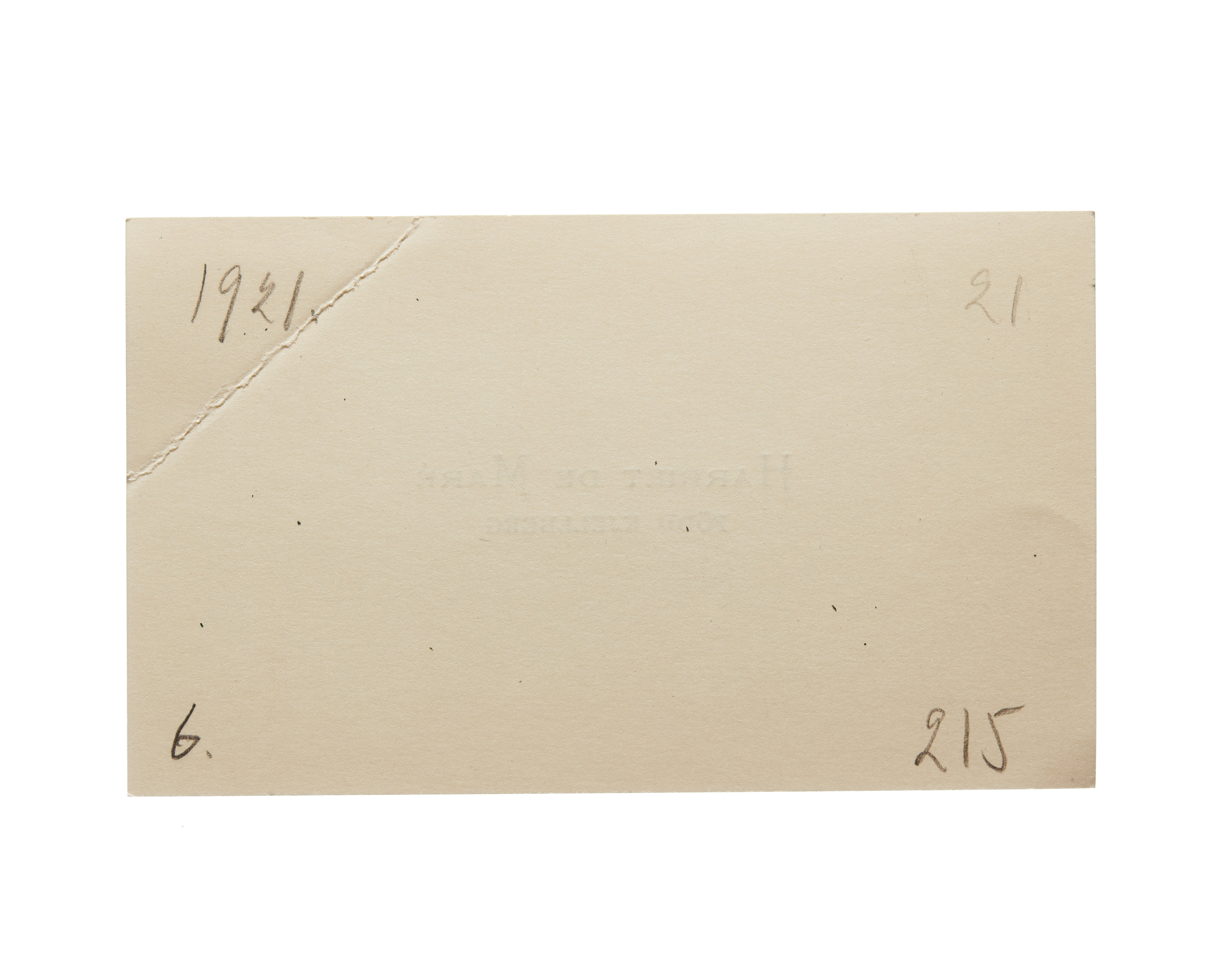 Sex visitkort från Harriet de Mare f. Kjellberg. Första kortet är utan datum, vikt i övre högra hörnet. Andra kortet daterat 1916, vikt i övre högra hörnet. Tredje kortet daterat 1916, vikt i övre högra hörnet. Fjärde kortet daterat 1919, vikt i övre högra hörnet. Femte kortet daterat 1919, vikt i övre högra hörnet. Sjätte kortet daterat 1921, vikt i övre högra hörnet.