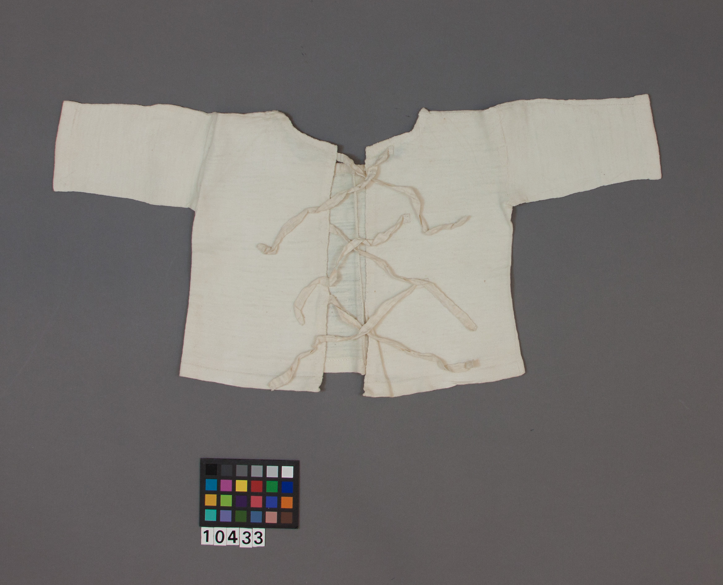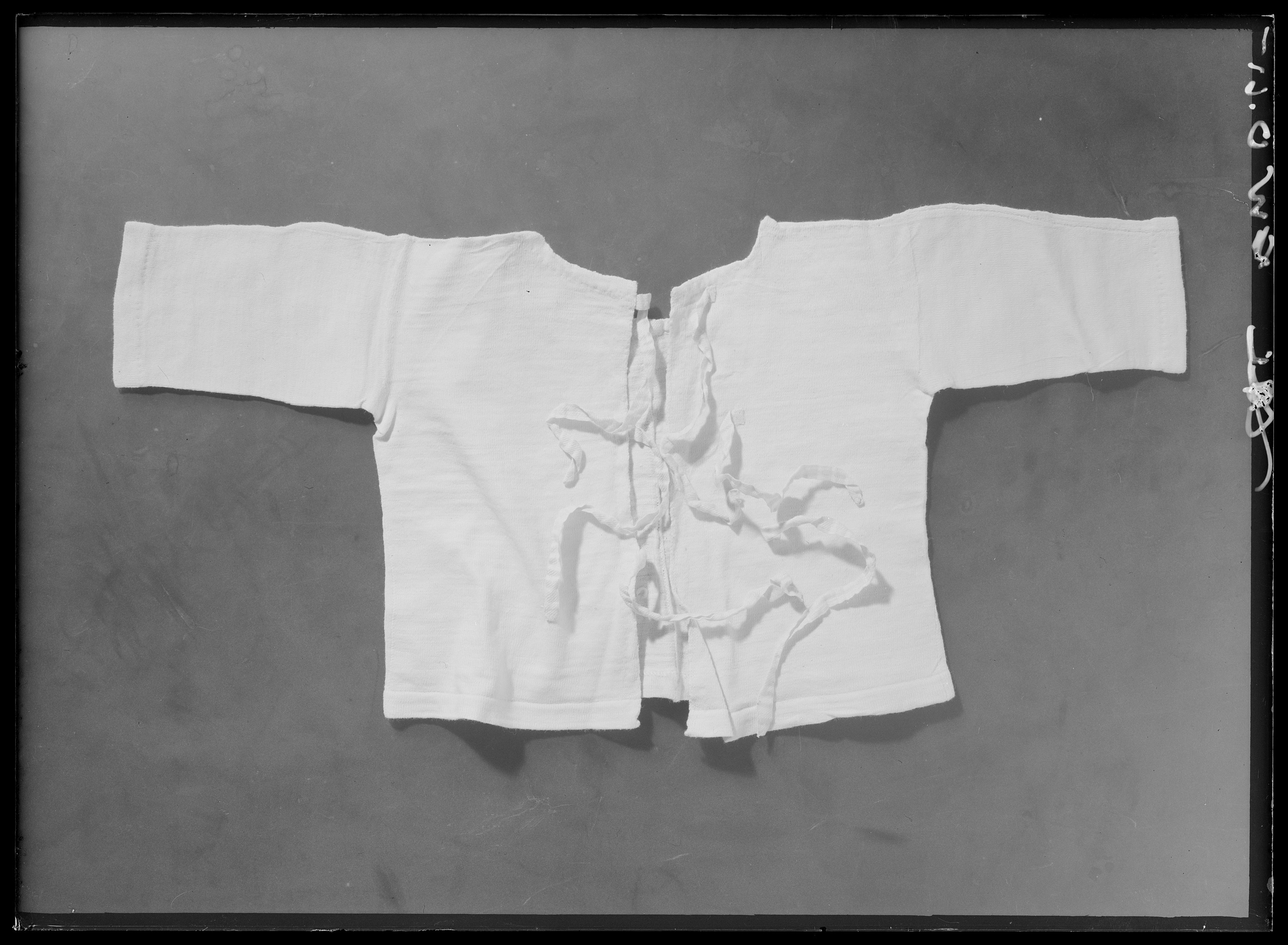 Plagg ingående i en korg med babykläder som använts av Sofia och Oskar (II):s barn. Babytröja av vit bomullstrikå med stickskarv mitt bak och på axlarna. Framtill 3 par bomullsband för knytning. Banden veckade. Inkantning runt halsen och fram med bumullsband. H: 240 mm, b: 500 mm